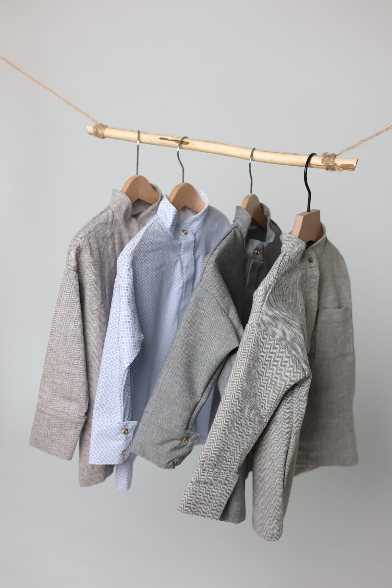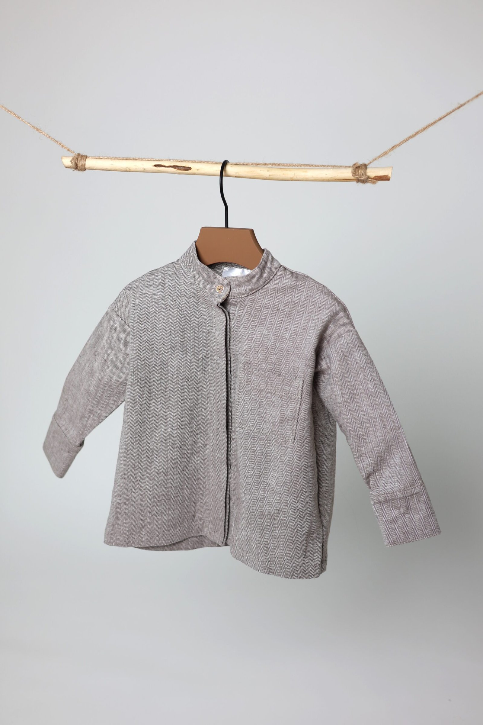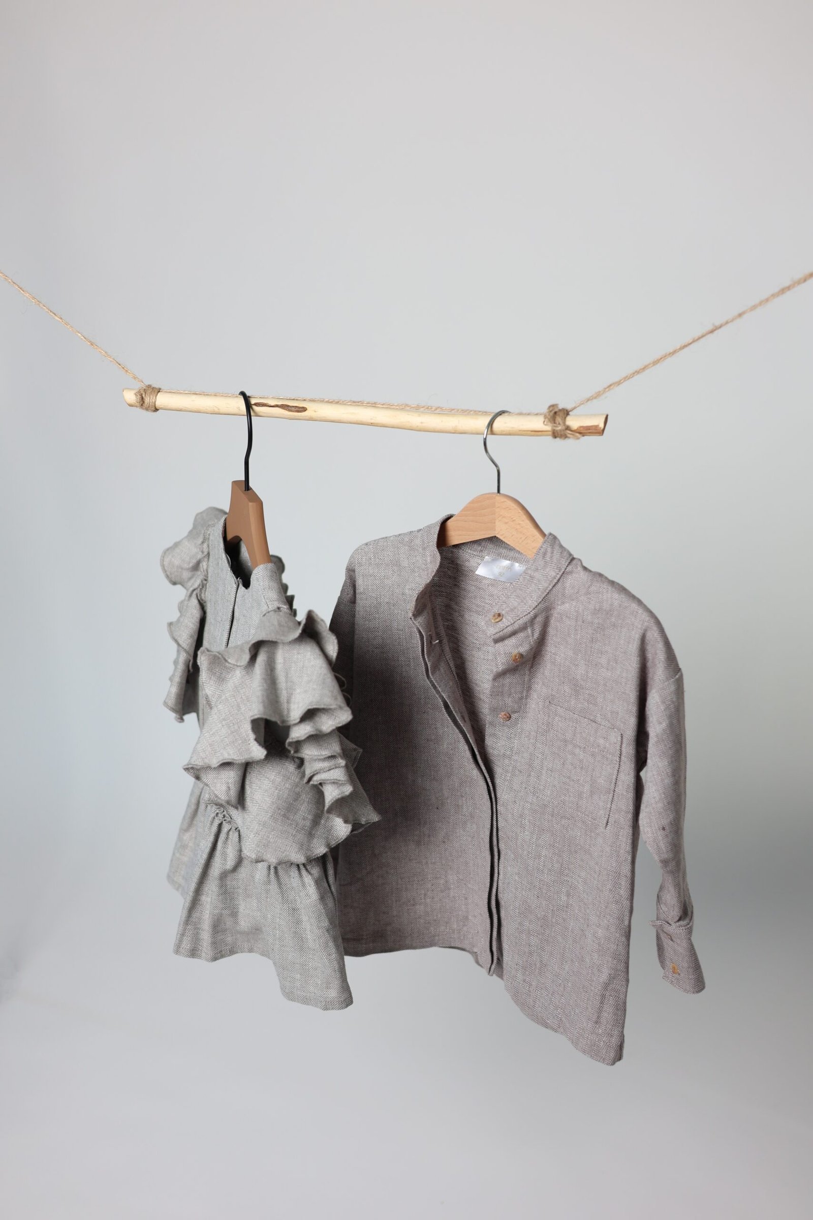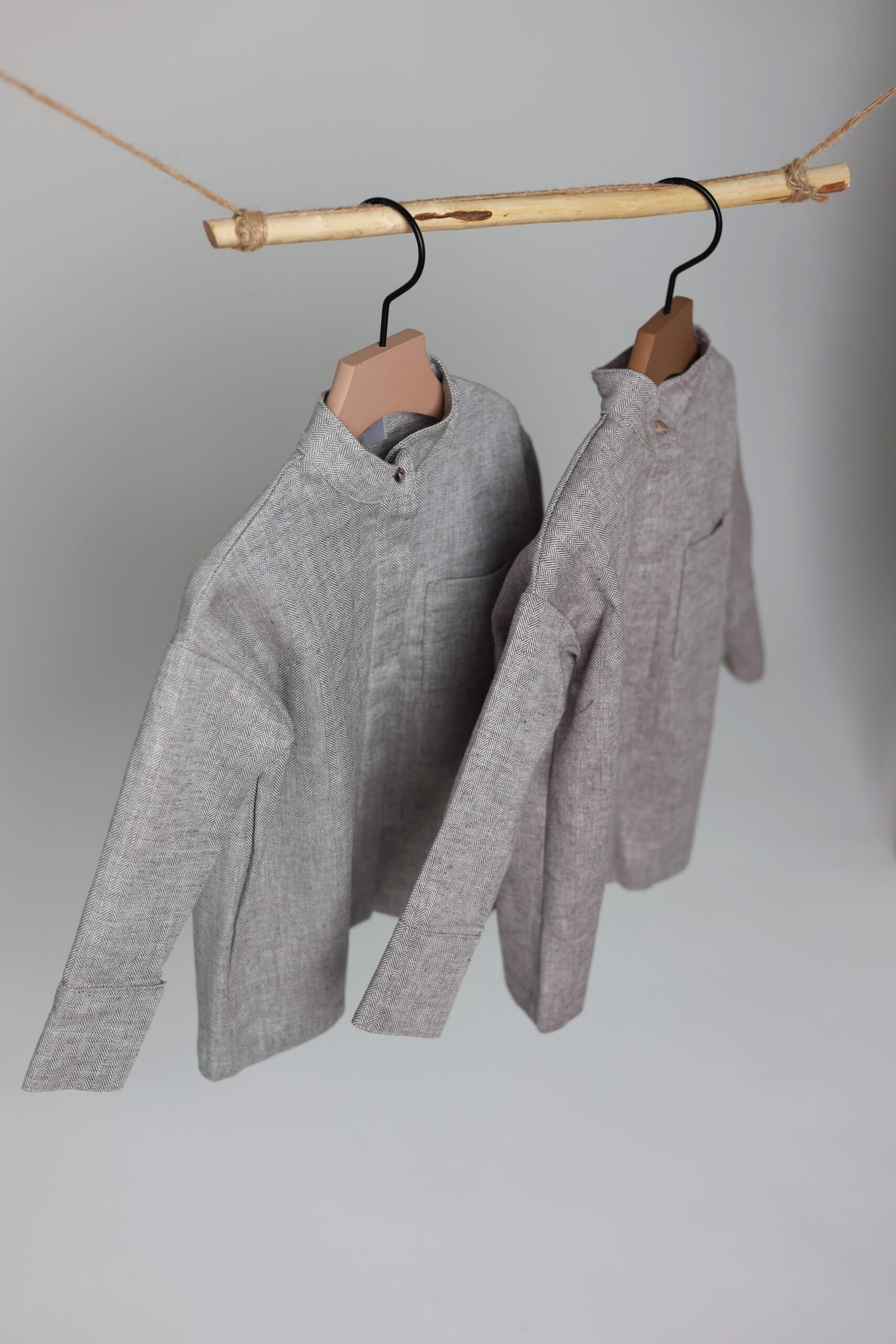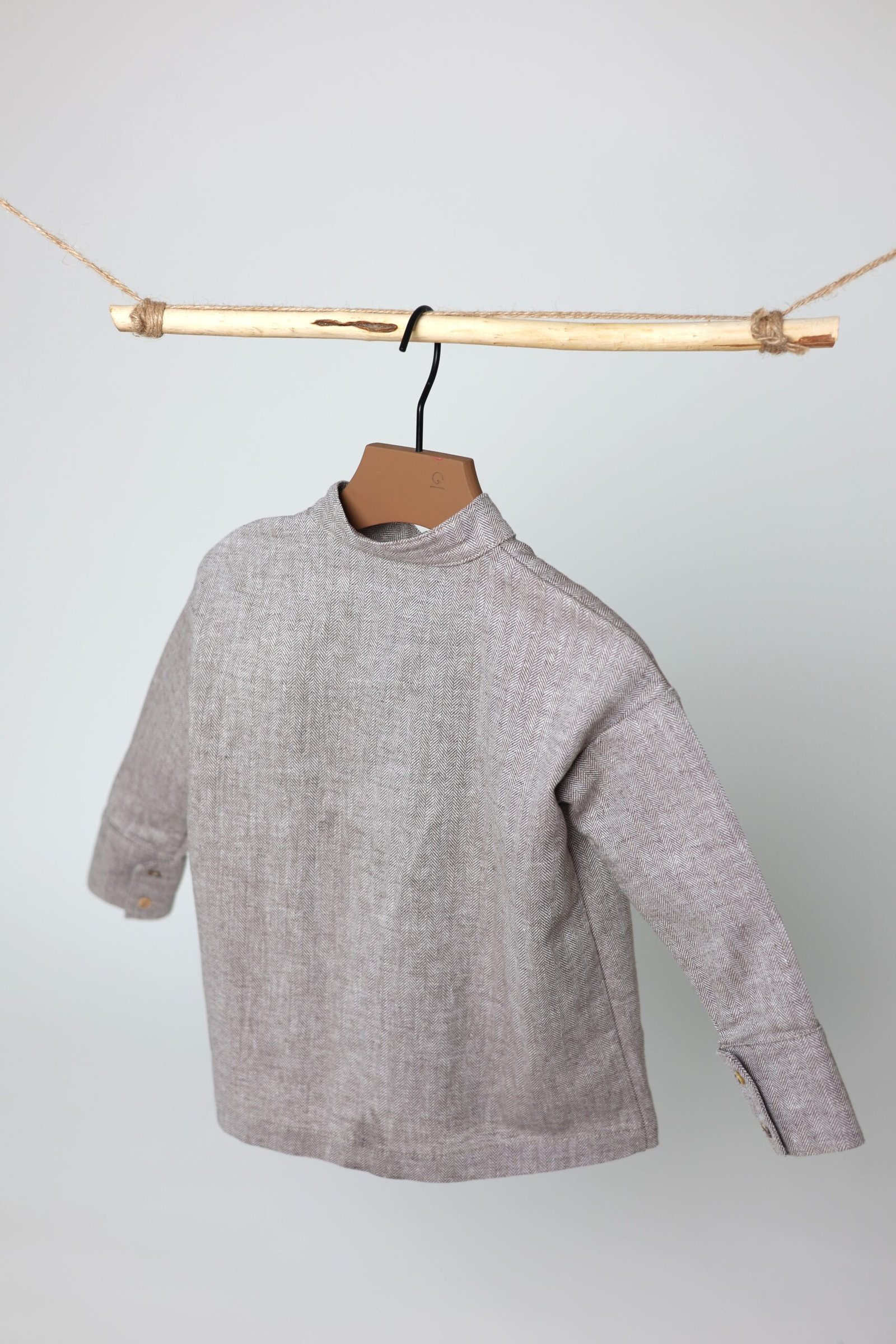 Minimalistinio rašto, lino ir medvilnės audinio marškiniai tinkami tiek mergaitėms, tiek berniukams. Šiek tiek ilginti, rankovės gali būti palenkiamos. Klasikinio dizaino, su pakelta apykakle ir kišenėle. Tiesaus modelio, puikiai tiks nešioti ir sukištus, ir ant viršaus. Segami paslėptu užsegimu, matoma tik viršutinė sagutė, rankovės segamos dvieiliu užsegimu.