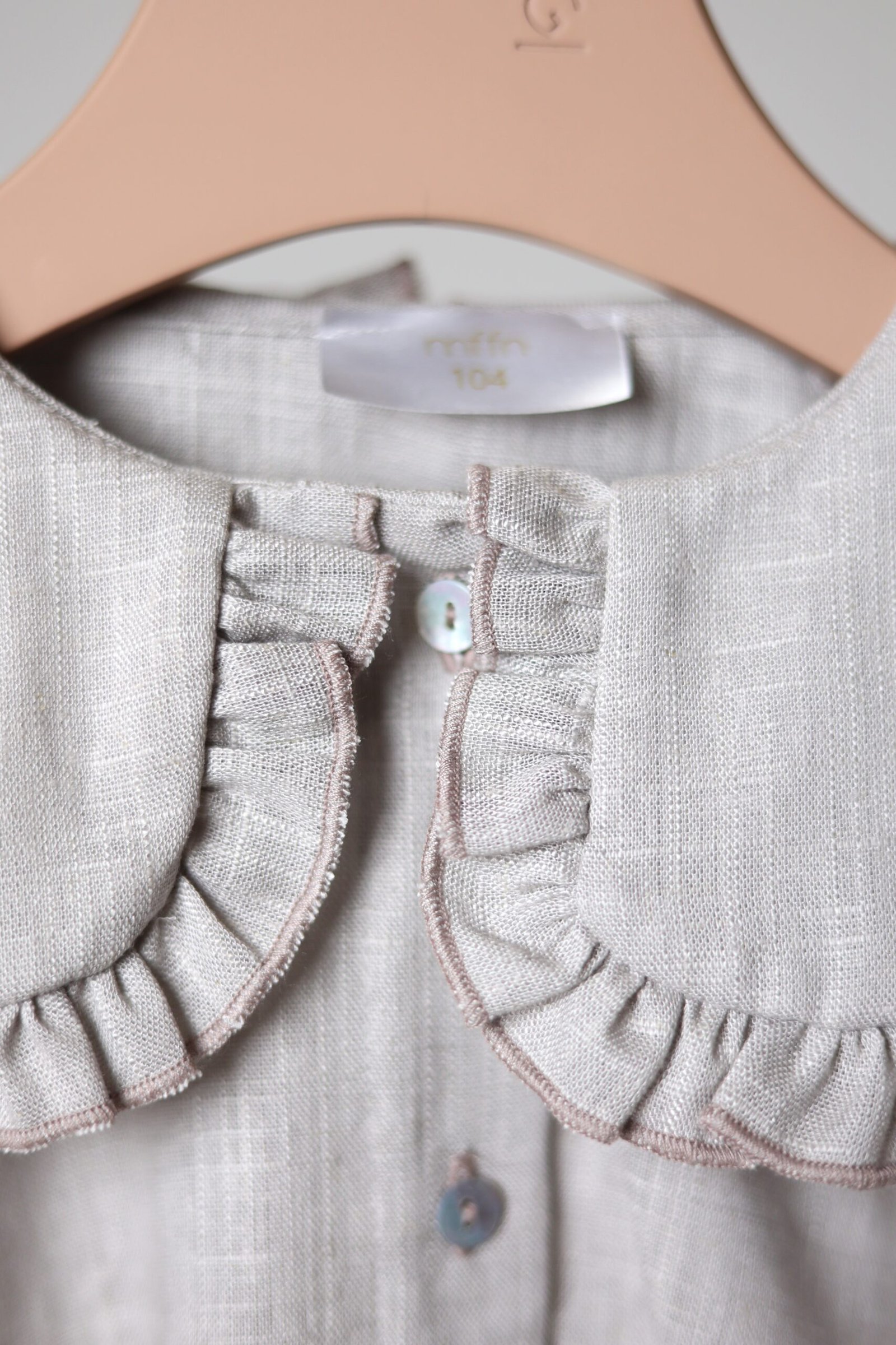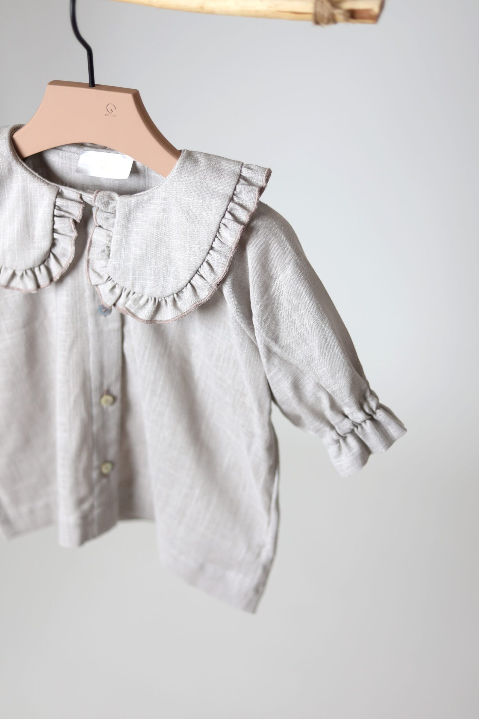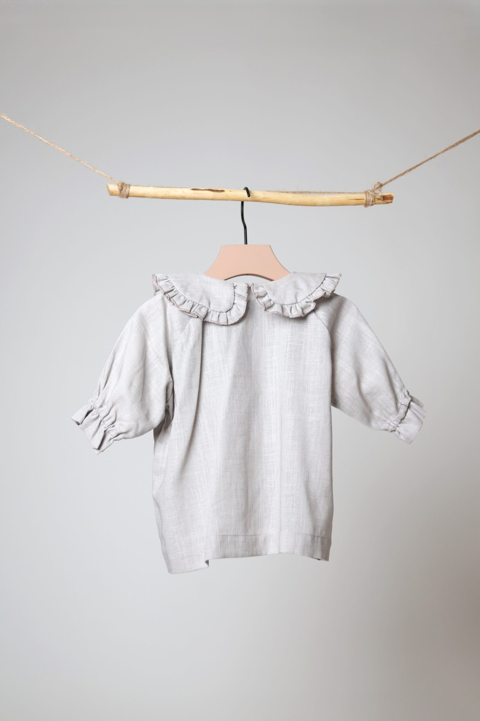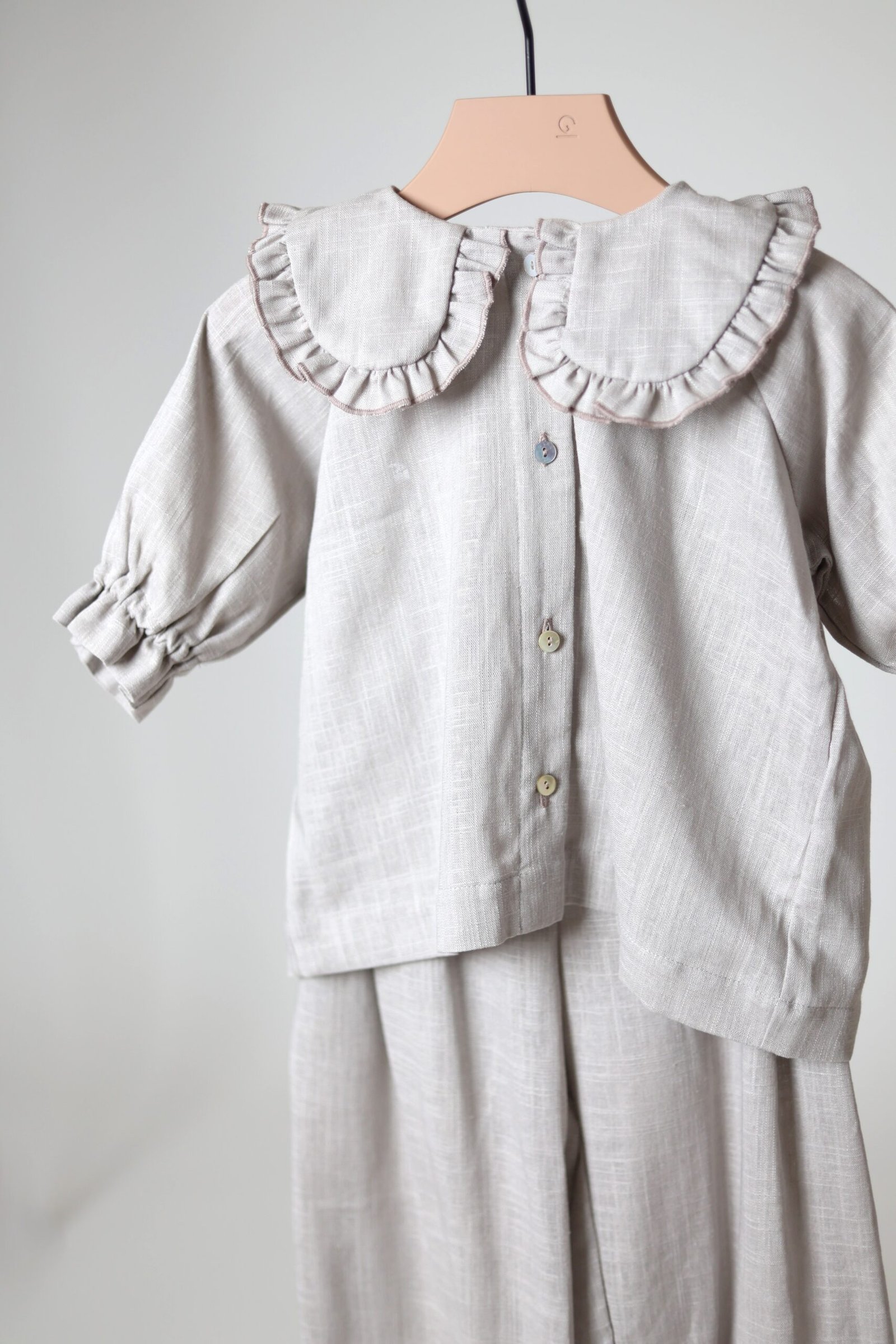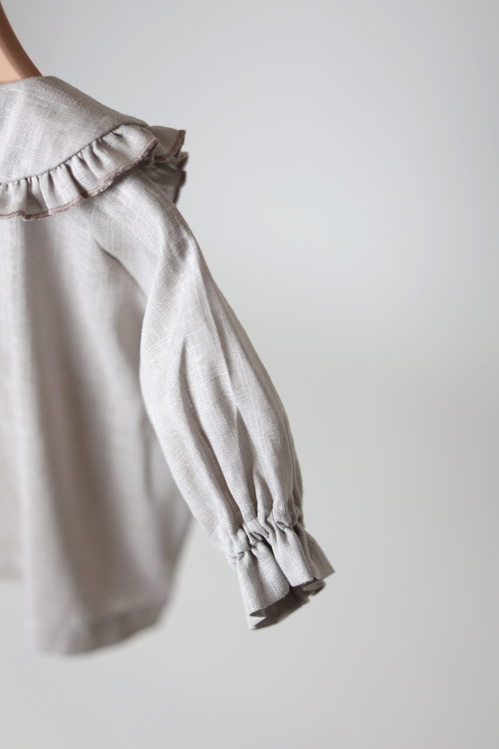 Lengvo ir švelnaus lino, platesnio modelio marškiniai. Akcentas – raukinukų apykaklė iš abiejų pusių, Rankovės ne pilno ilgio, su gumele ir raukinukais galuose.
