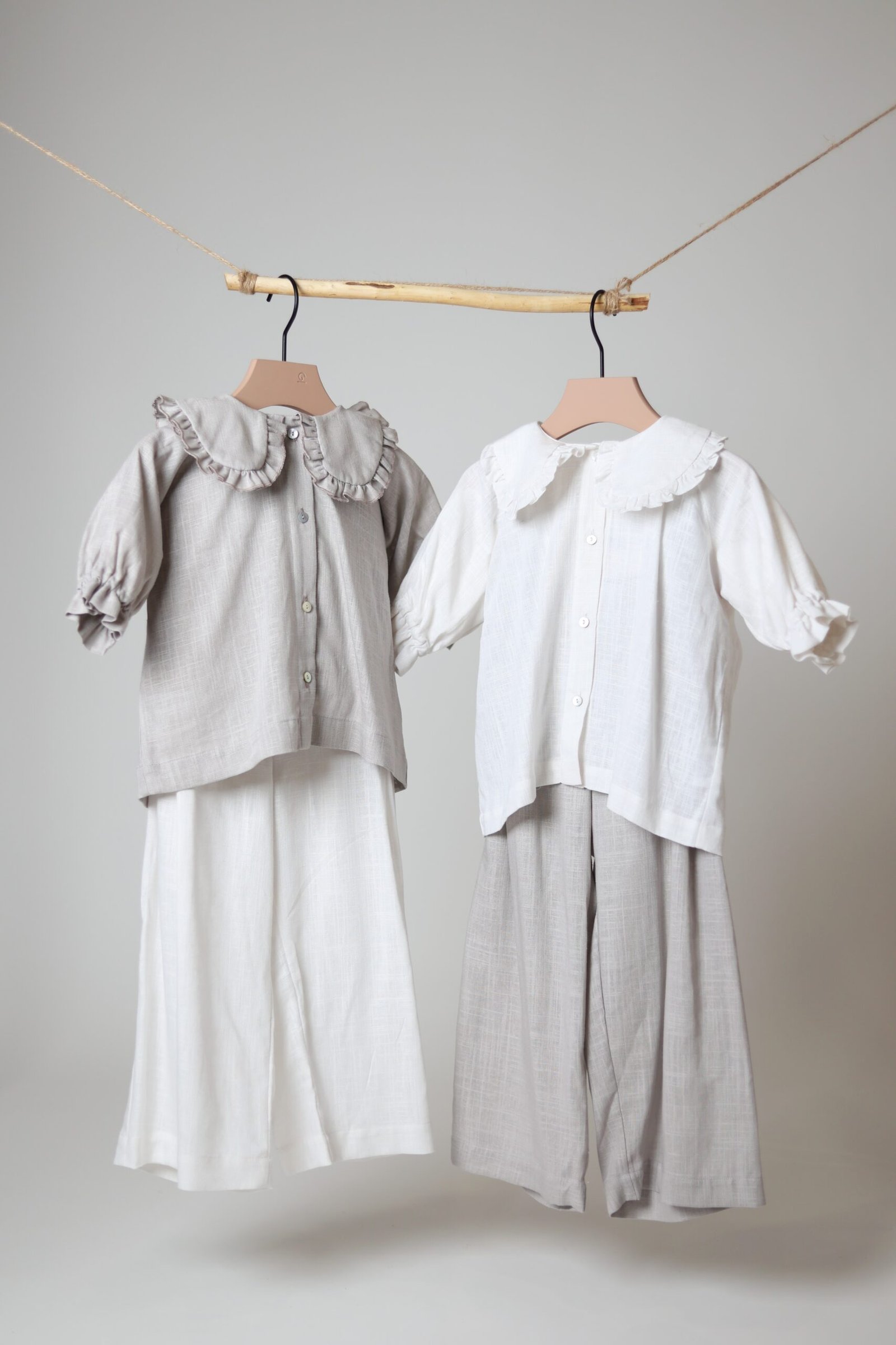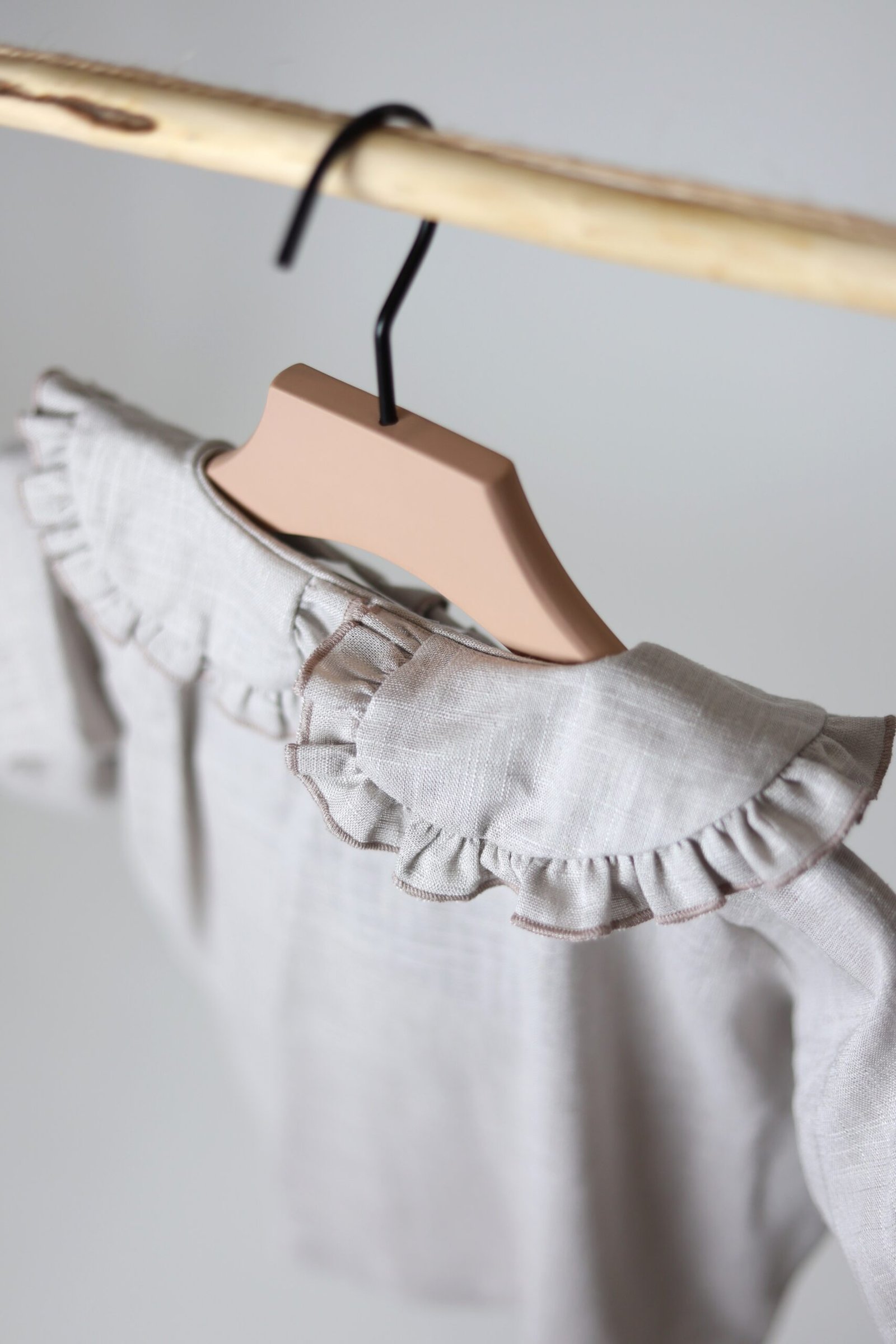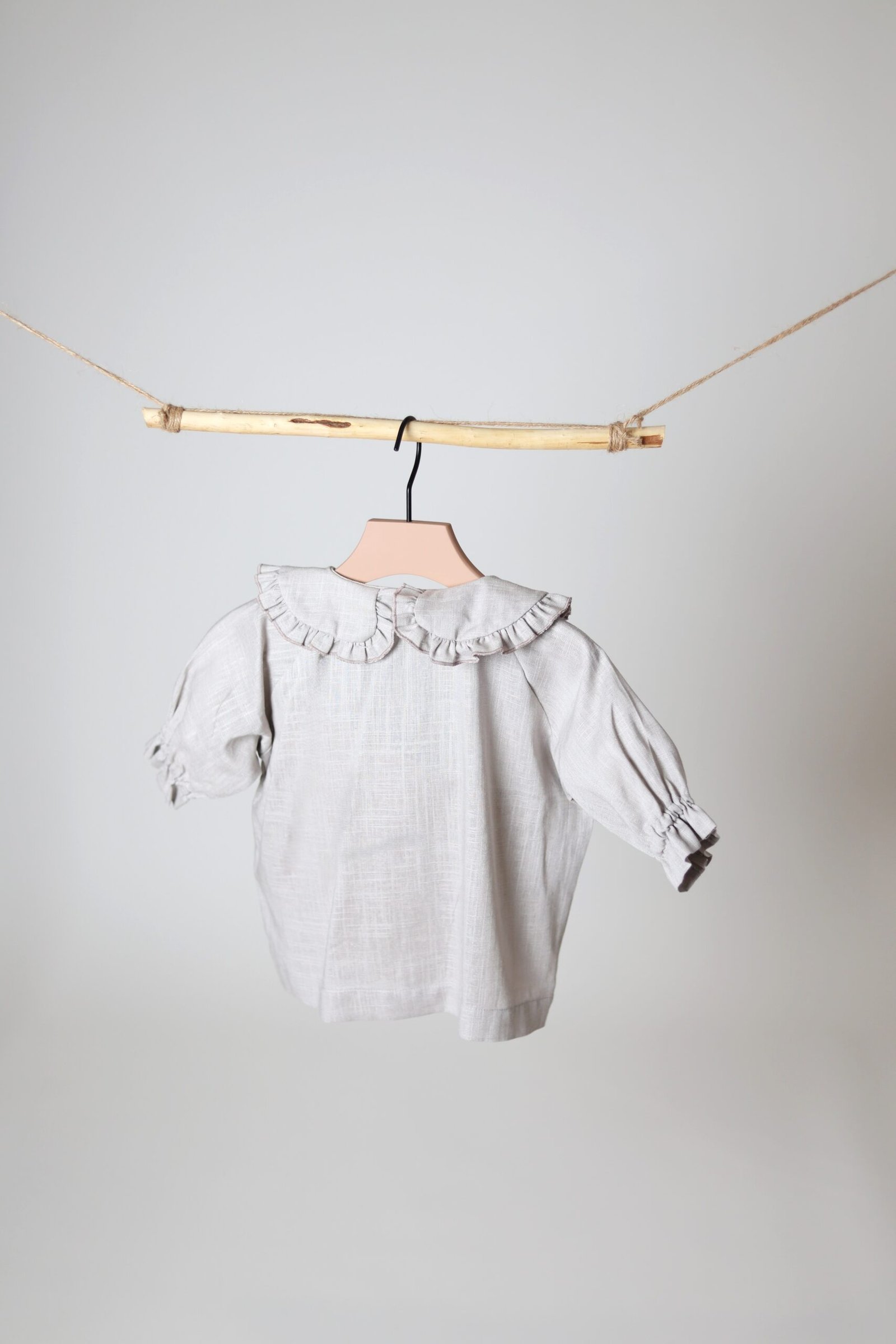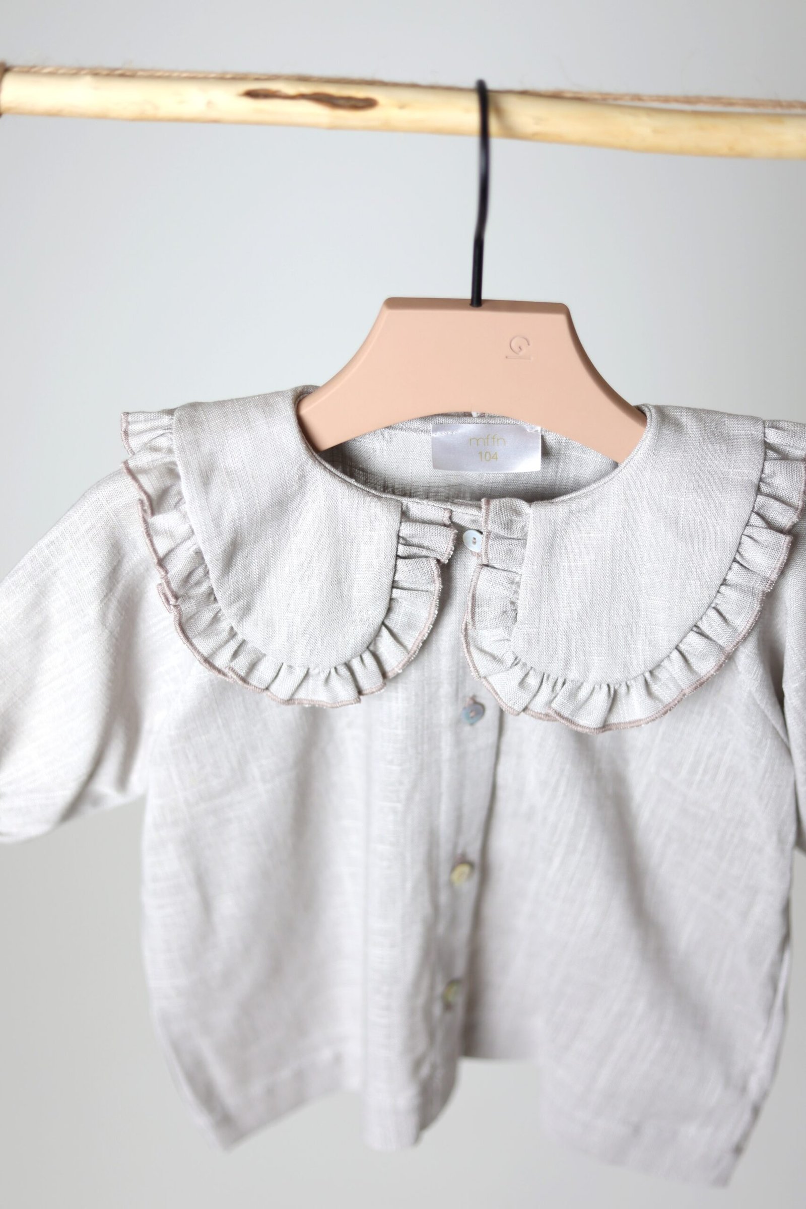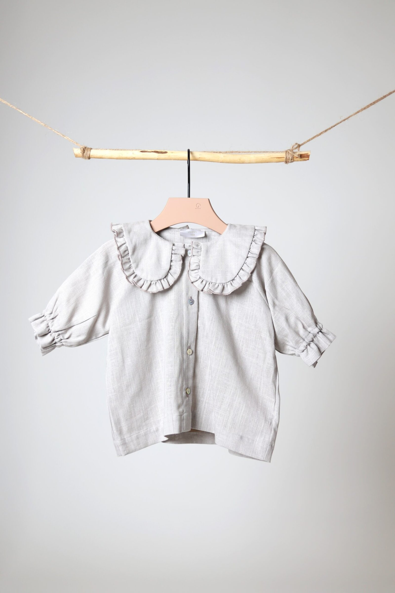 Lengvo ir švelnaus lino, platesnio modelio marškiniai. Akcentas – raukinukų apykaklė iš abiejų pusių, Rankovės ne pilno ilgio, su gumele ir raukinukais galuose.