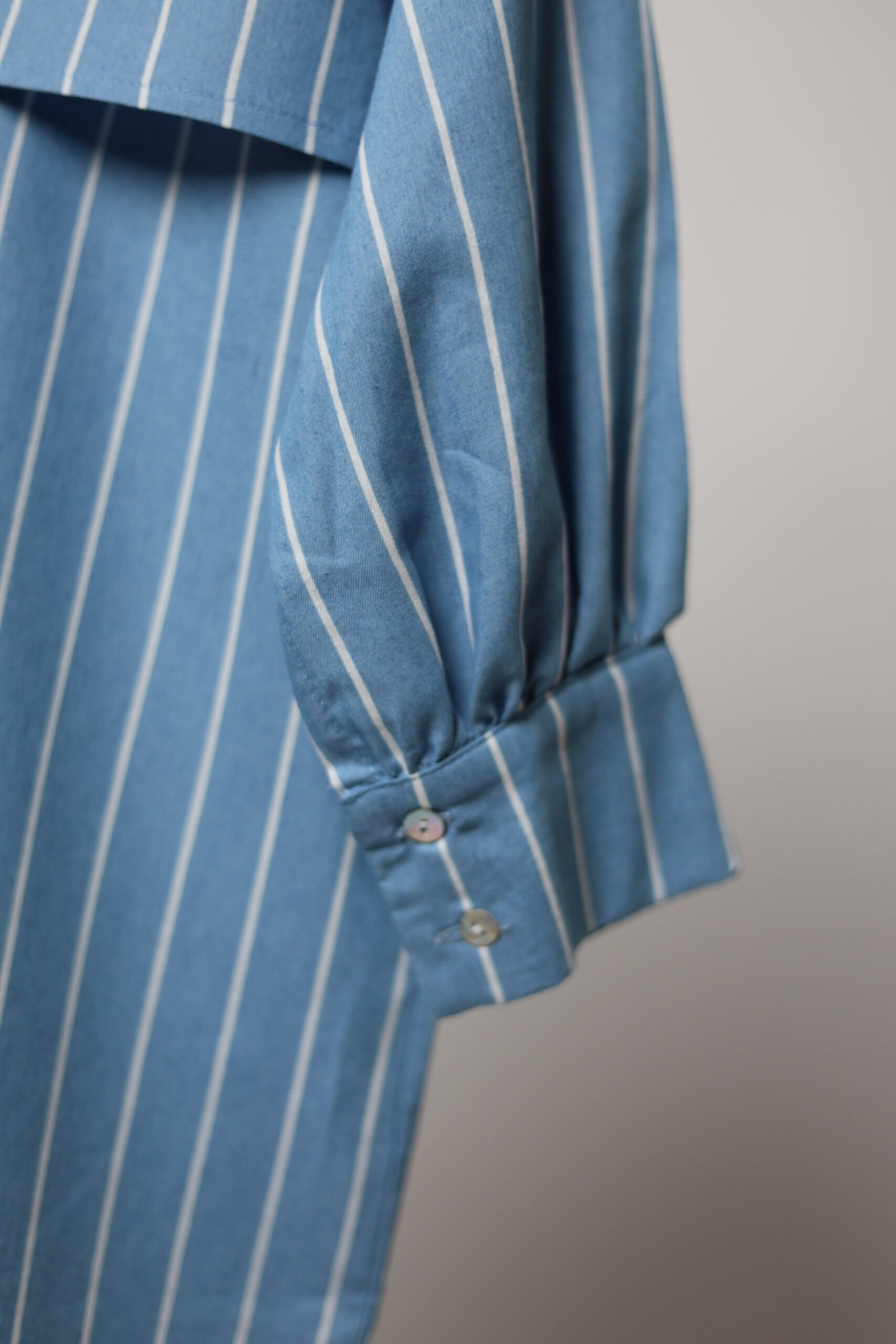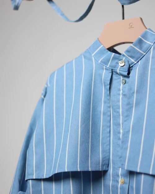Marškinių tipo suknelė su laisvai krintančiomis dekoracijomis priekyje bei nugaroje. Juosiama įveriamu dirželiu. Dvieilis rankogalių užsegimas, kiek pūstenės rankovės.