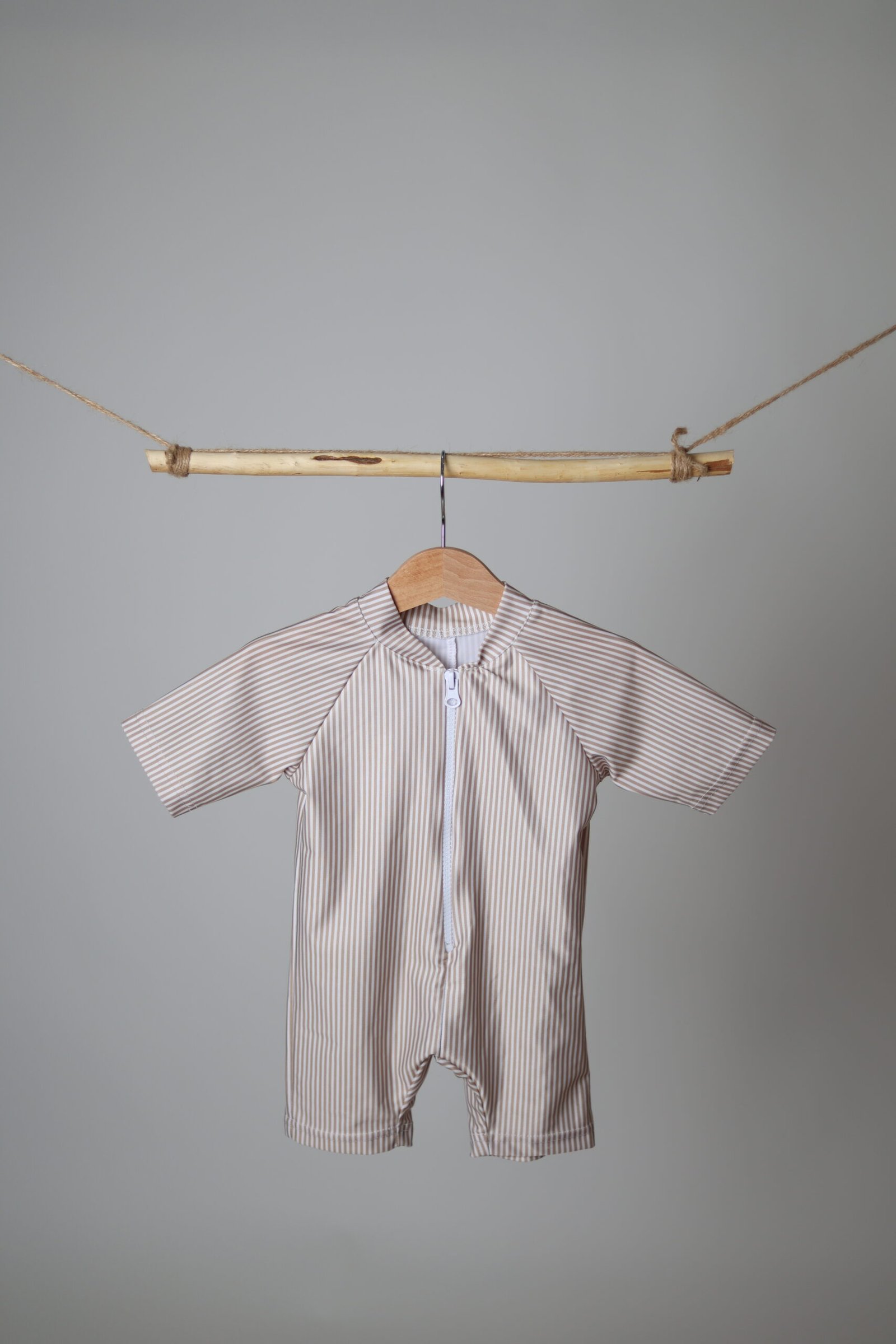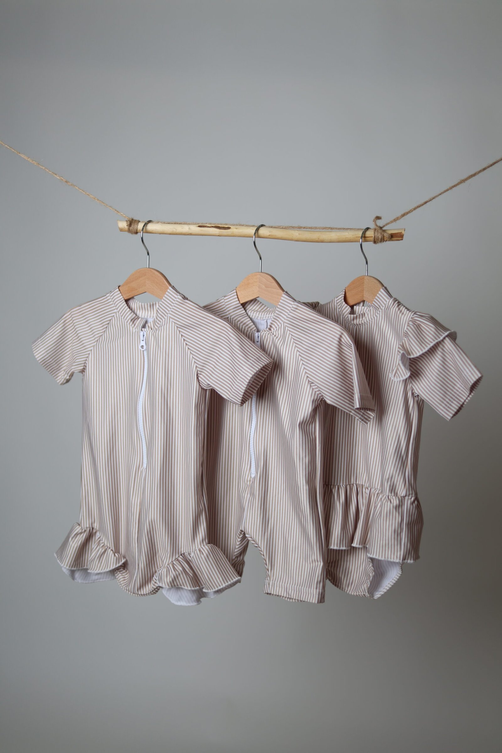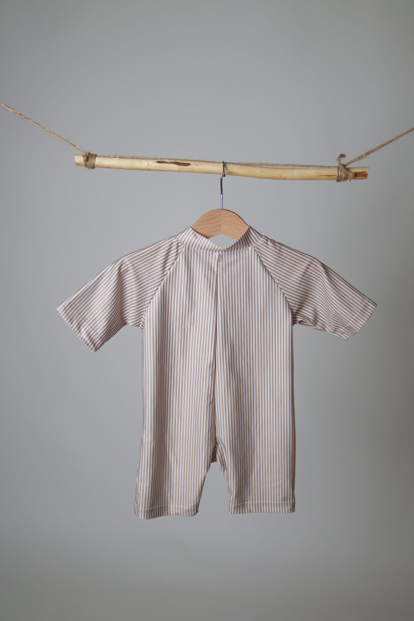 Švelnių dryžuotų atspalvių vienos dalies maudymosi kostiumėlis segamas užtrauktuku priekyje.