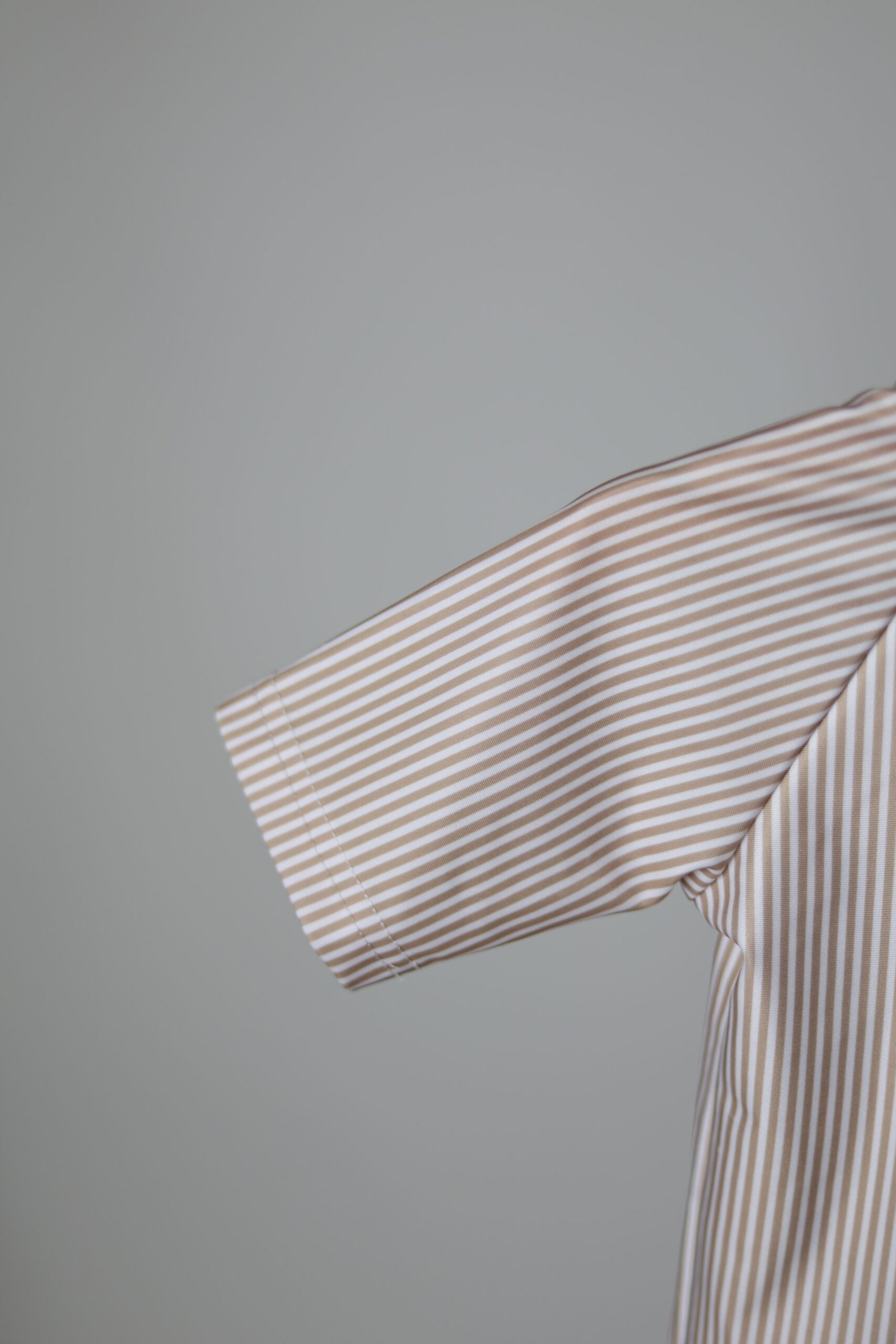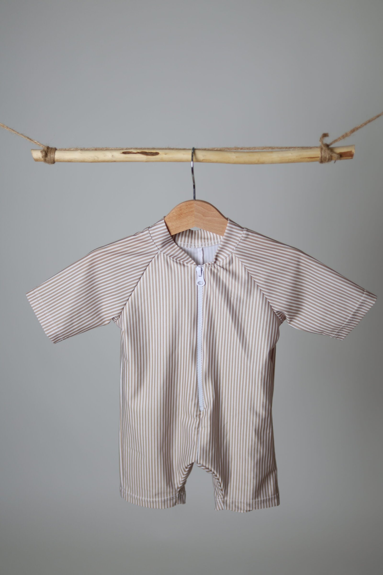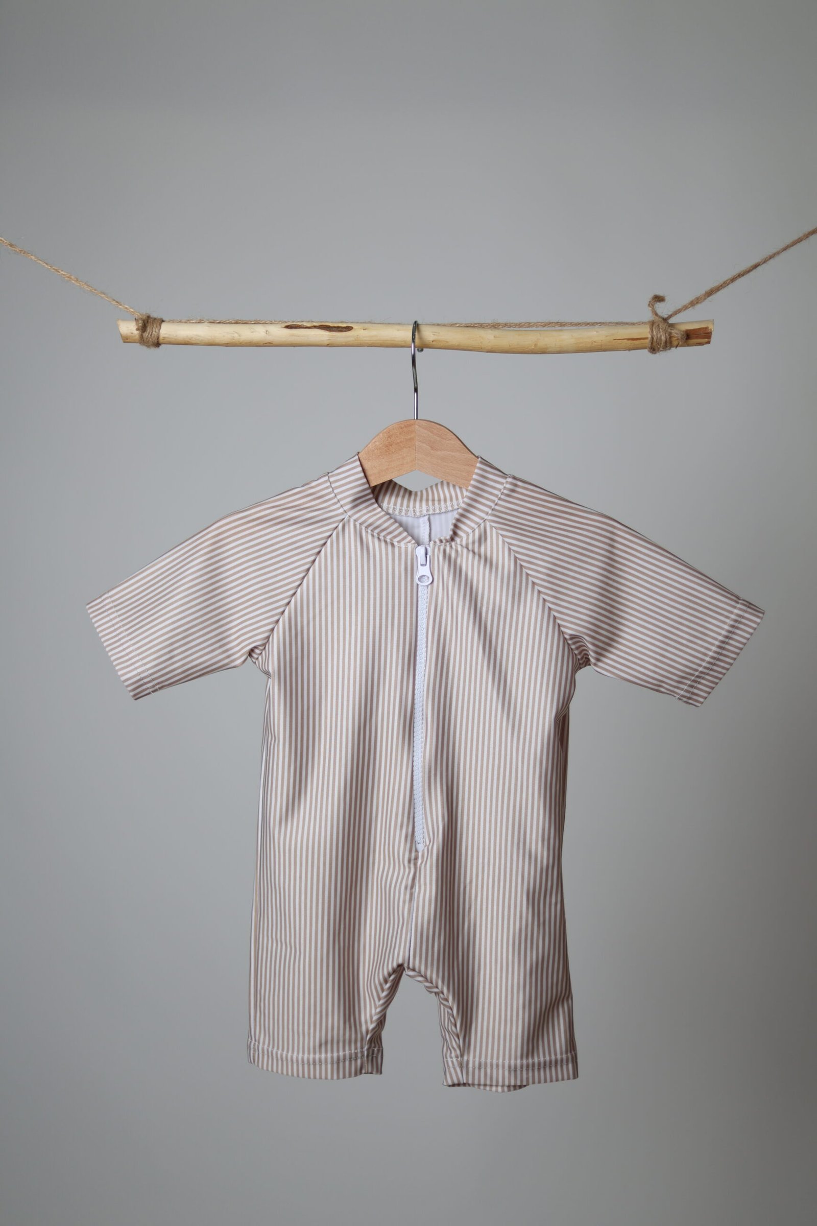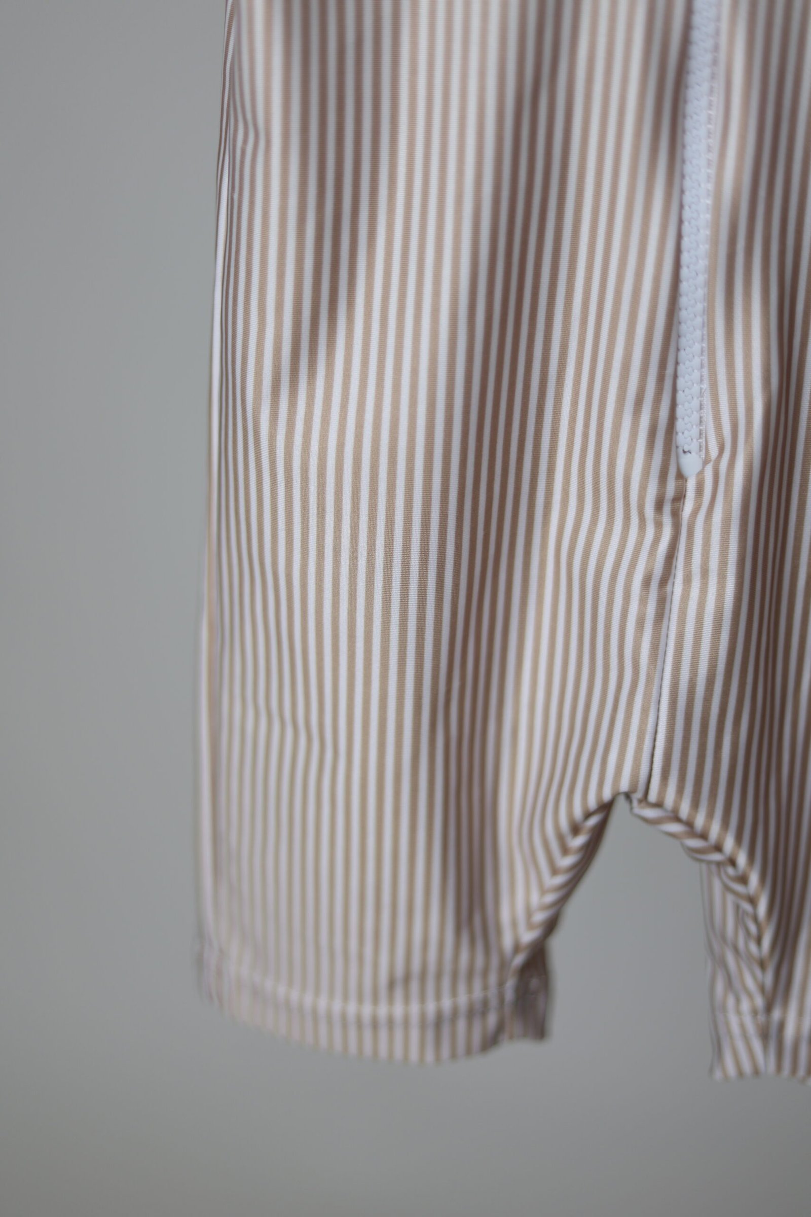 Švelnių dryžuotų atspalvių vienos dalies maudymosi kostiumėlis segamas užtrauktuku priekyje.