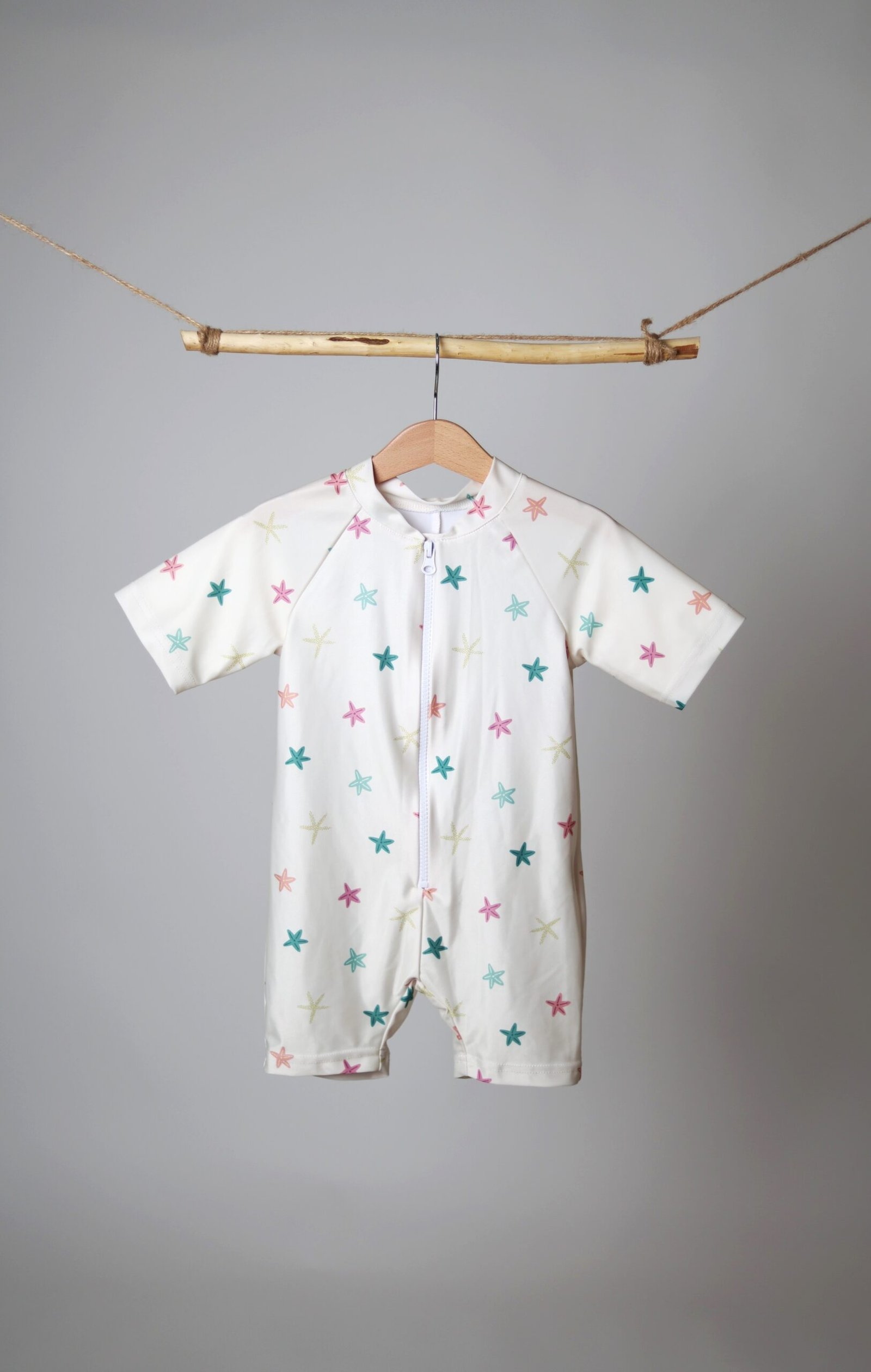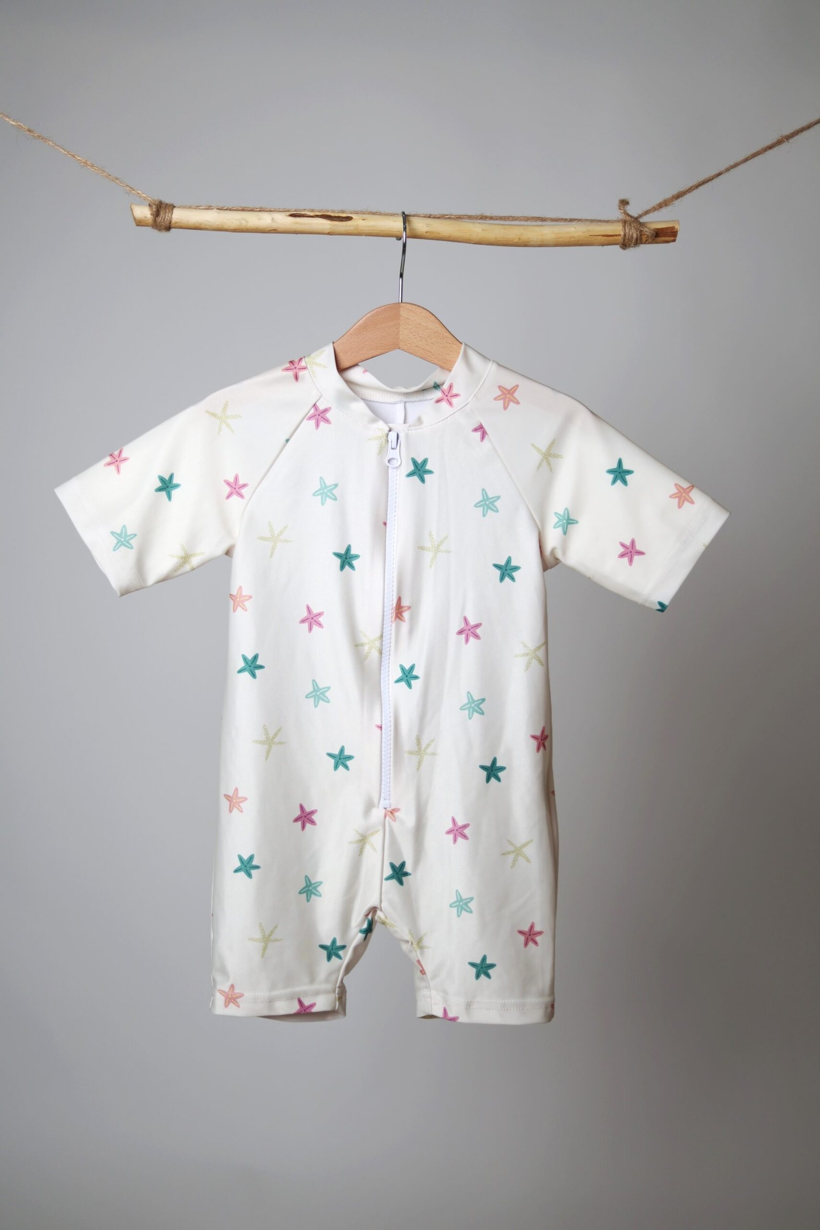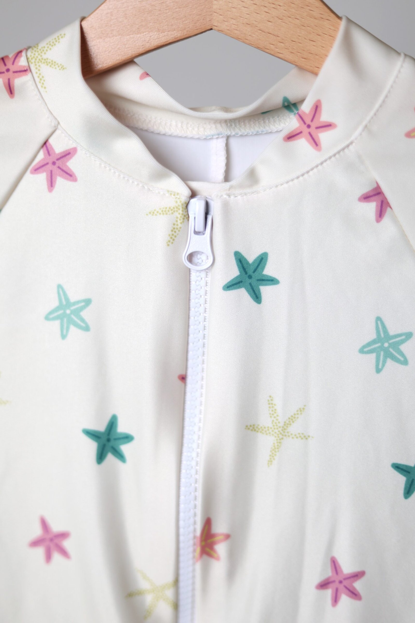 Pastelinių atspalvių, jūros žvaigždelių rašto vienos dalies maudymosi kostiumėlis segamas užtrauktuku priekyje.