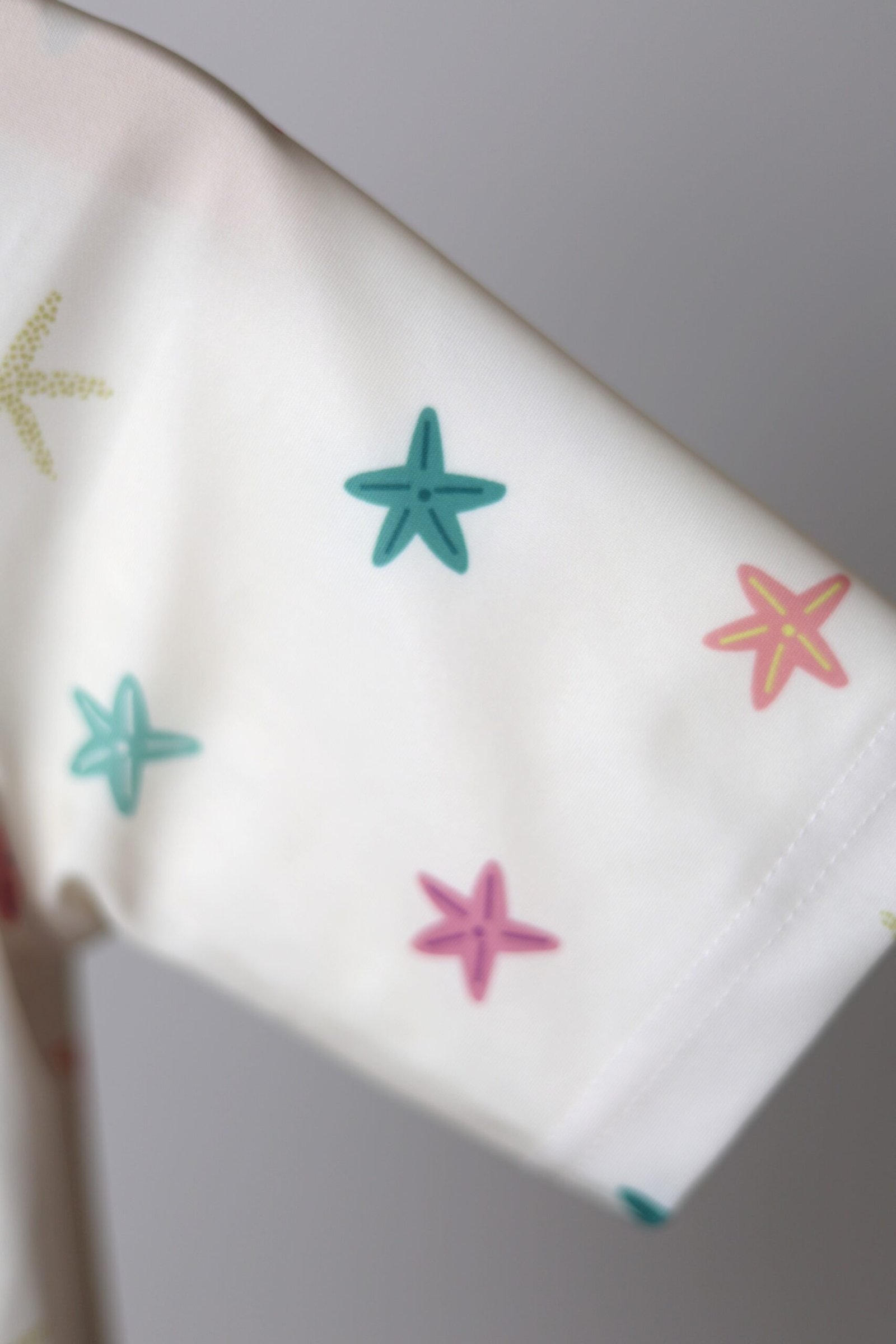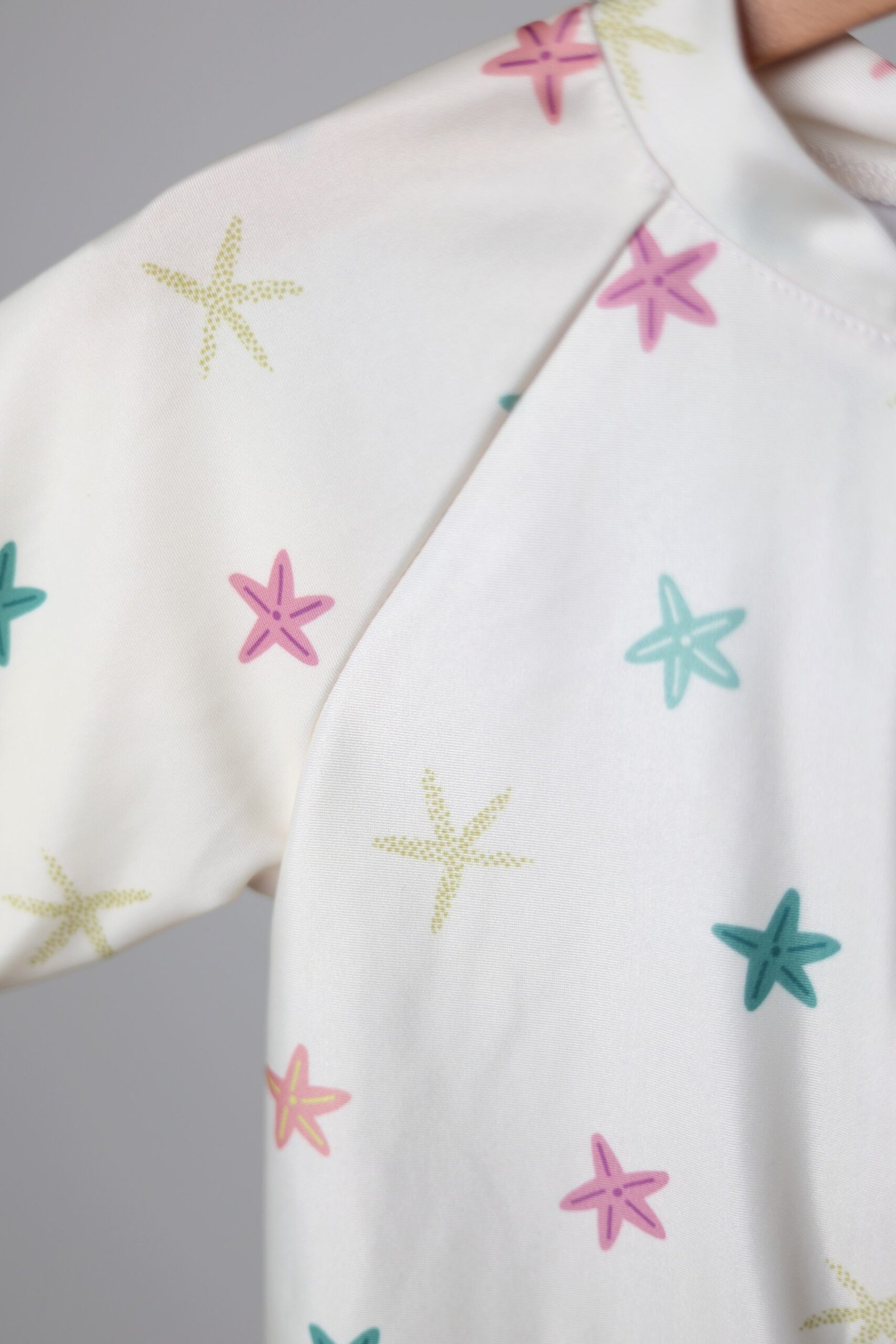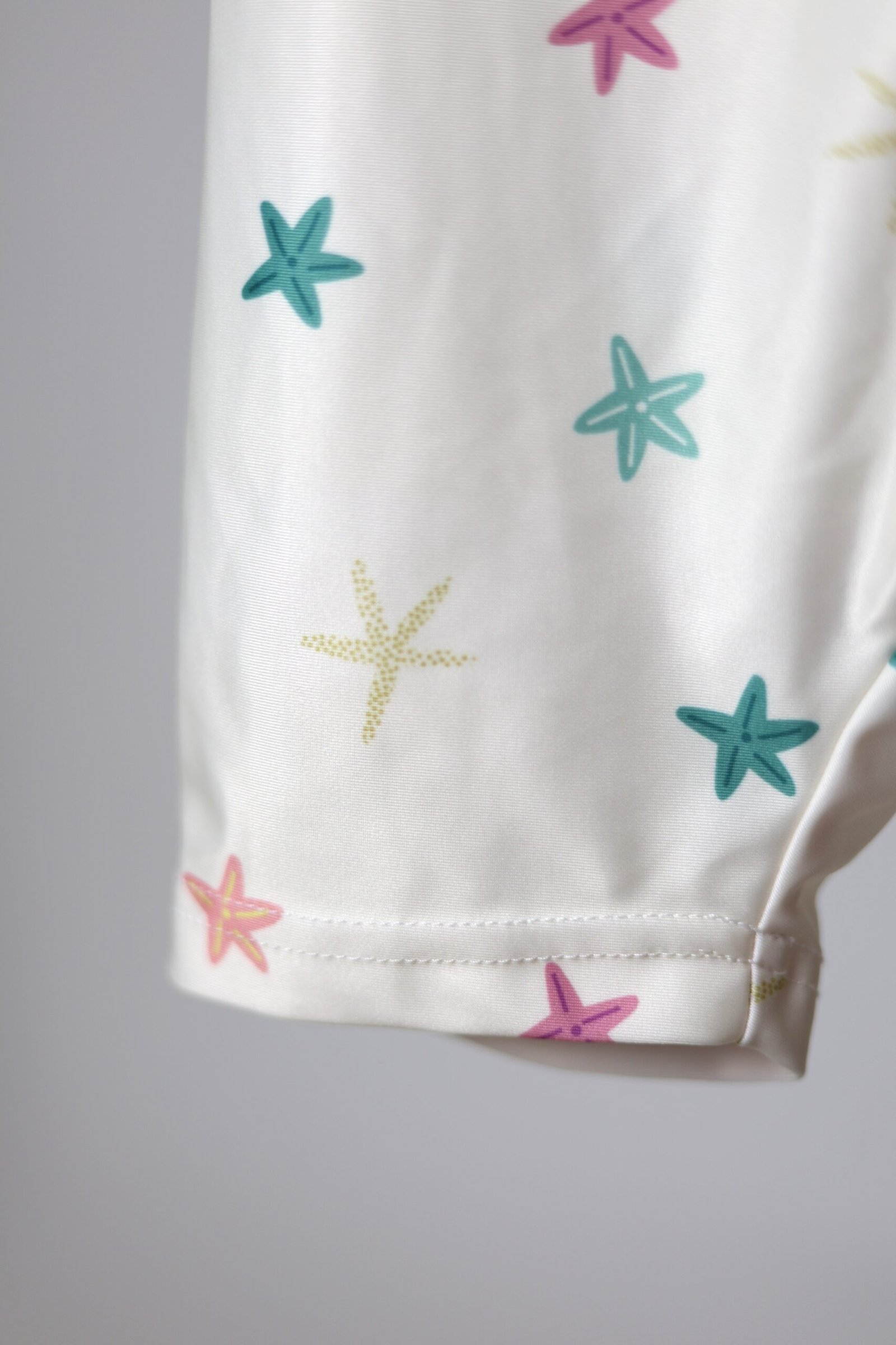 Pastelinių atspalvių, jūros žvaigždelių rašto vienos dalies maudymosi kostiumėlis segamas užtrauktuku priekyje.