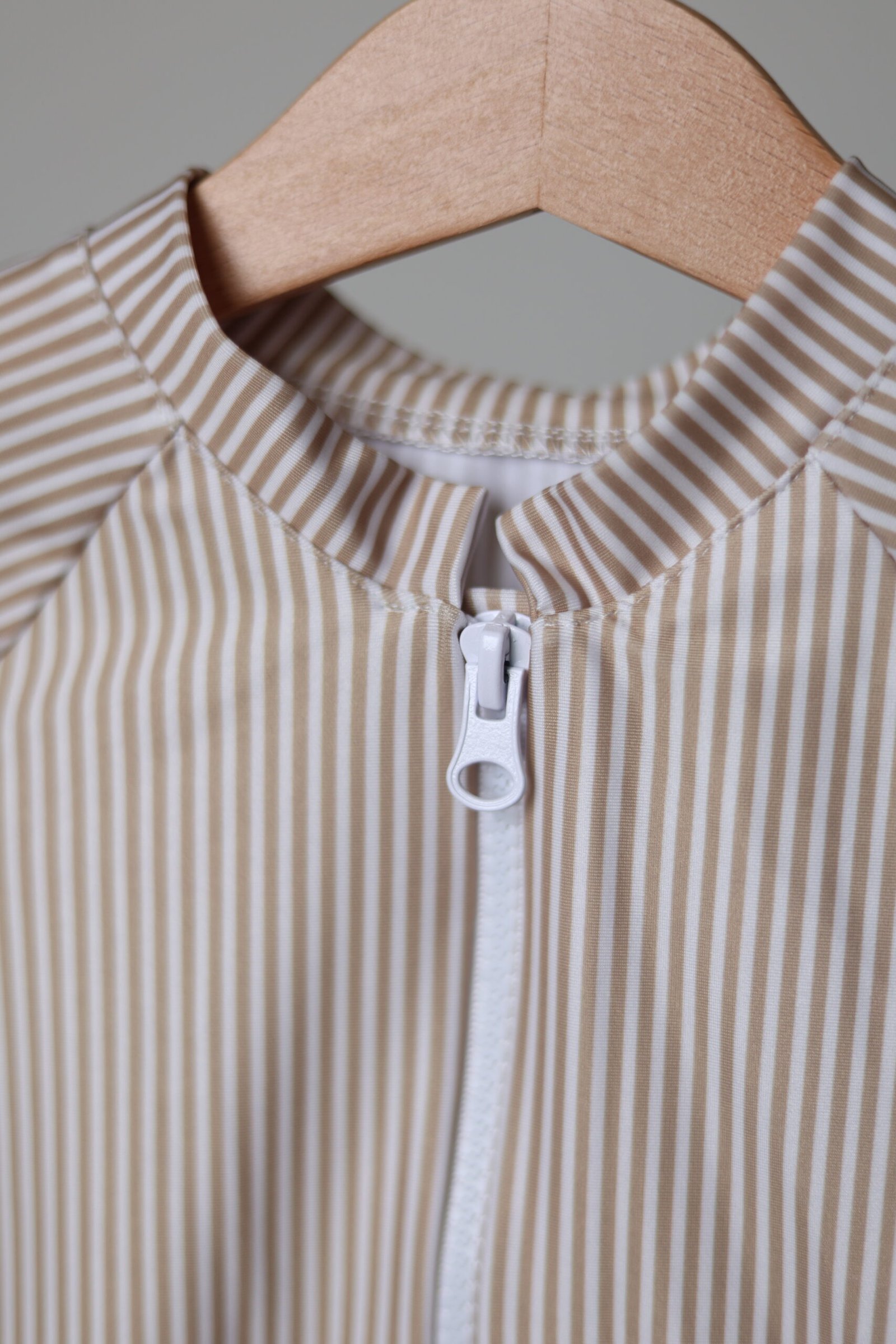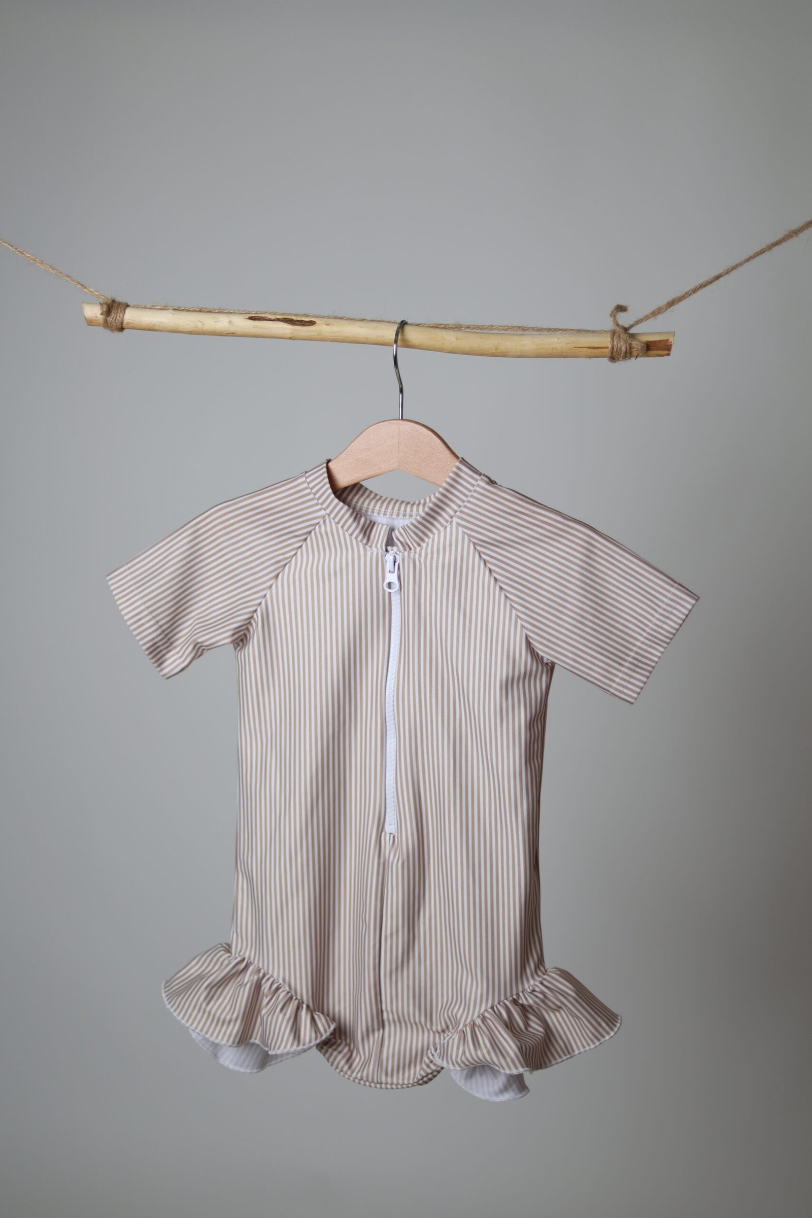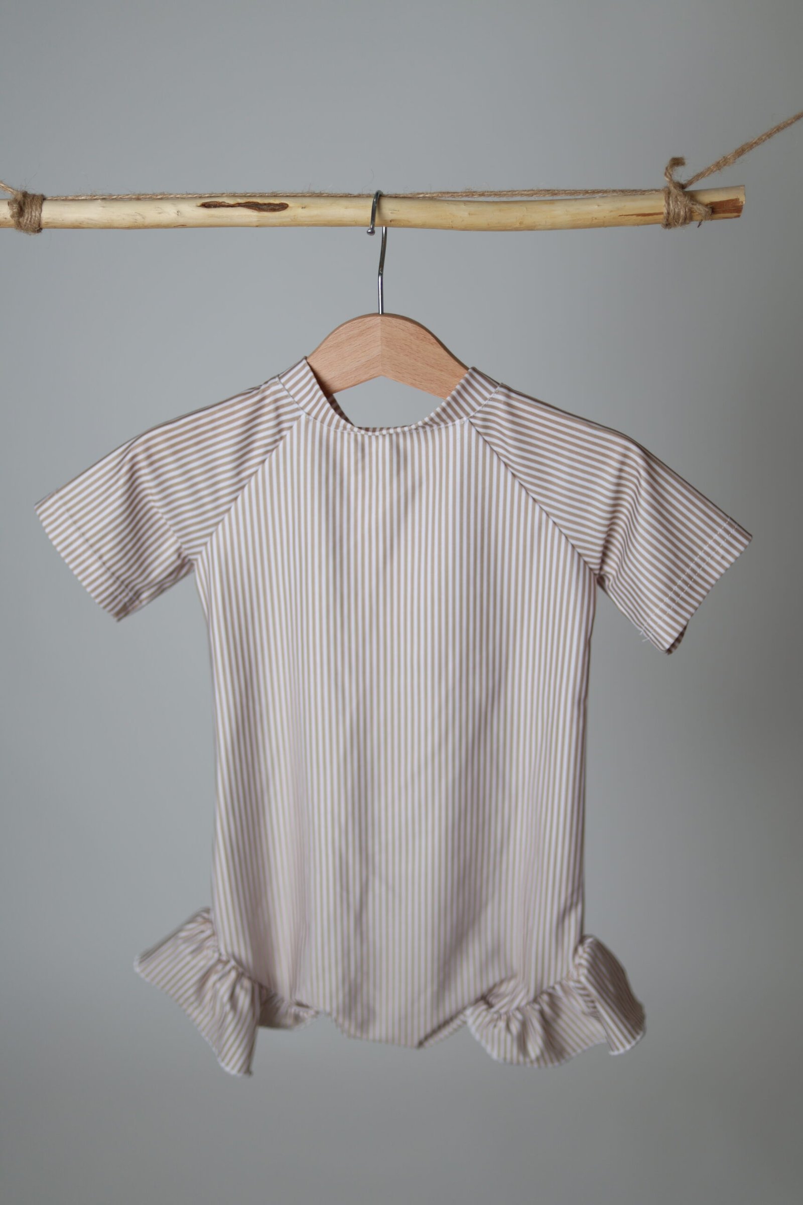 Švelnių dryžuotų atspalvių vienos dalies maudymosi kostiumėlis segamas užtrauktuku priekyje. Apačia dekoruota raukinukais.