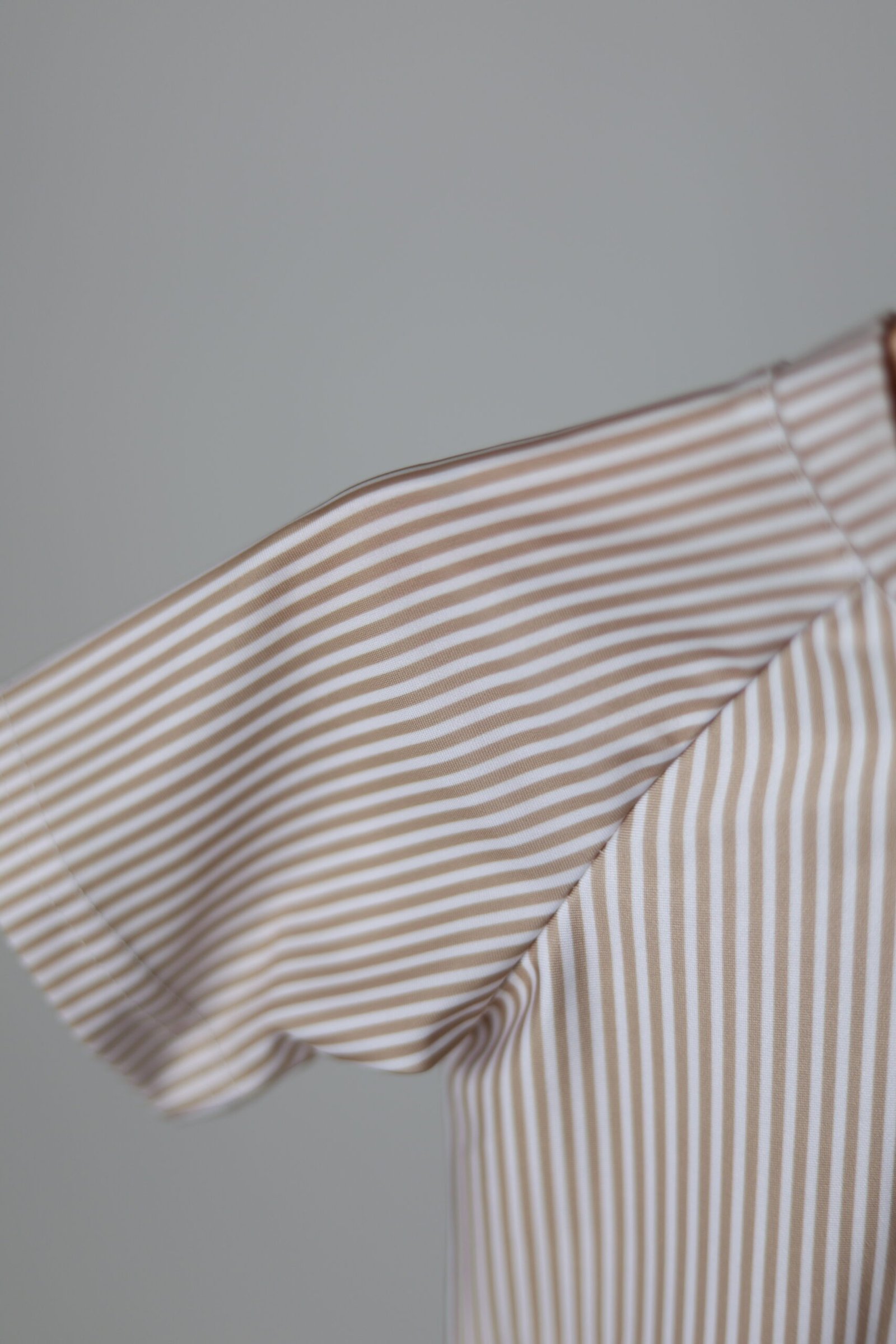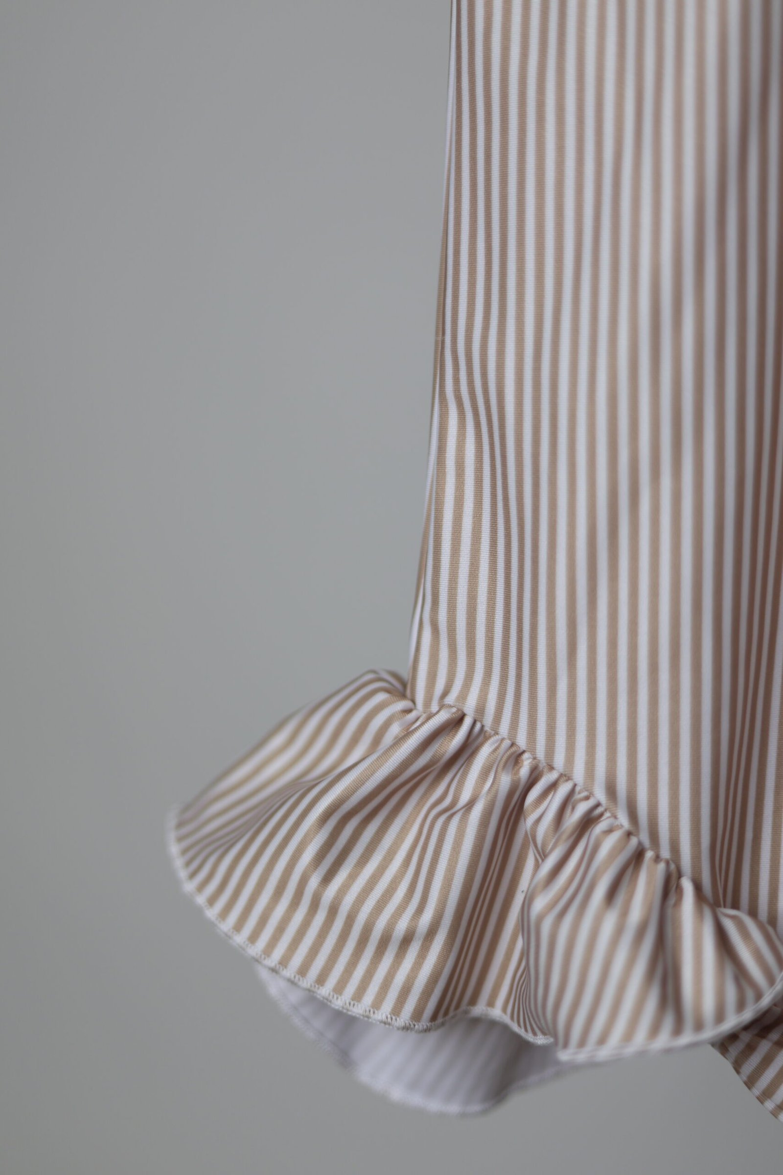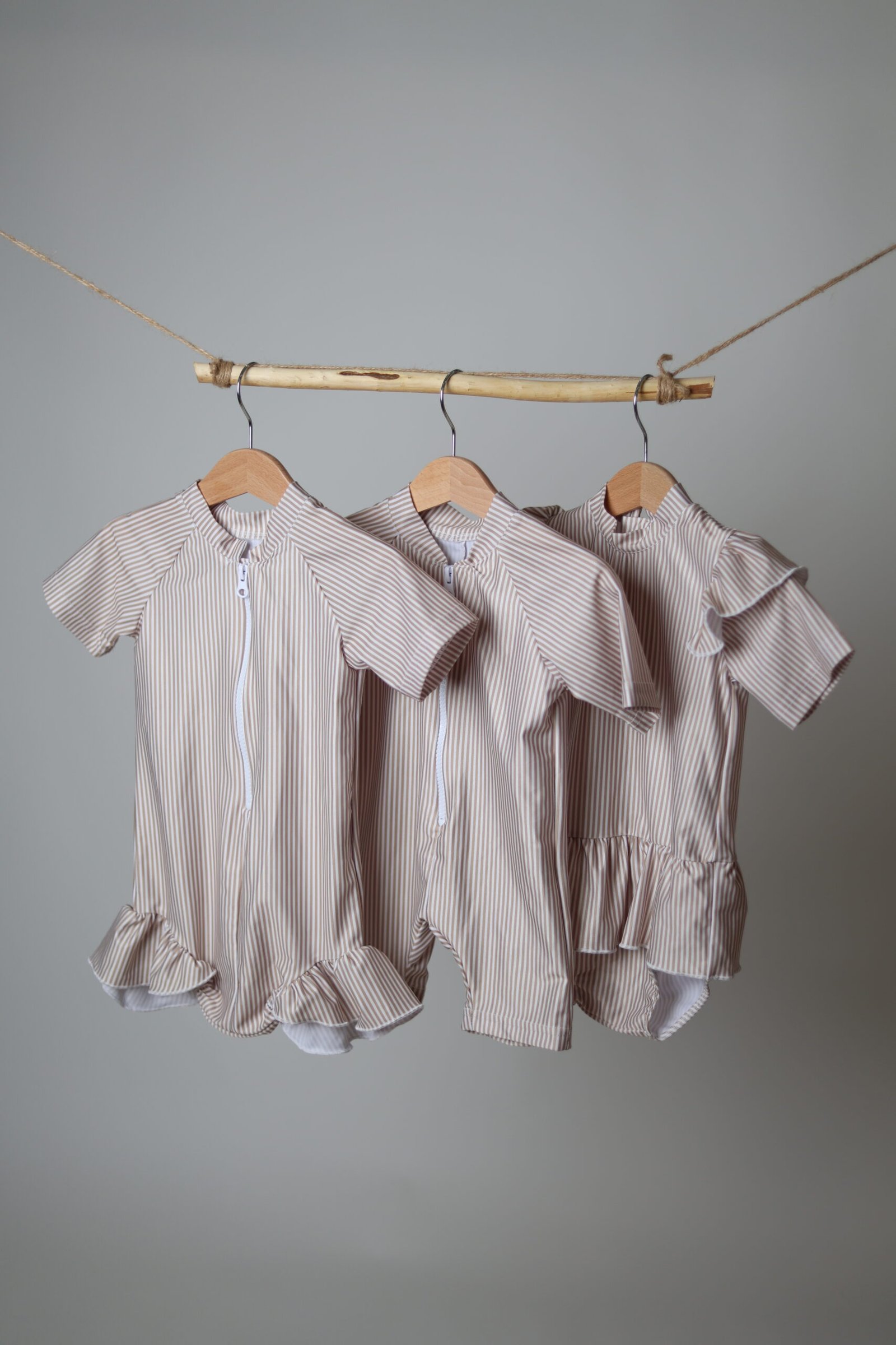 Švelnių dryžuotų atspalvių vienos dalies maudymosi kostiumėlis segamas užtrauktuku priekyje. Apačia dekoruota raukinukais.