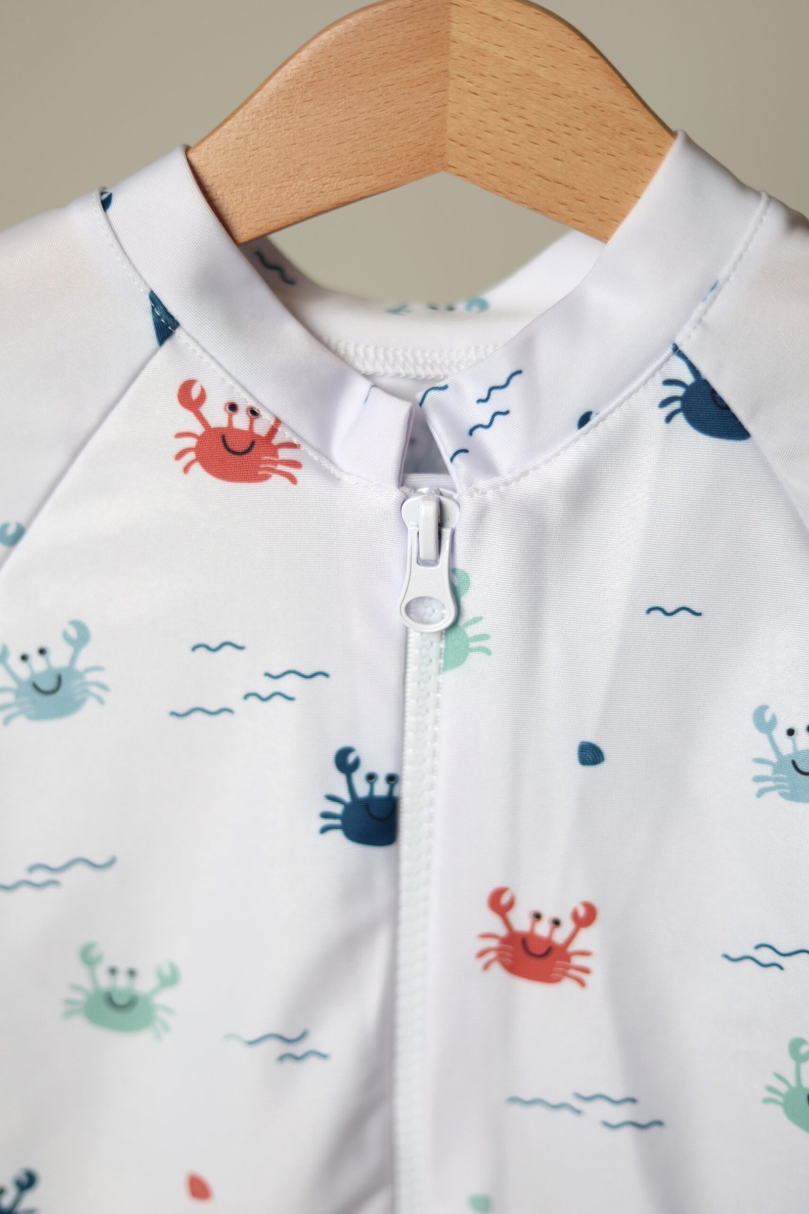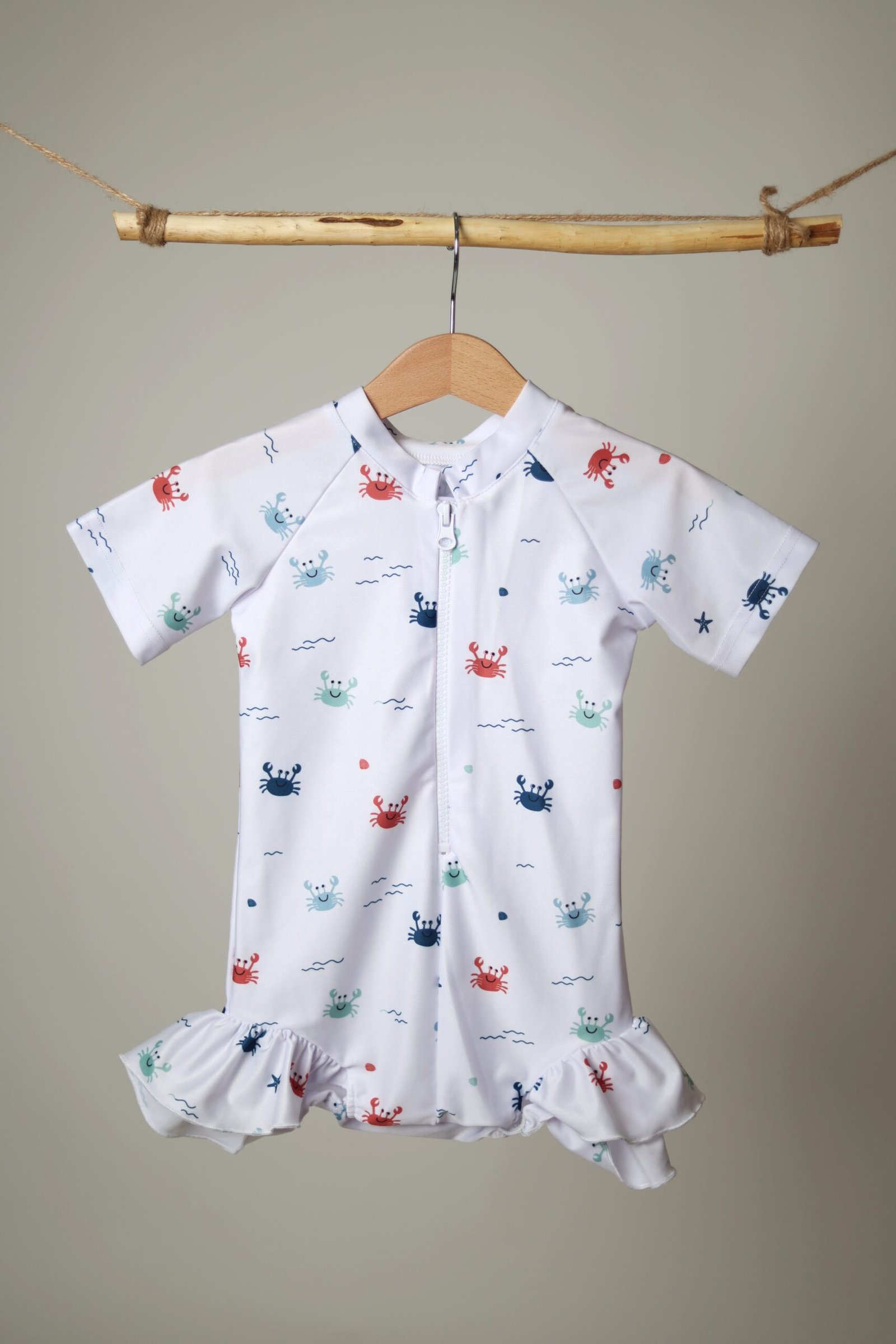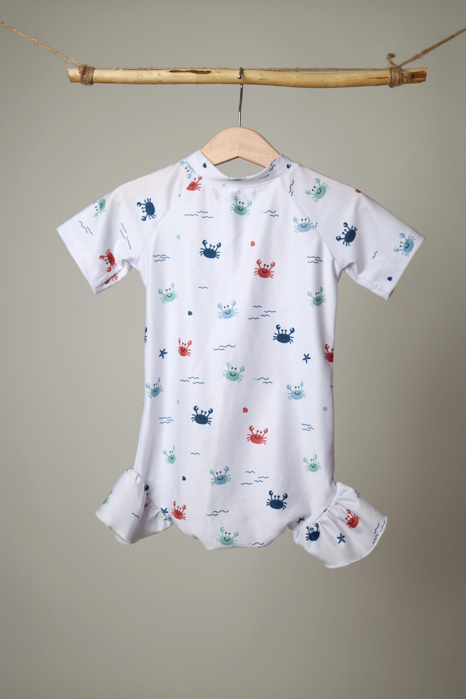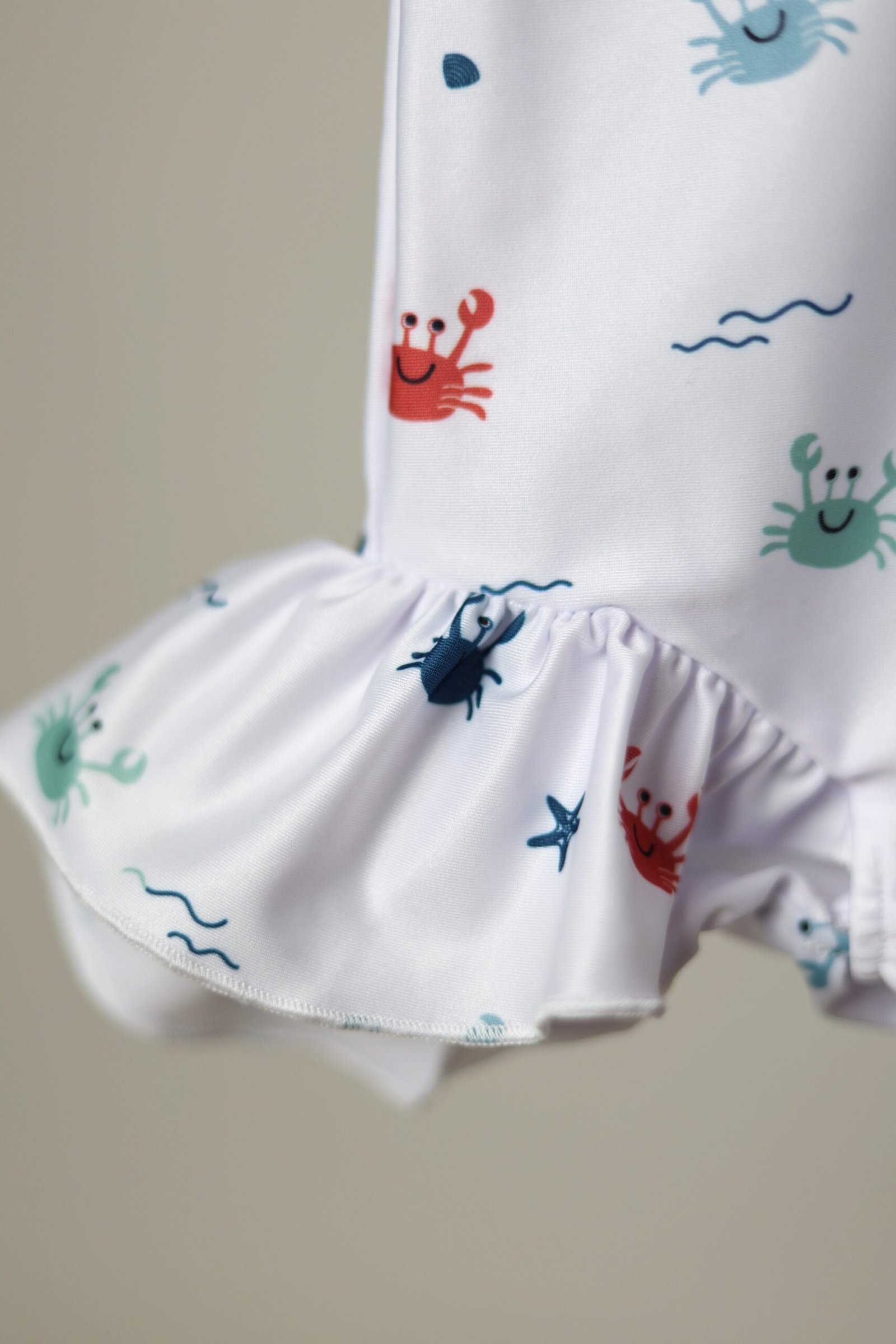 Baltos spalvos, su krabukų, jūros motyvų raštu vienos dalies maudymosi kostiumėlis segamas užtrauktuku priekyje. Apačia dekoruota raukinukais.
