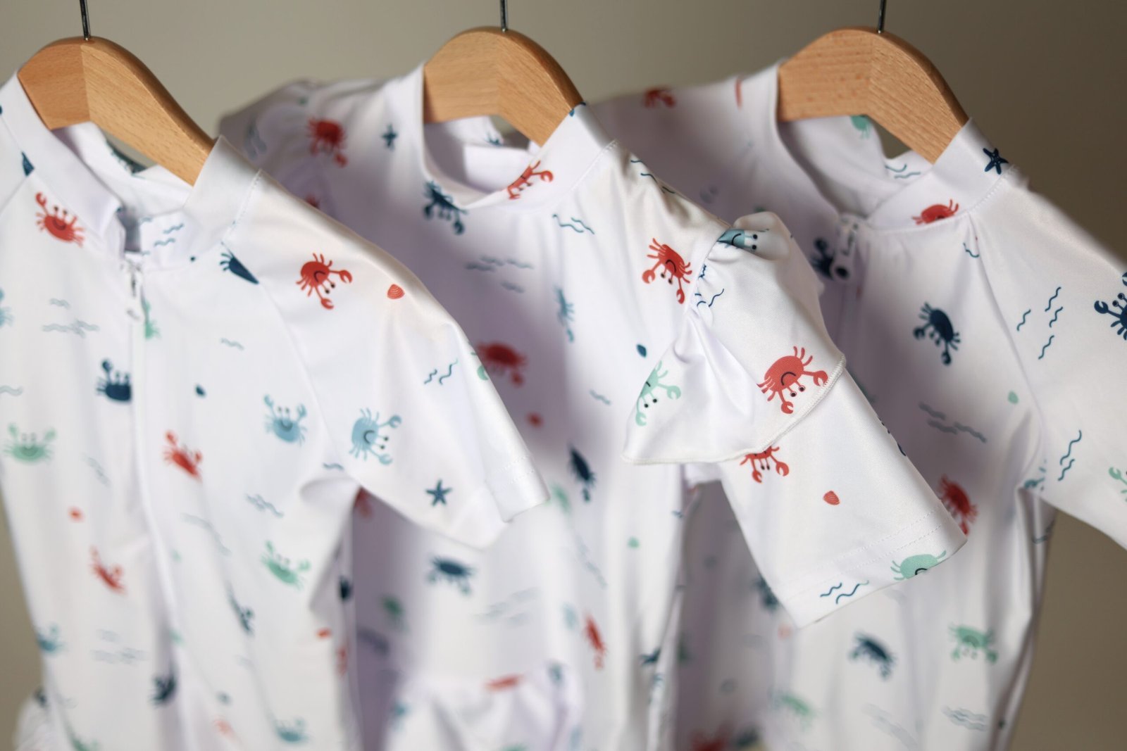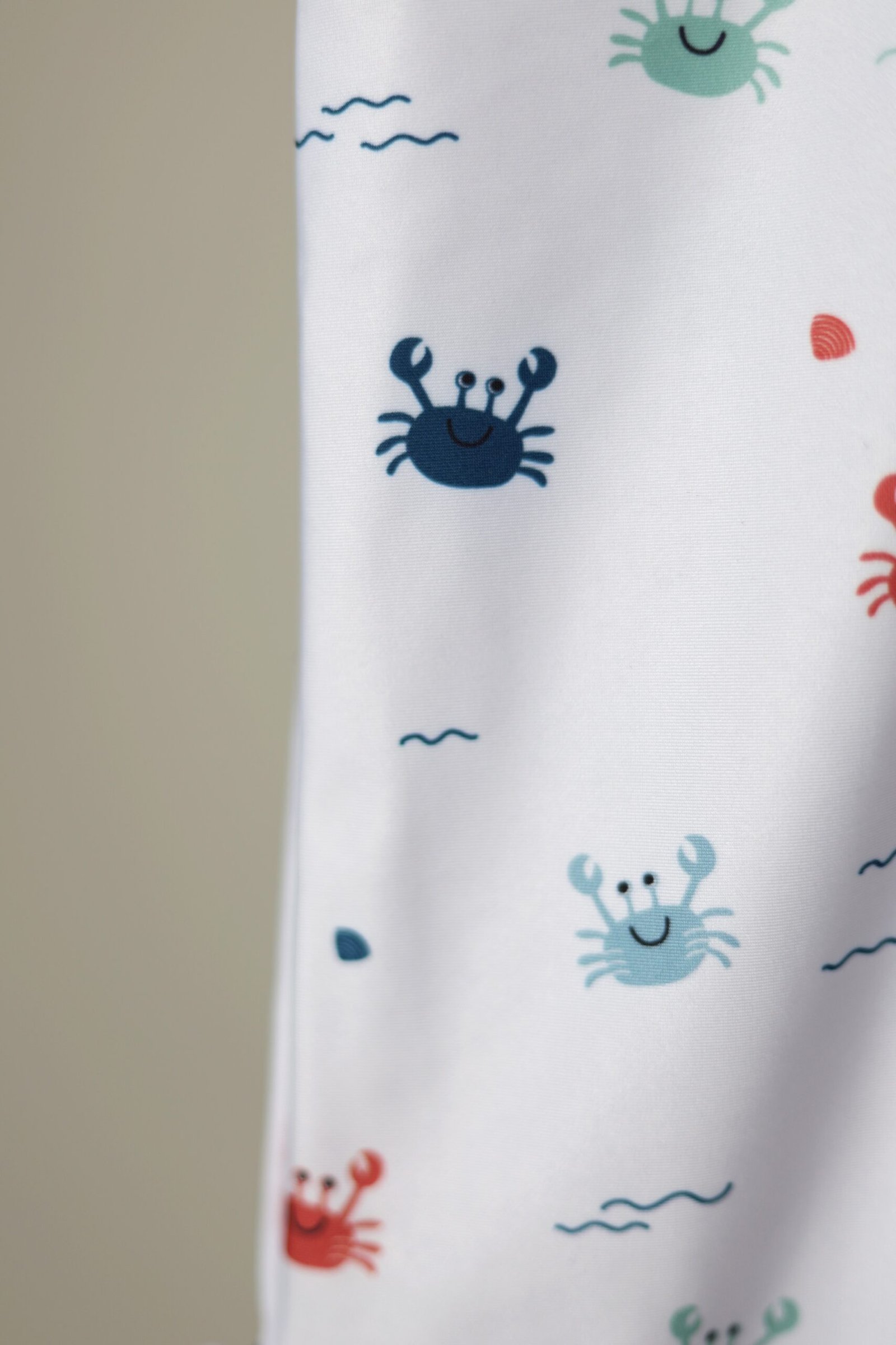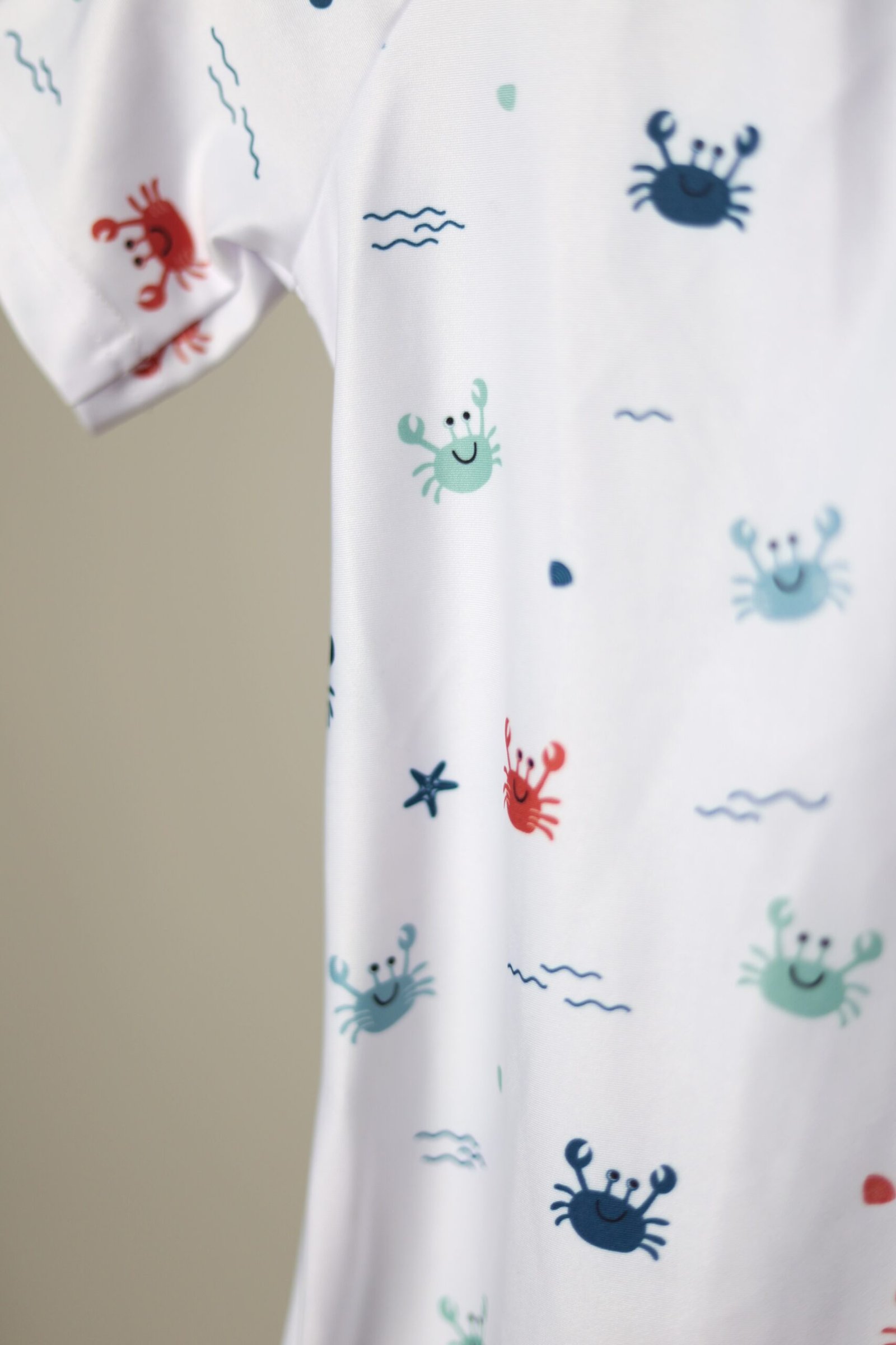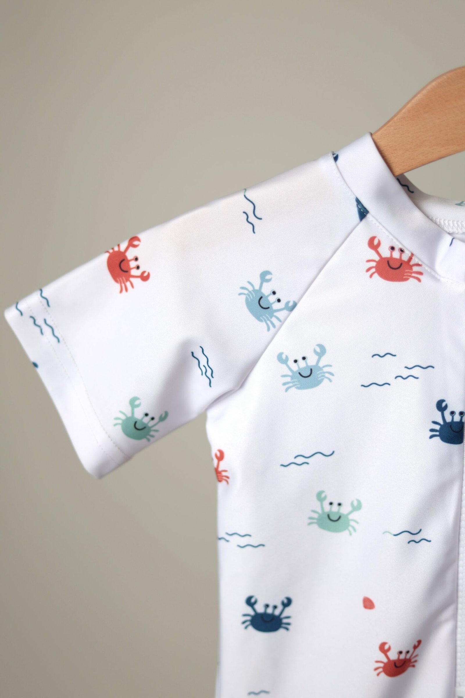 Baltos spalvos, su krabukų, jūros motyvų raštu vienos dalies maudymosi kostiumėlis segamas užtrauktuku priekyje. Apačia dekoruota raukinukais.