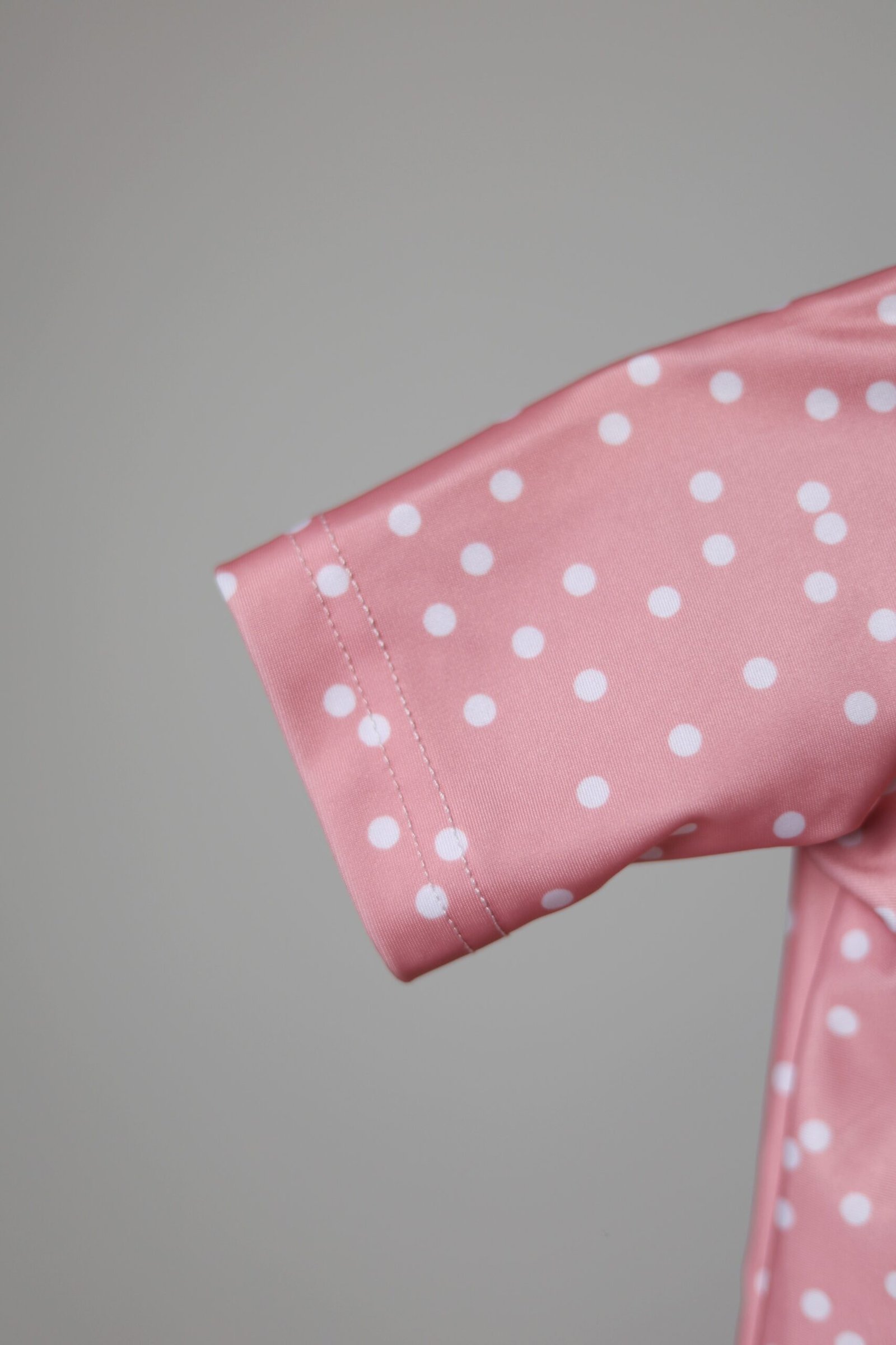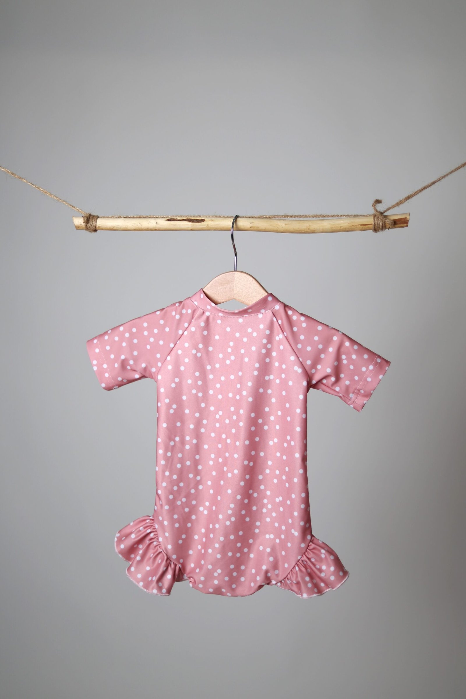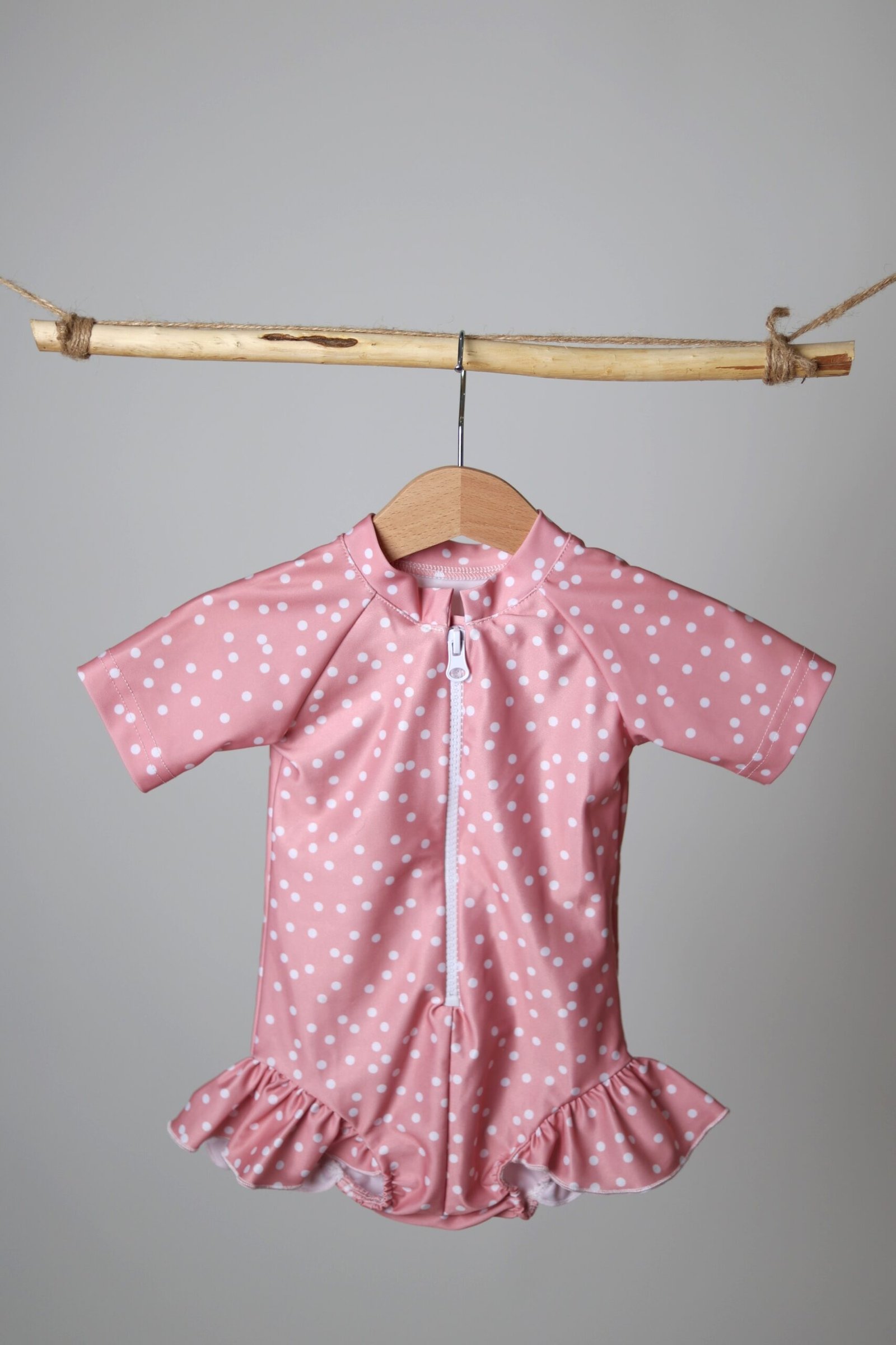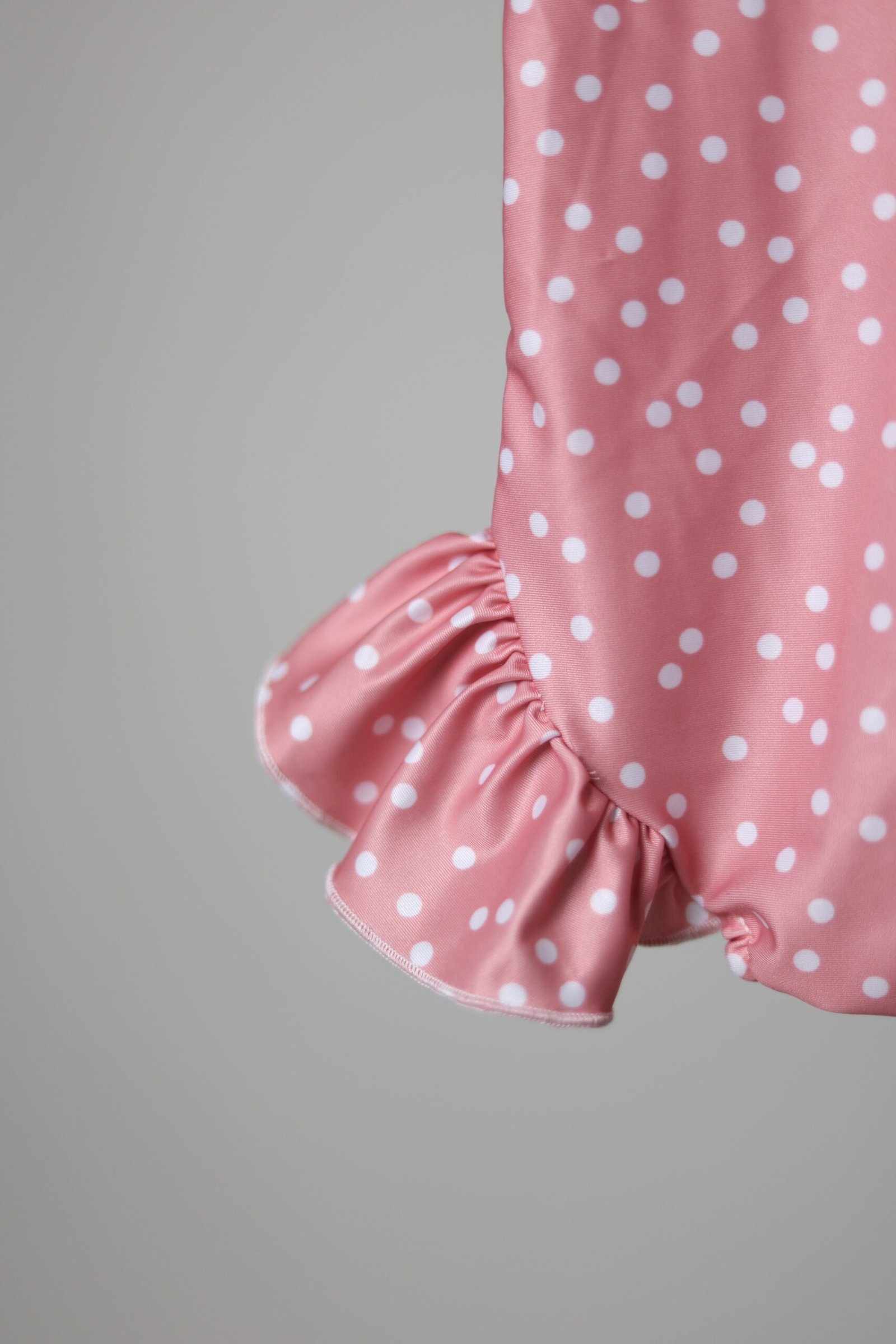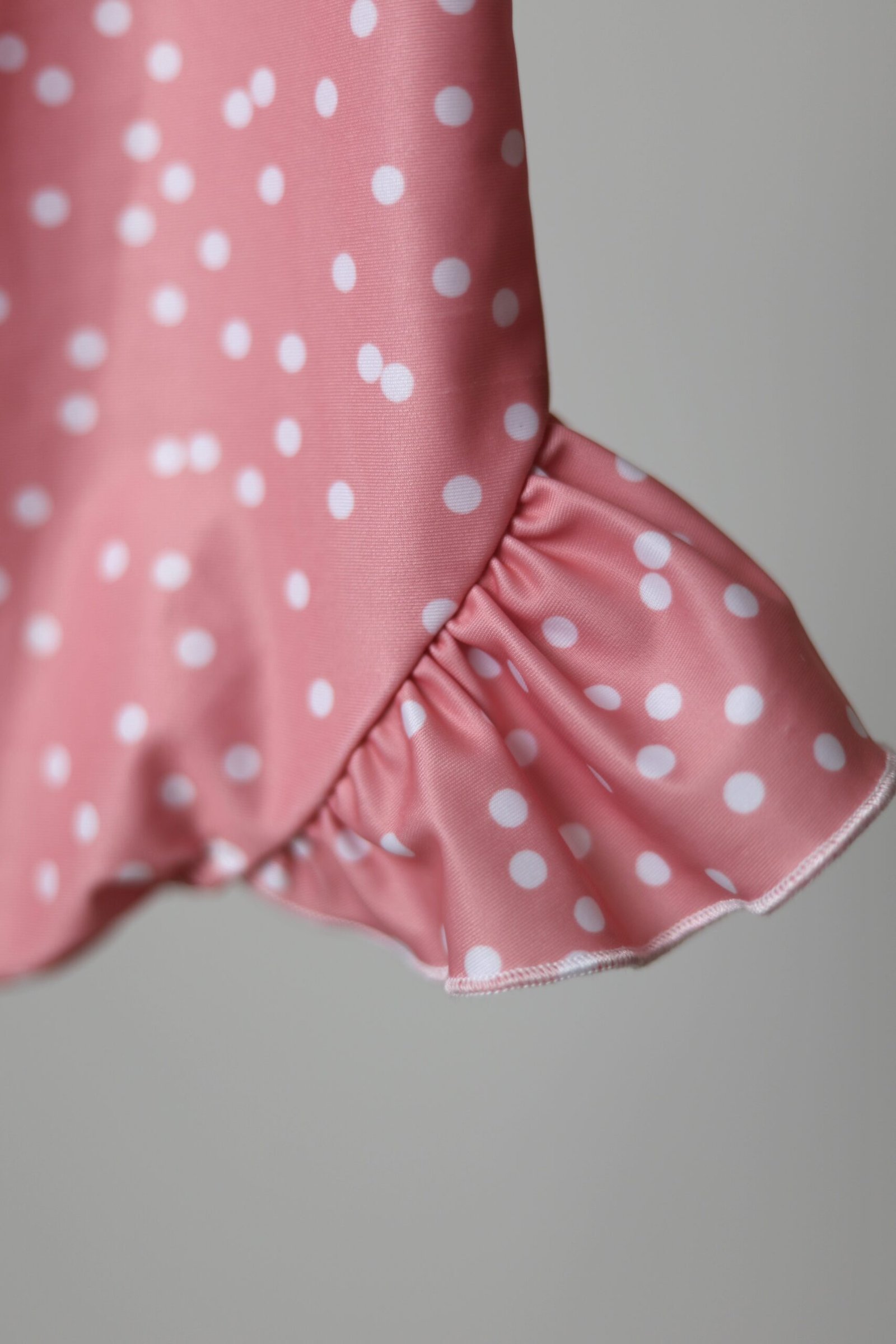 Rausvos spalvos su baltais taškiukais vienos dalies maudymosi kostiumėlis segamas užtrauktuku priekyje. Apačia dekoruota raukinukais.