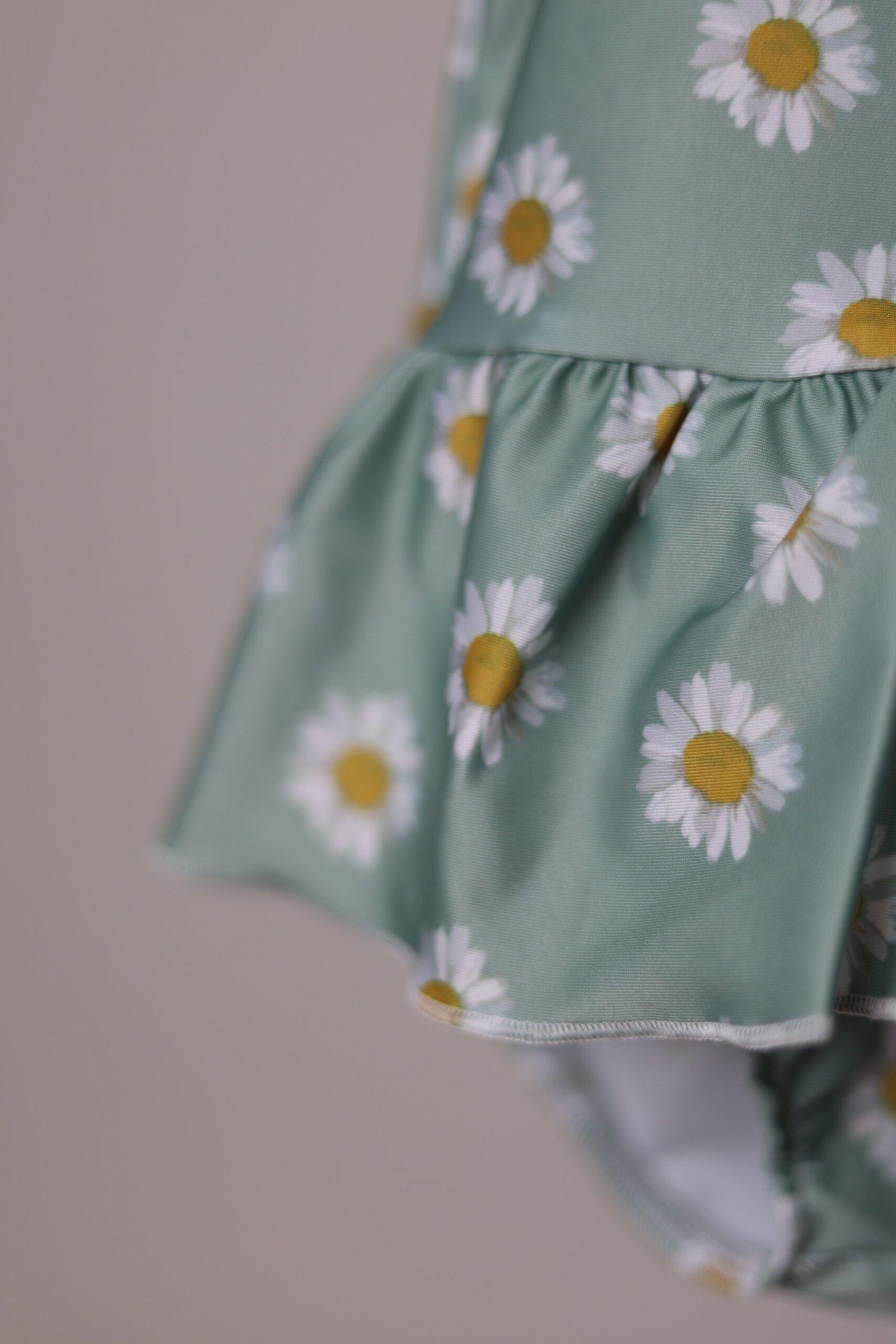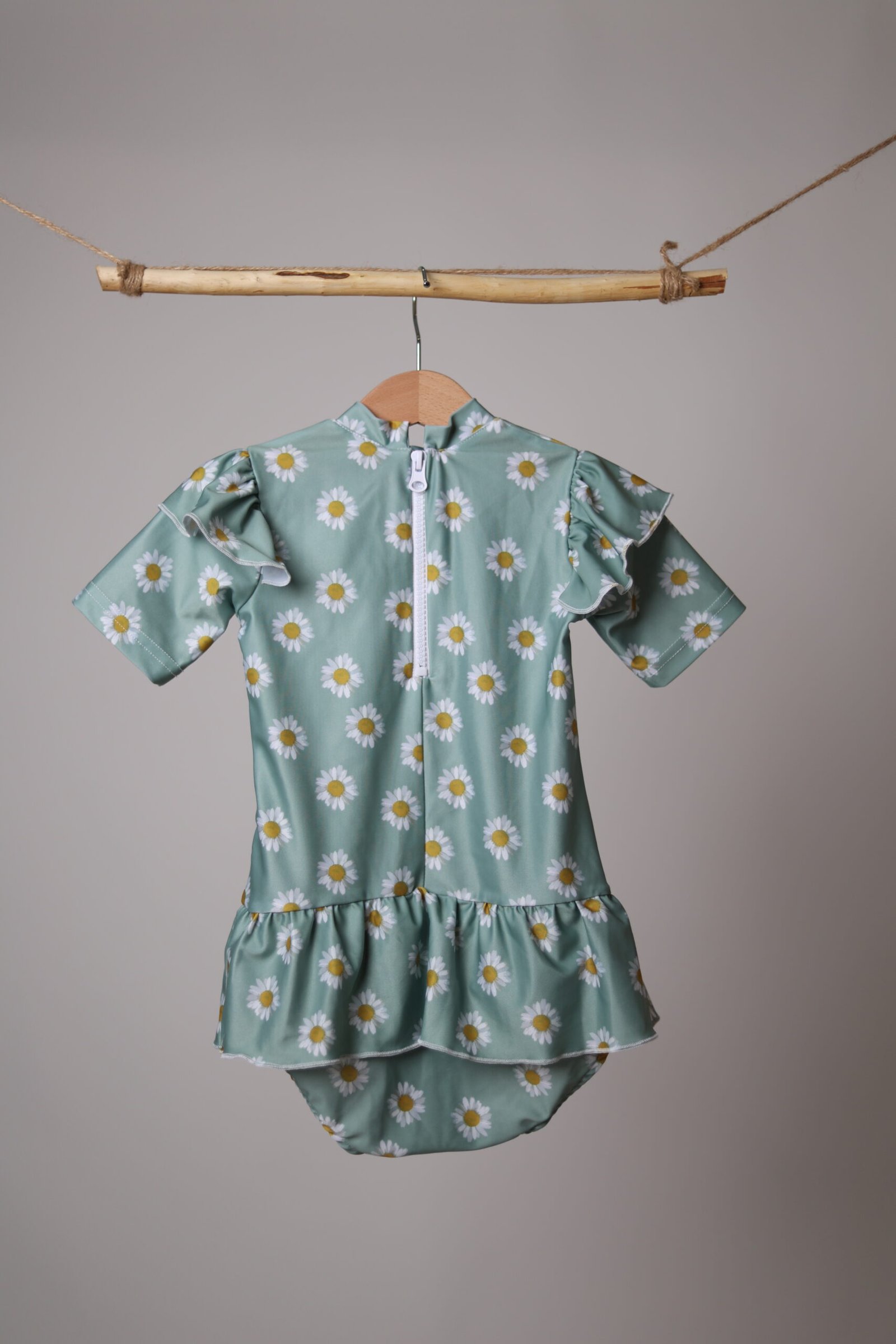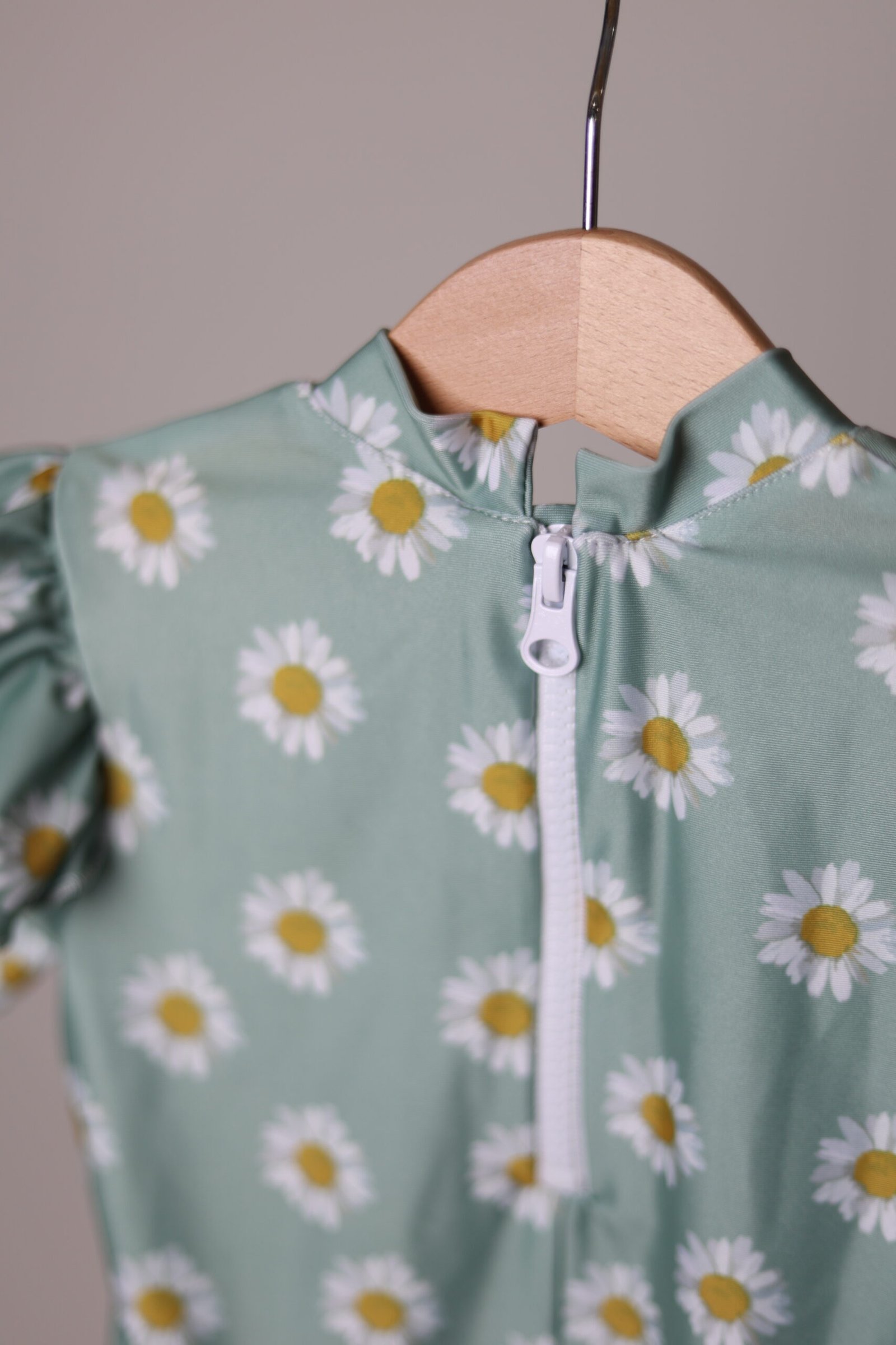 Švelnių atspalvių, ramunėlių rašto vienos dalies maudymosi kostiumėlis segamas užtrauktuku nugaroje. Pečiuose dekoratyviniai raukinukai, apačioje – raukinukai-sijonukas.