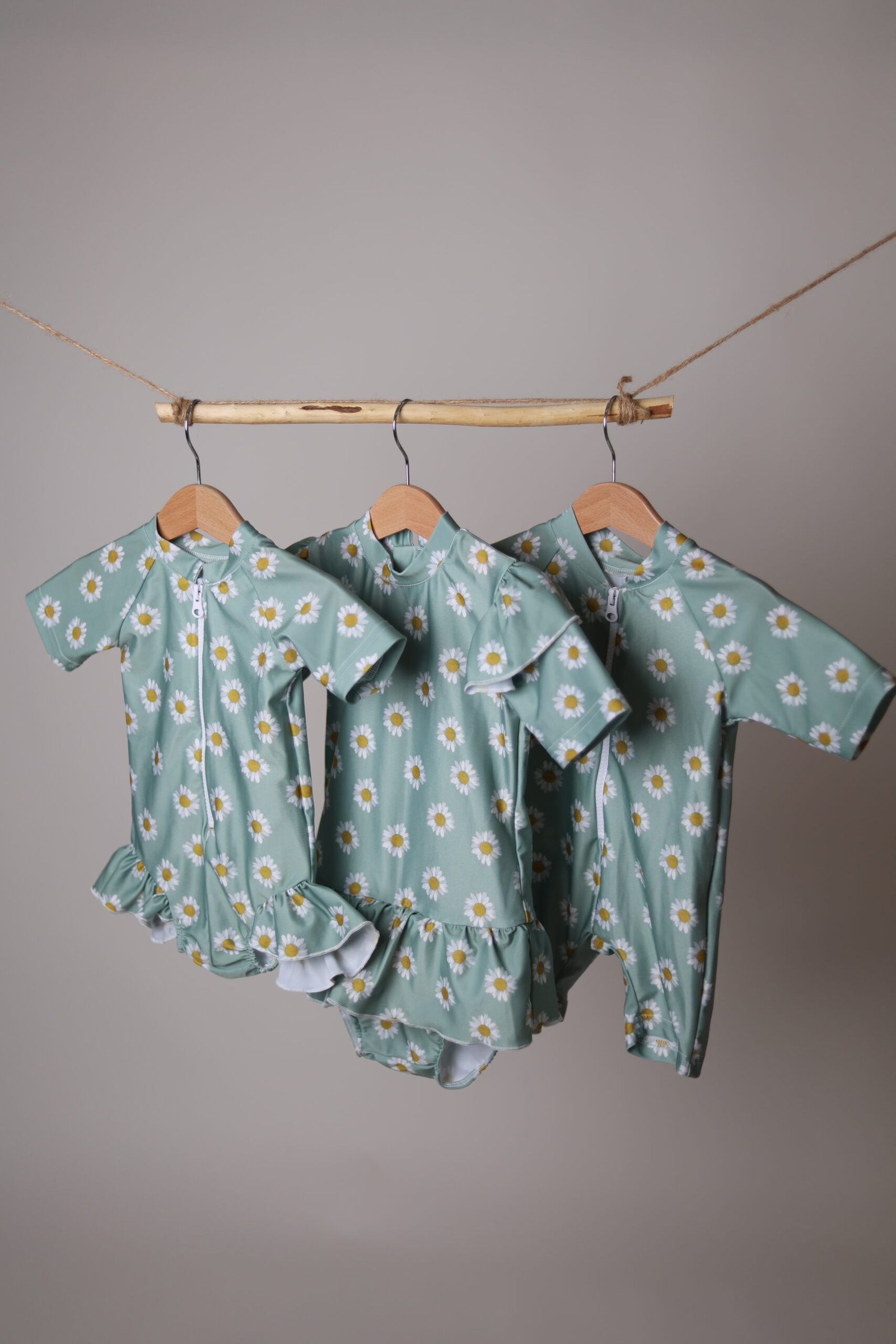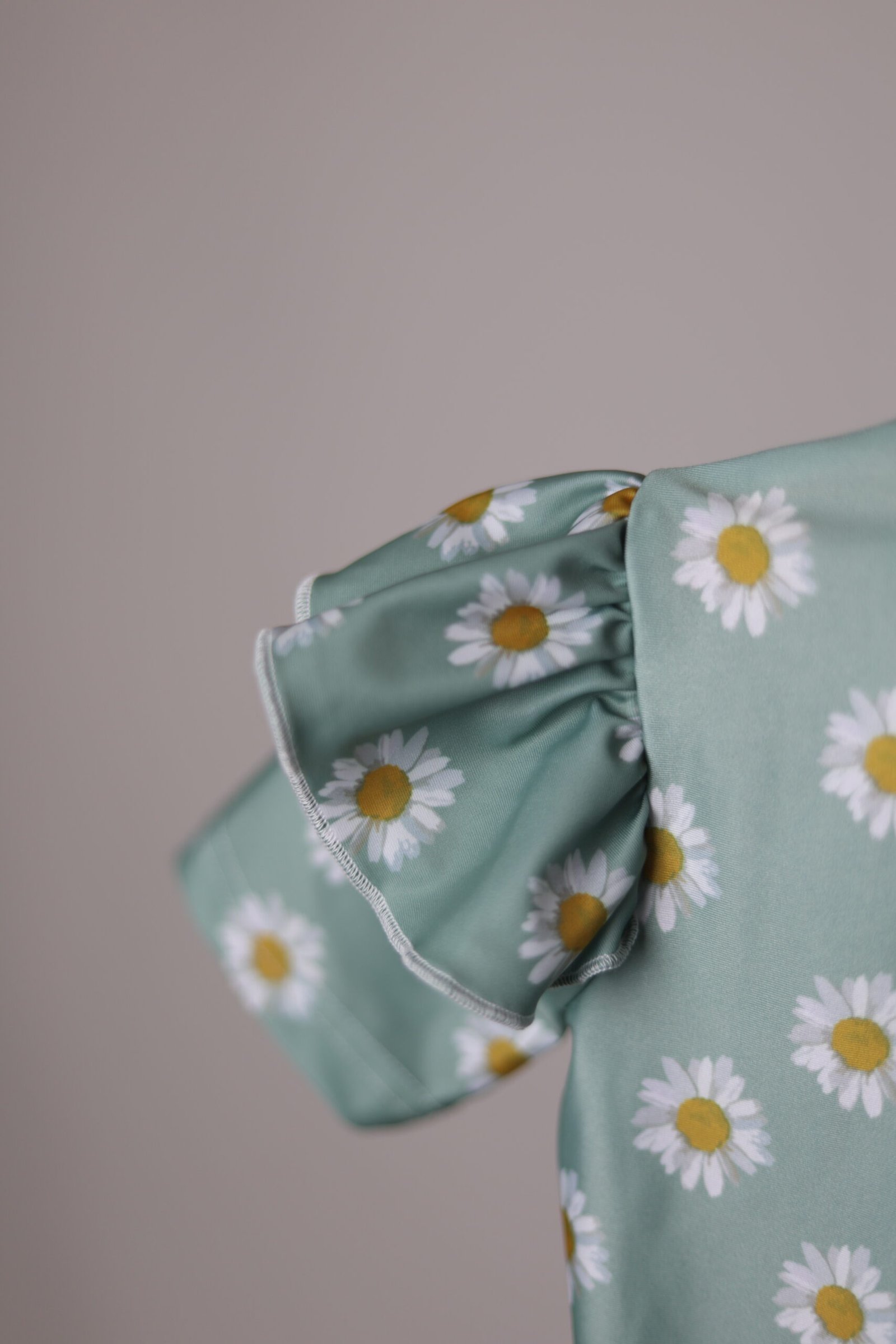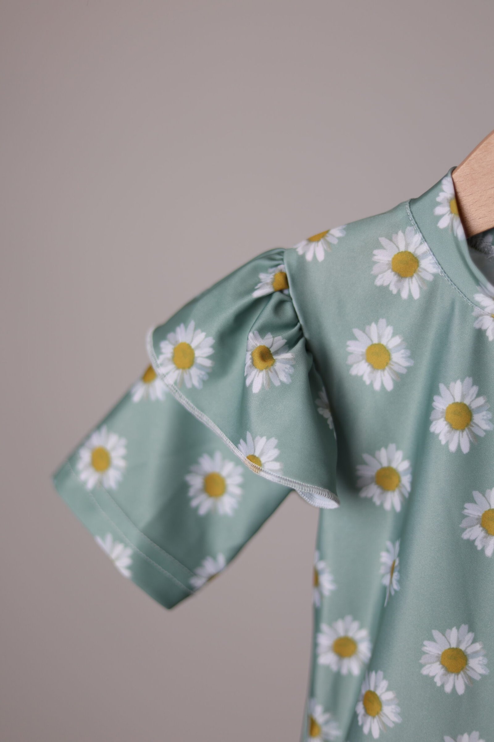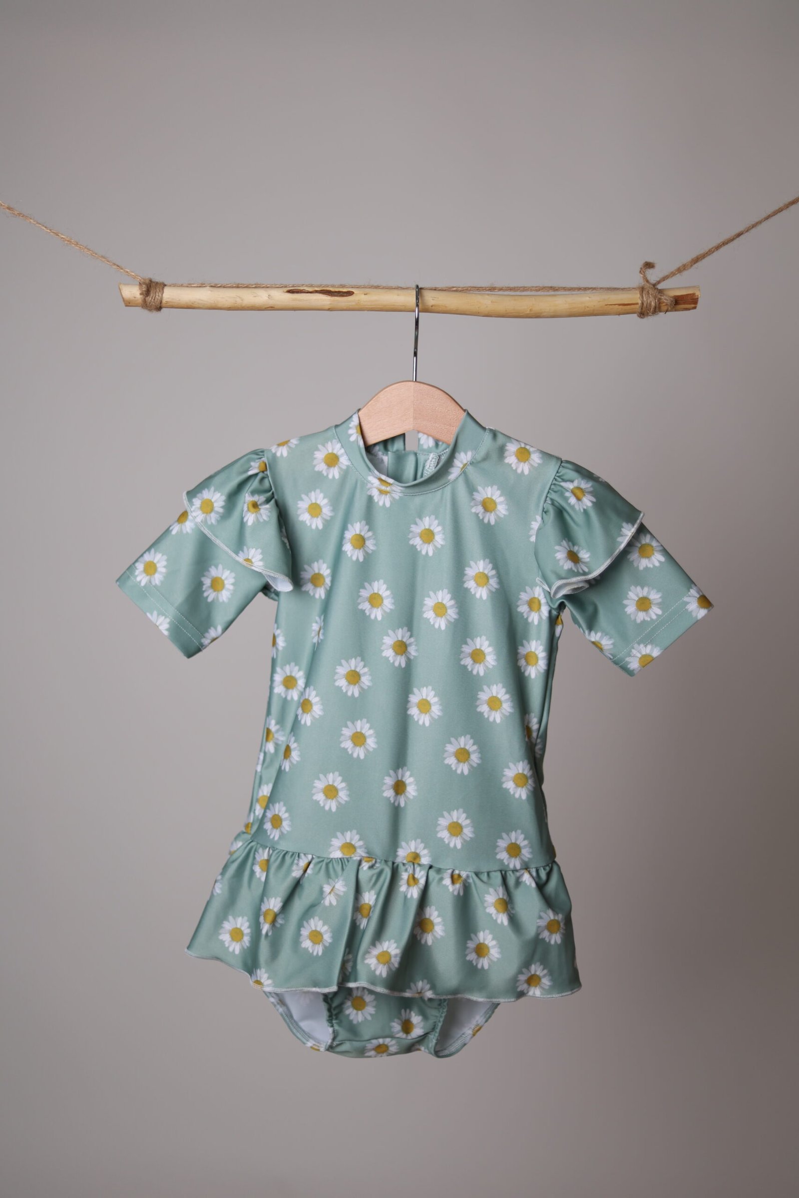 Švelnių atspalvių, ramunėlių rašto vienos dalies maudymosi kostiumėlis segamas užtrauktuku nugaroje. Pečiuose dekoratyviniai raukinukai, apačioje – raukinukai-sijonukas.