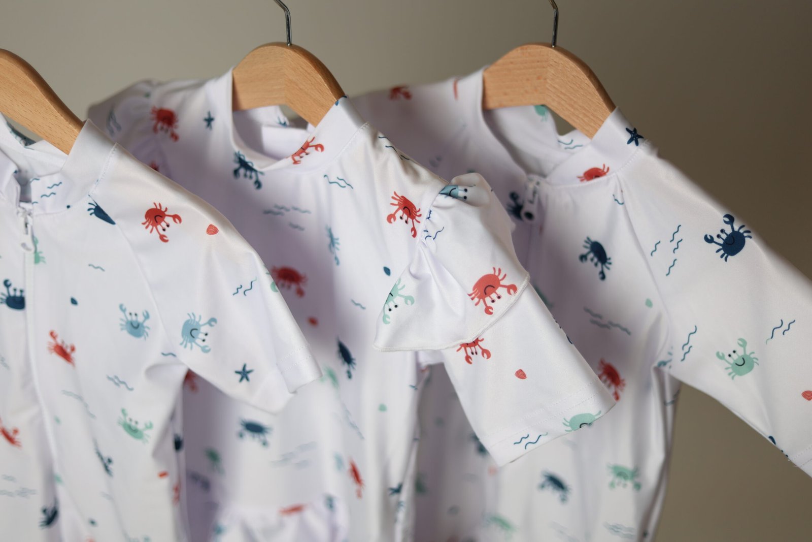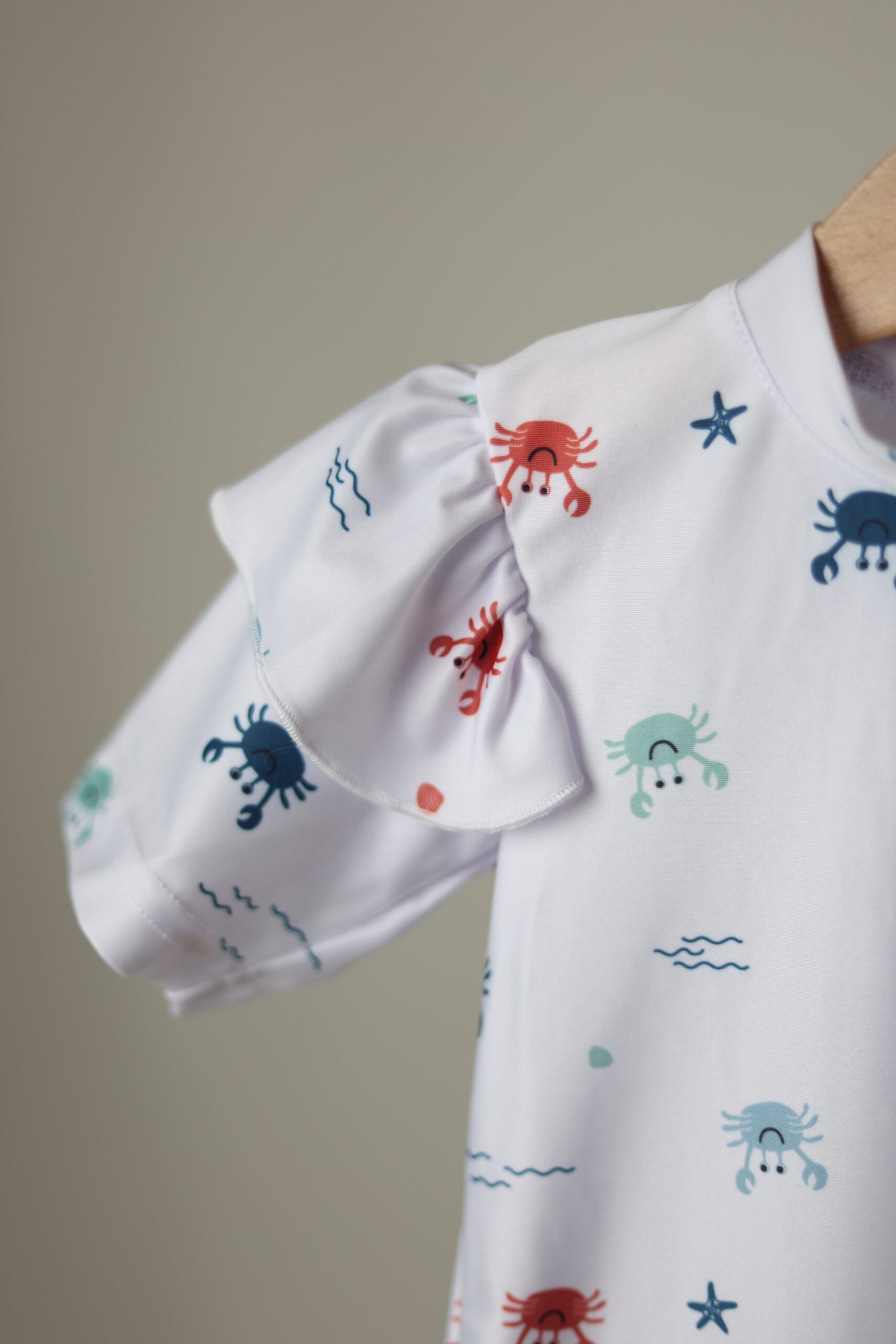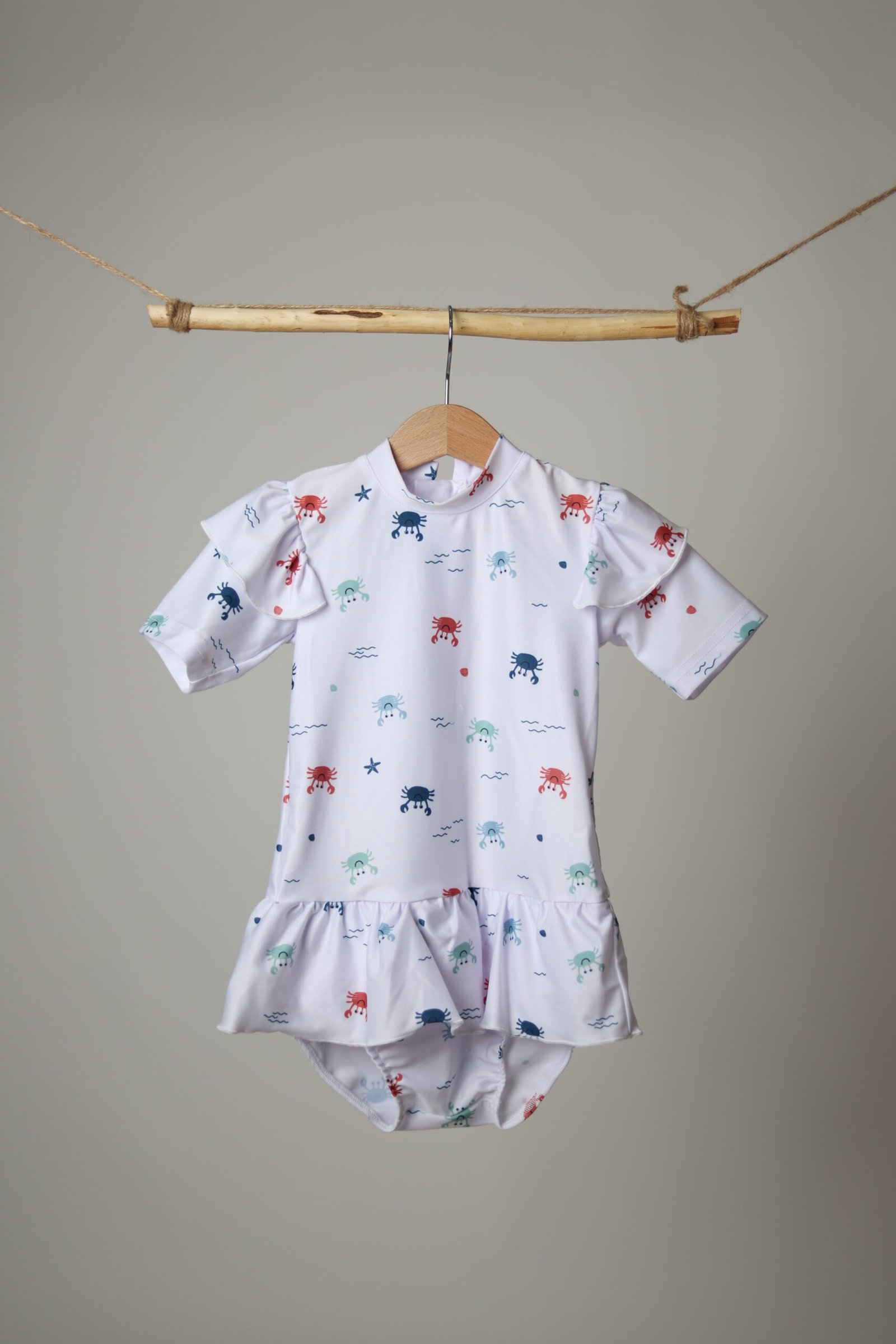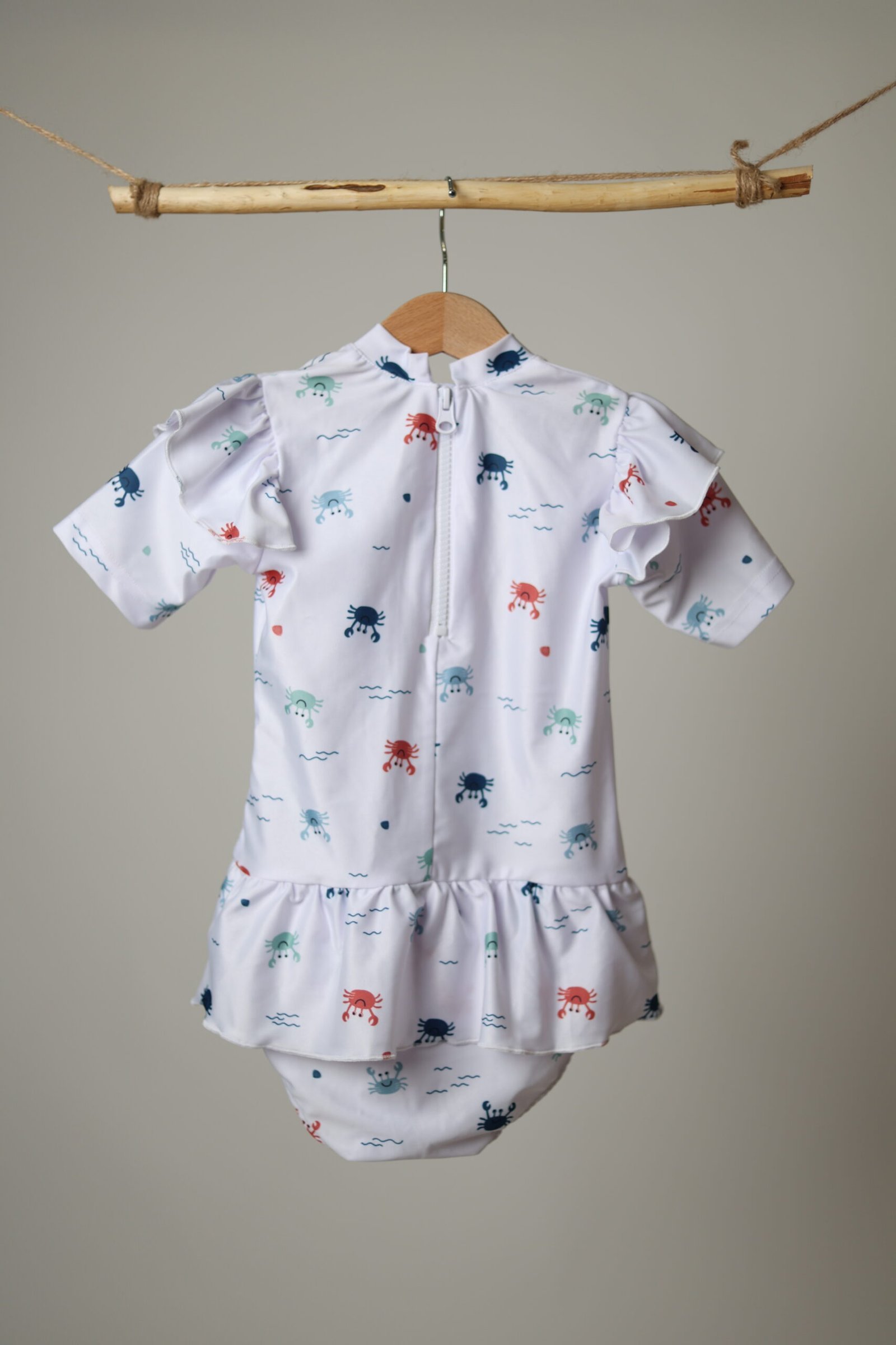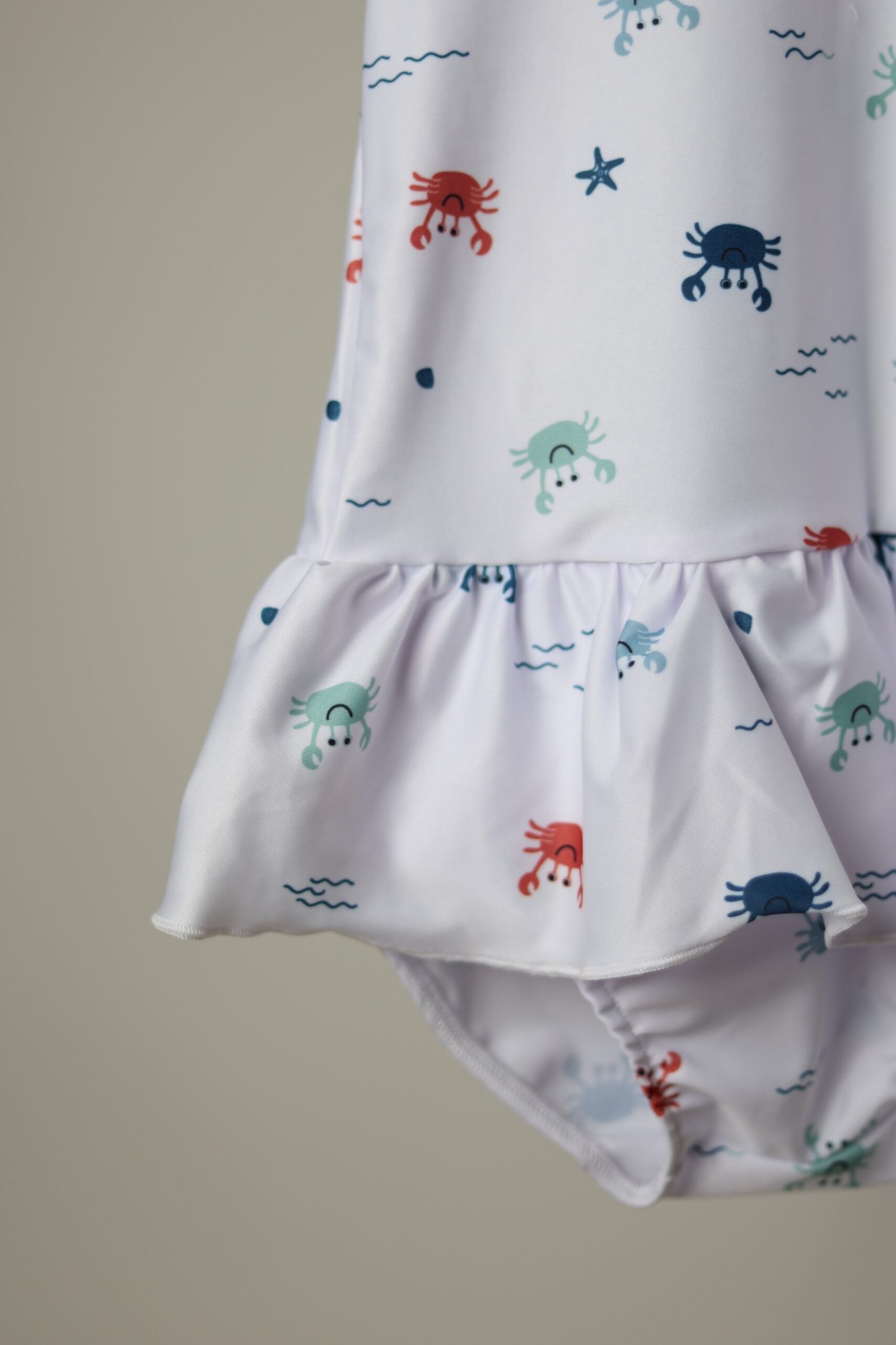 Baltos spalvos, su krabukų, jūros motyvų raštu vienos dalies maudymosi kostiumėlis segamas užtrauktuku nugaroje. Pečiuose dekoratyviniai raukinukai, apačioje – raukinukai-sijonukas.
