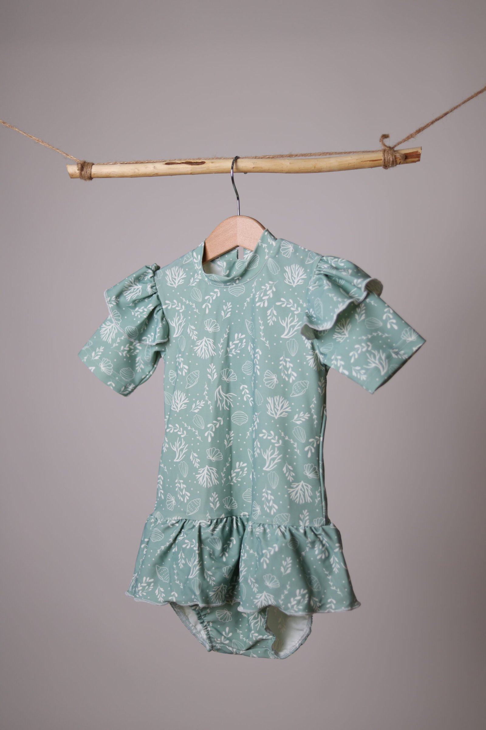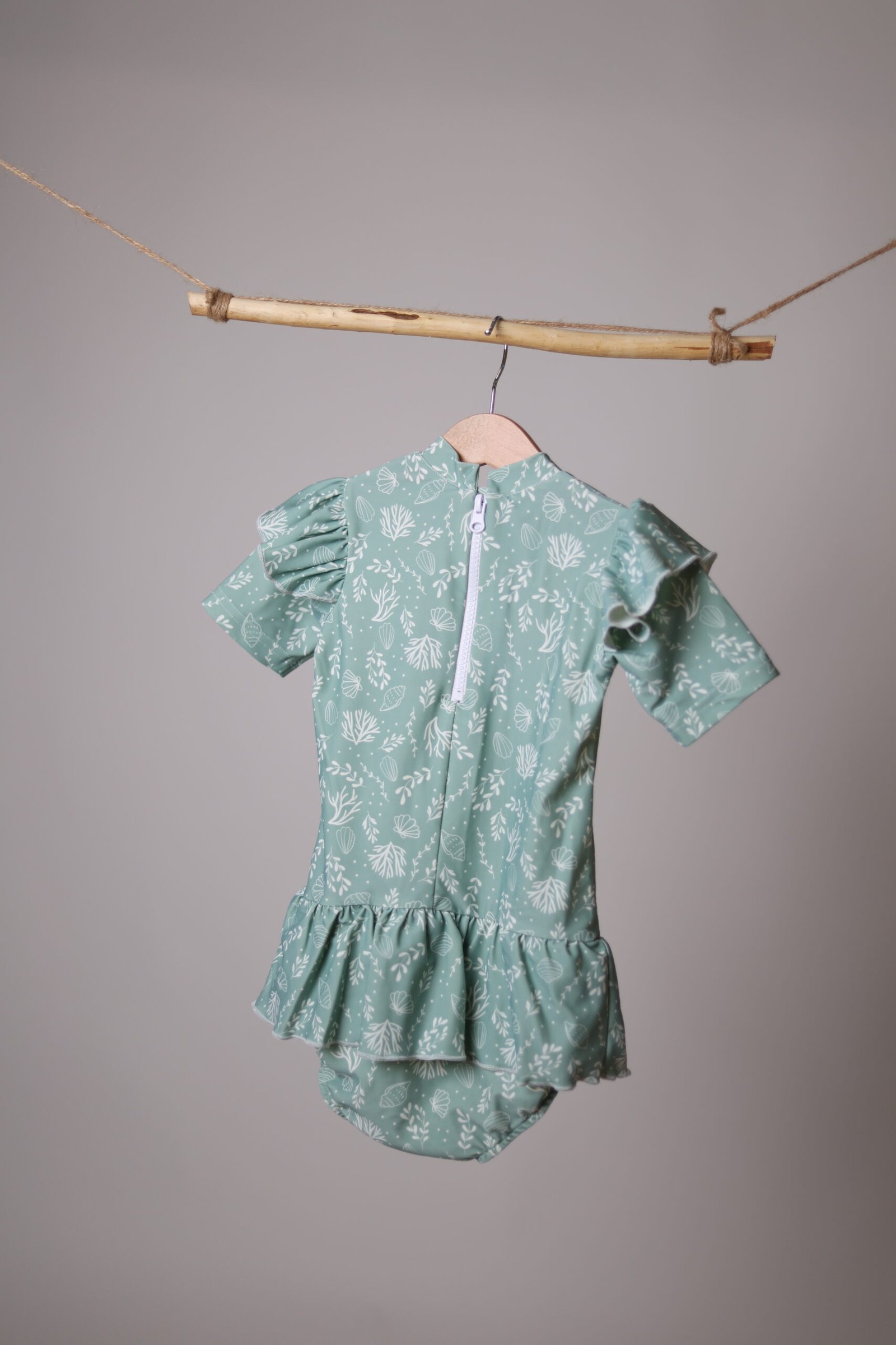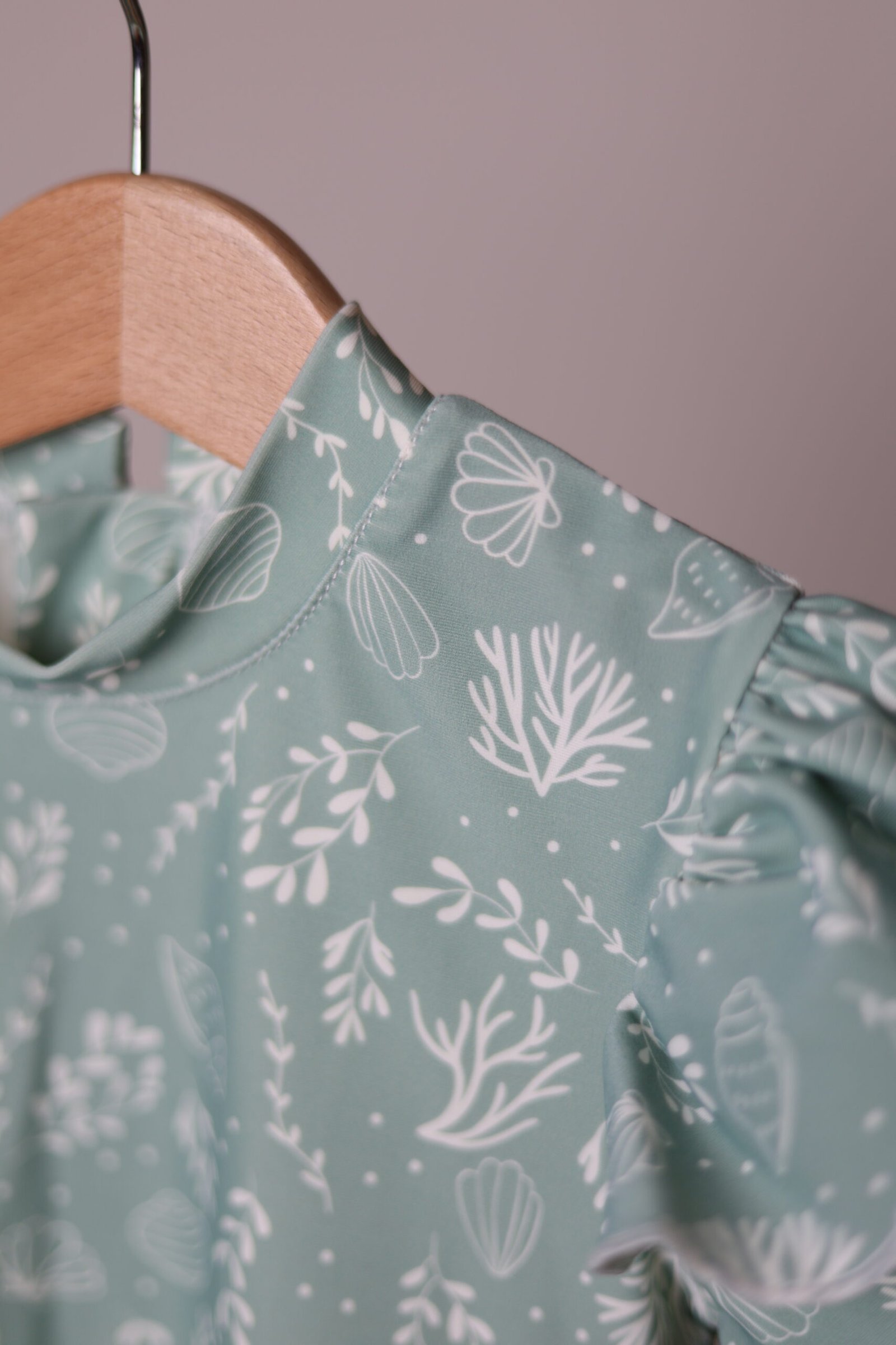 Žalsvos spalvos su smulkiu kriauklyčių, jūros žolyčių rašteliu vienos dalies maudymosi kostiumėlis segamas užtrauktuku nugaroje. Pečiuose dekoratyviniai raukinukai, apačioje – raukinukai-sijonukas. raukinukais.