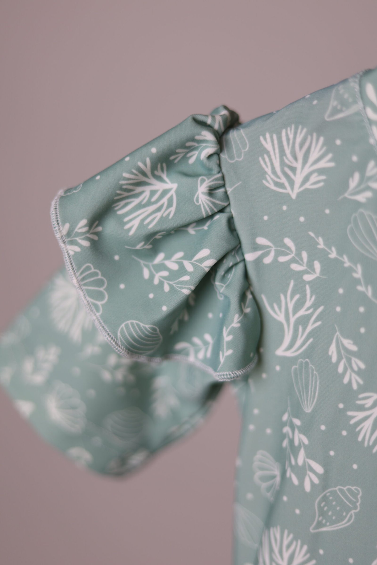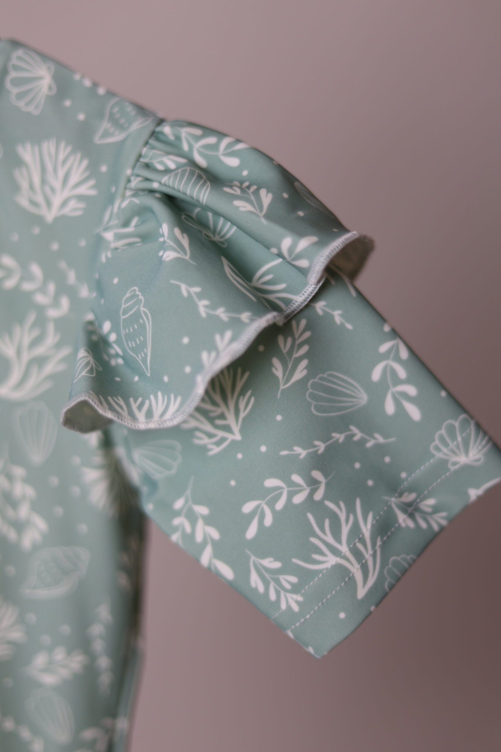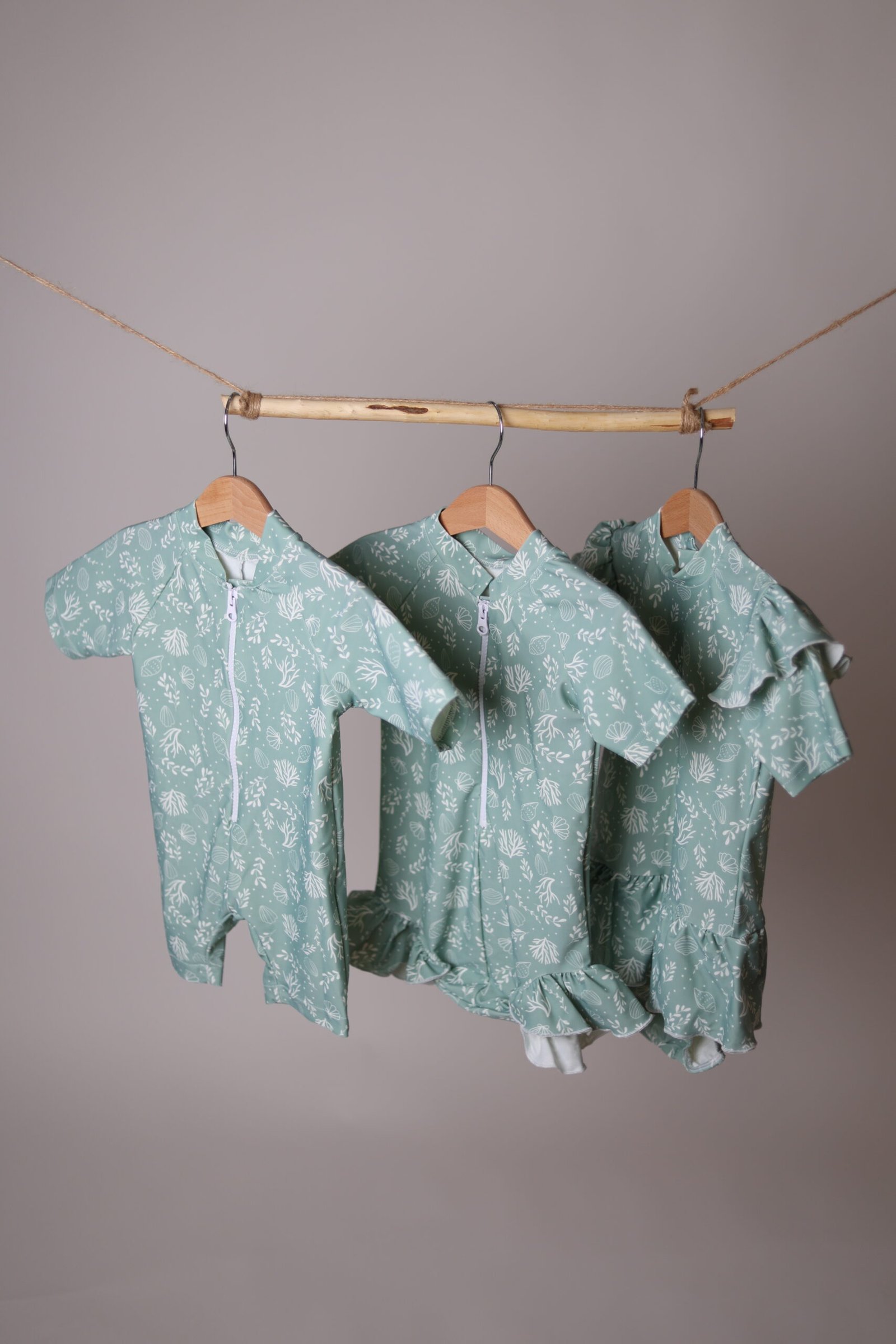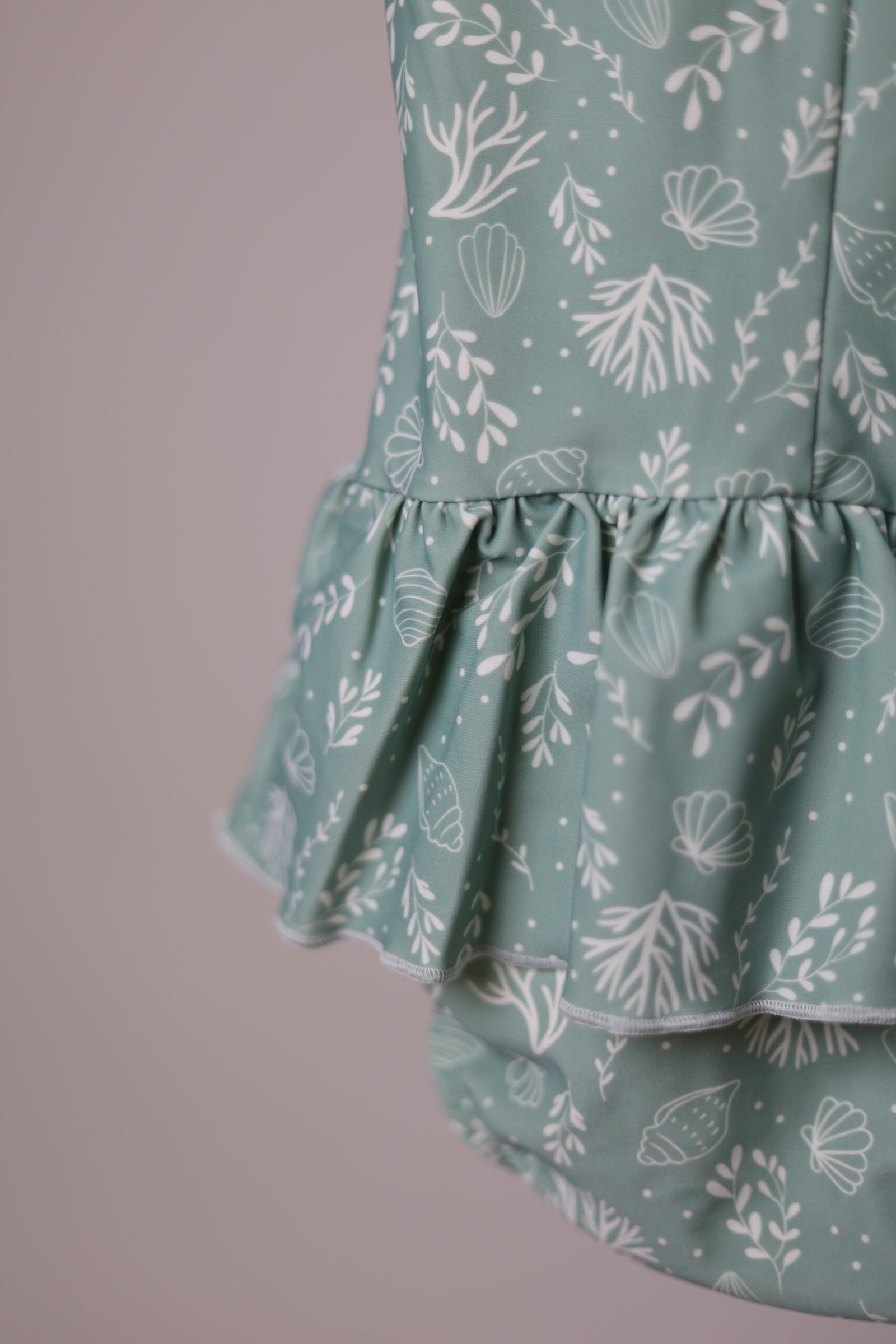 Žalsvos spalvos su smulkiu kriauklyčių, jūros žolyčių rašteliu vienos dalies maudymosi kostiumėlis segamas užtrauktuku nugaroje. Pečiuose dekoratyviniai raukinukai, apačioje – raukinukai-sijonukas. raukinukais.
