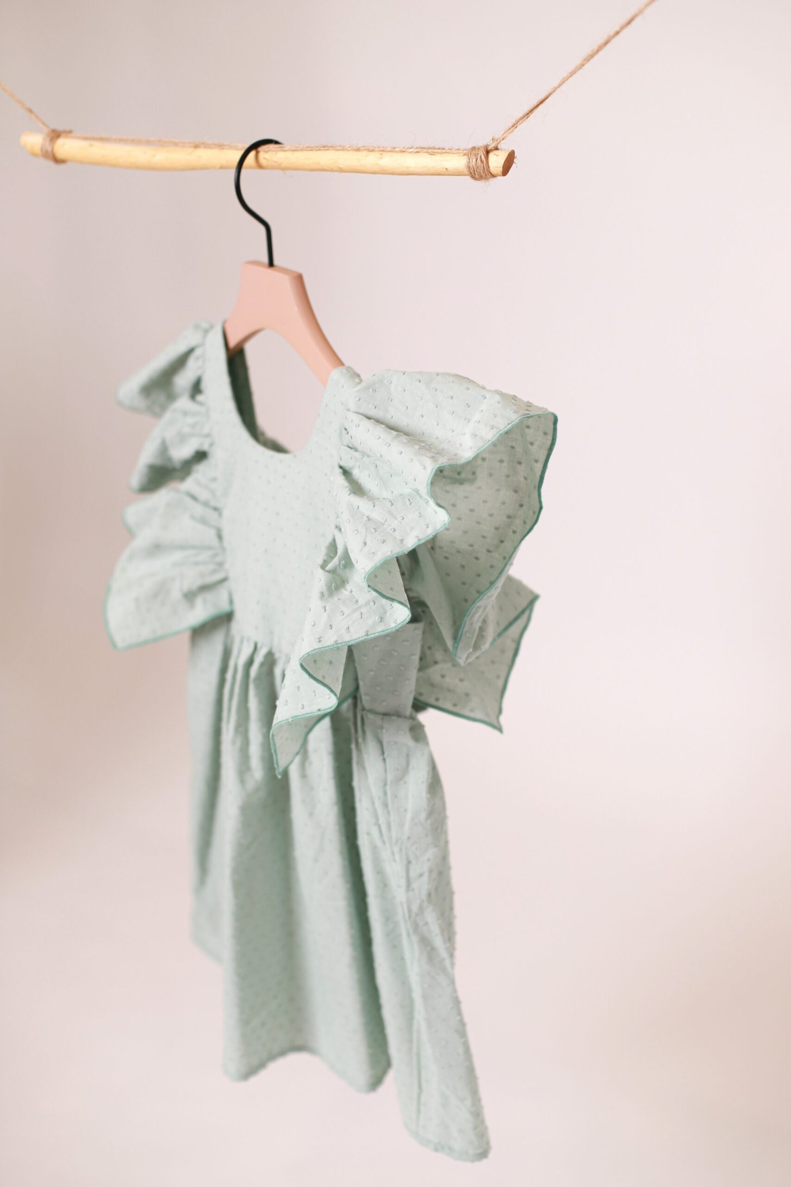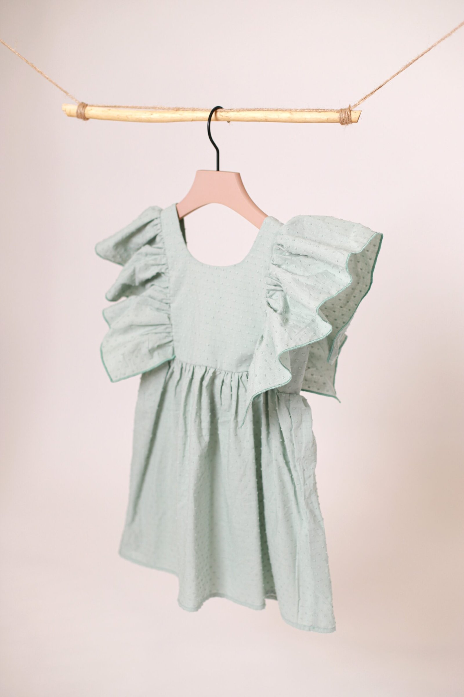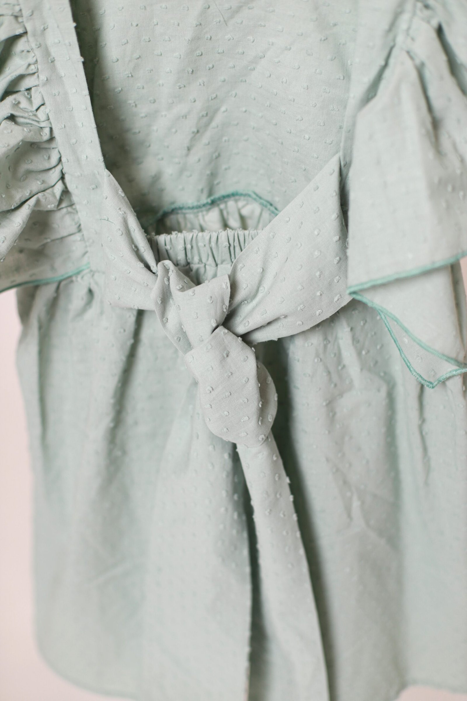 Suknelė plačiomis, lengvai besiplaikstančiomis rankovėmis. Nugaroje rišamas kaspinas, taip pat yra gumelė. Nuo liemens suknelė laisvai krinta, susiklostuoja. Pasiūta iš lengvos medvilnės su smulkiu, struktūriniu taškelių rašteliu.
