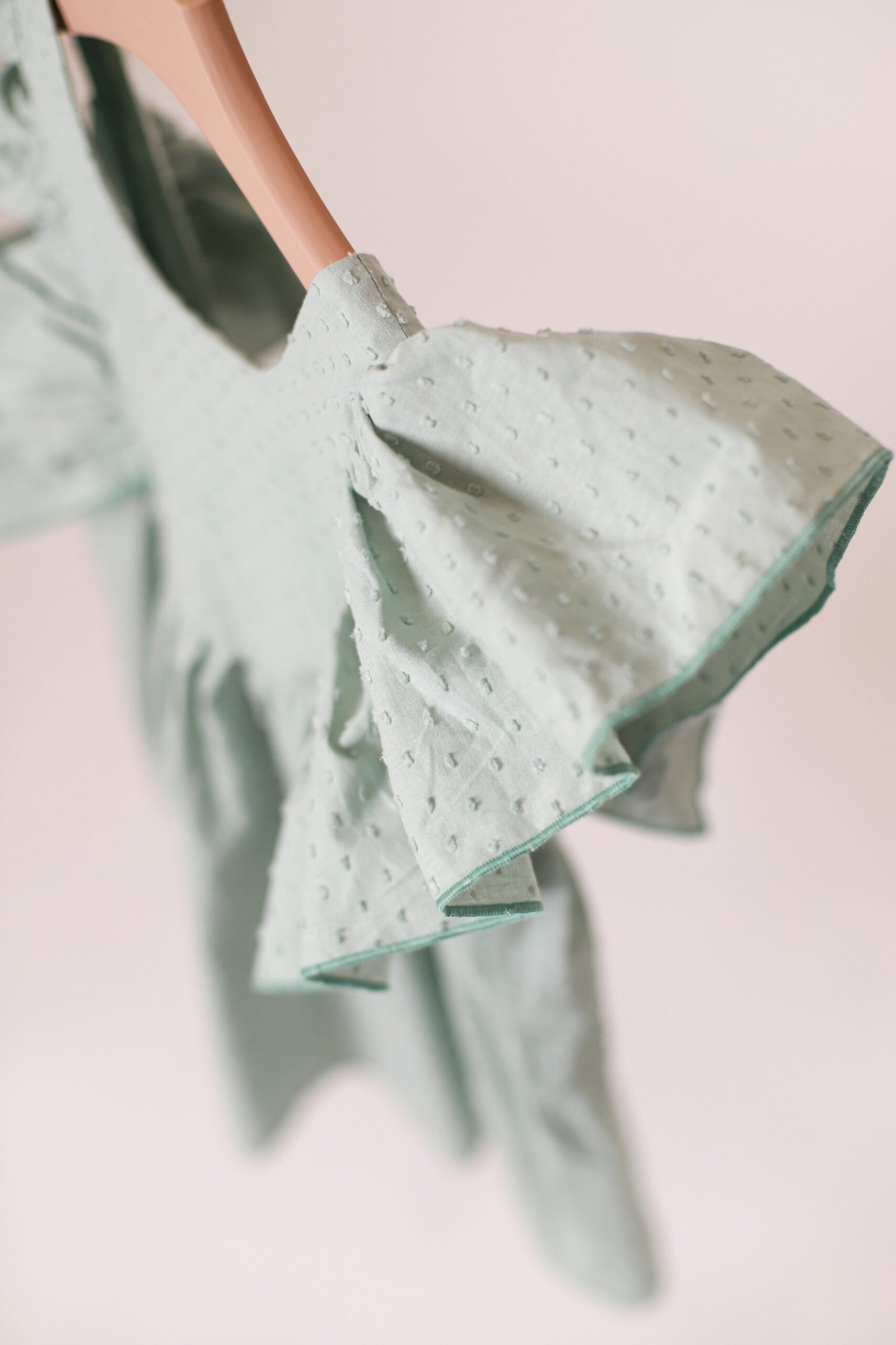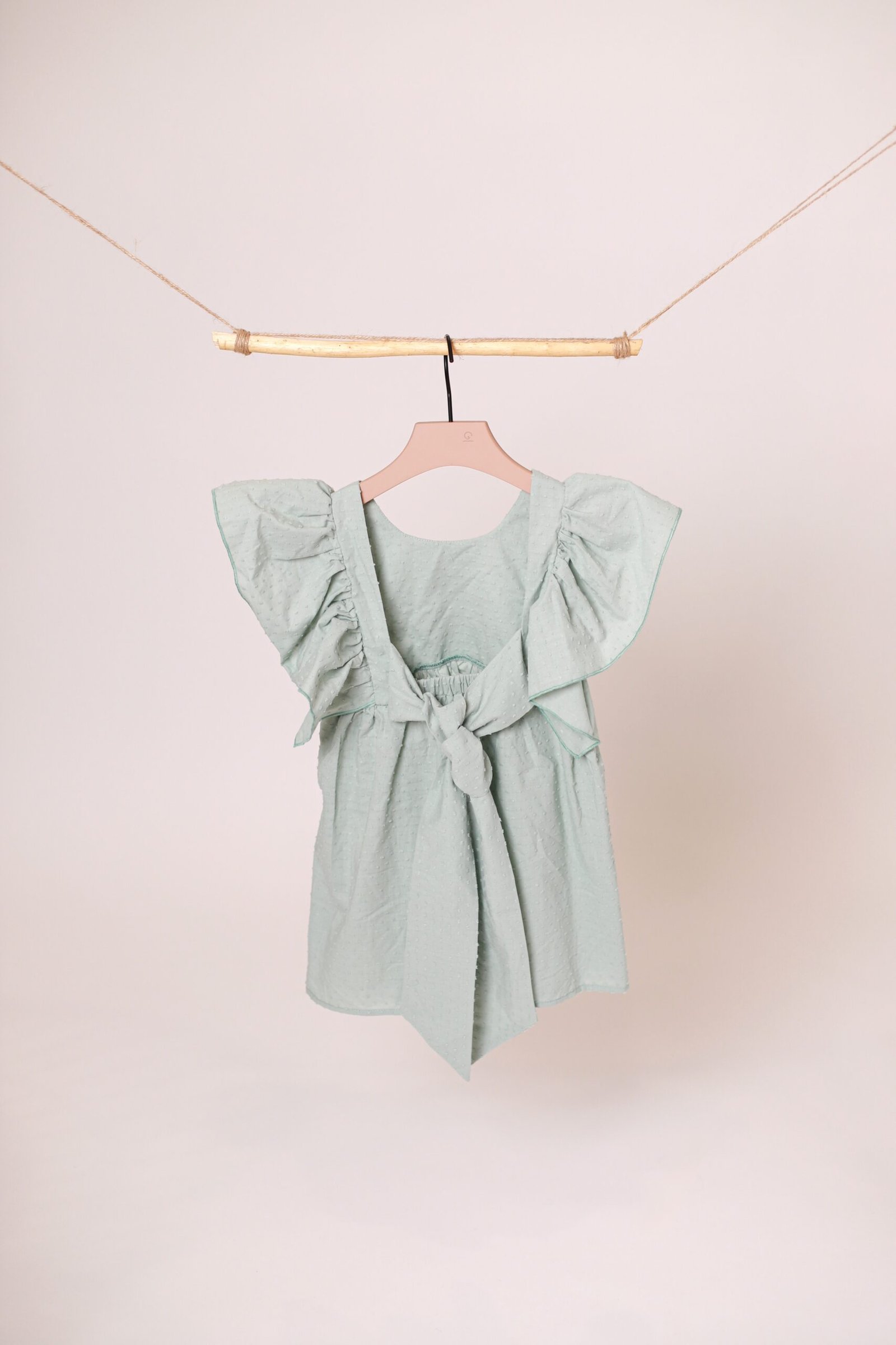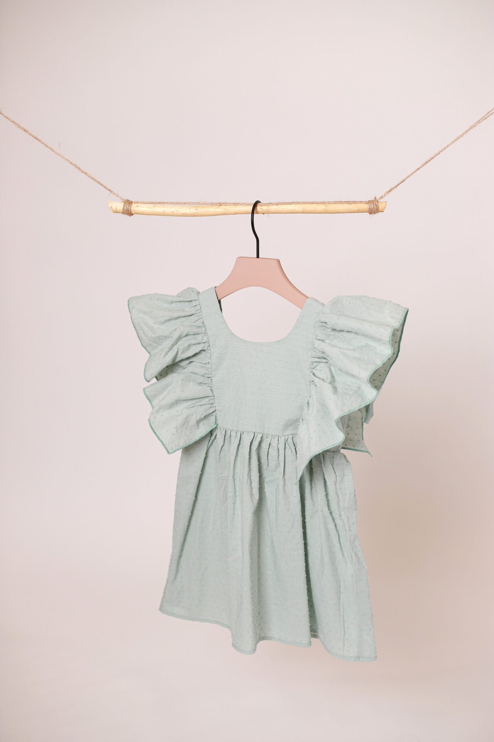 Suknelė plačiomis, lengvai besiplaikstančiomis rankovėmis. Nugaroje rišamas kaspinas, taip pat yra gumelė. Nuo liemens suknelė laisvai krinta, susiklostuoja. Pasiūta iš lengvos medvilnės su smulkiu, struktūriniu taškelių rašteliu.