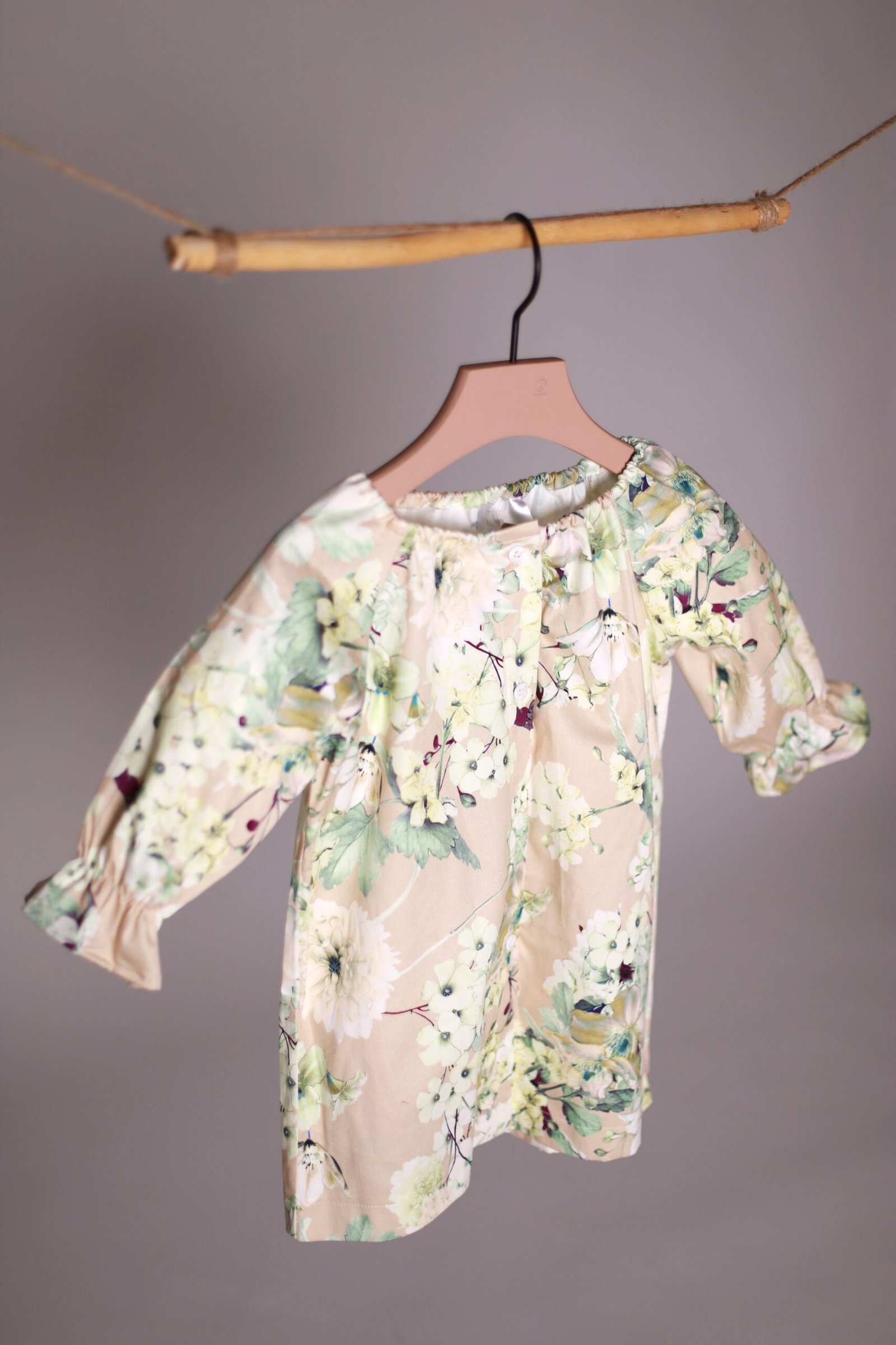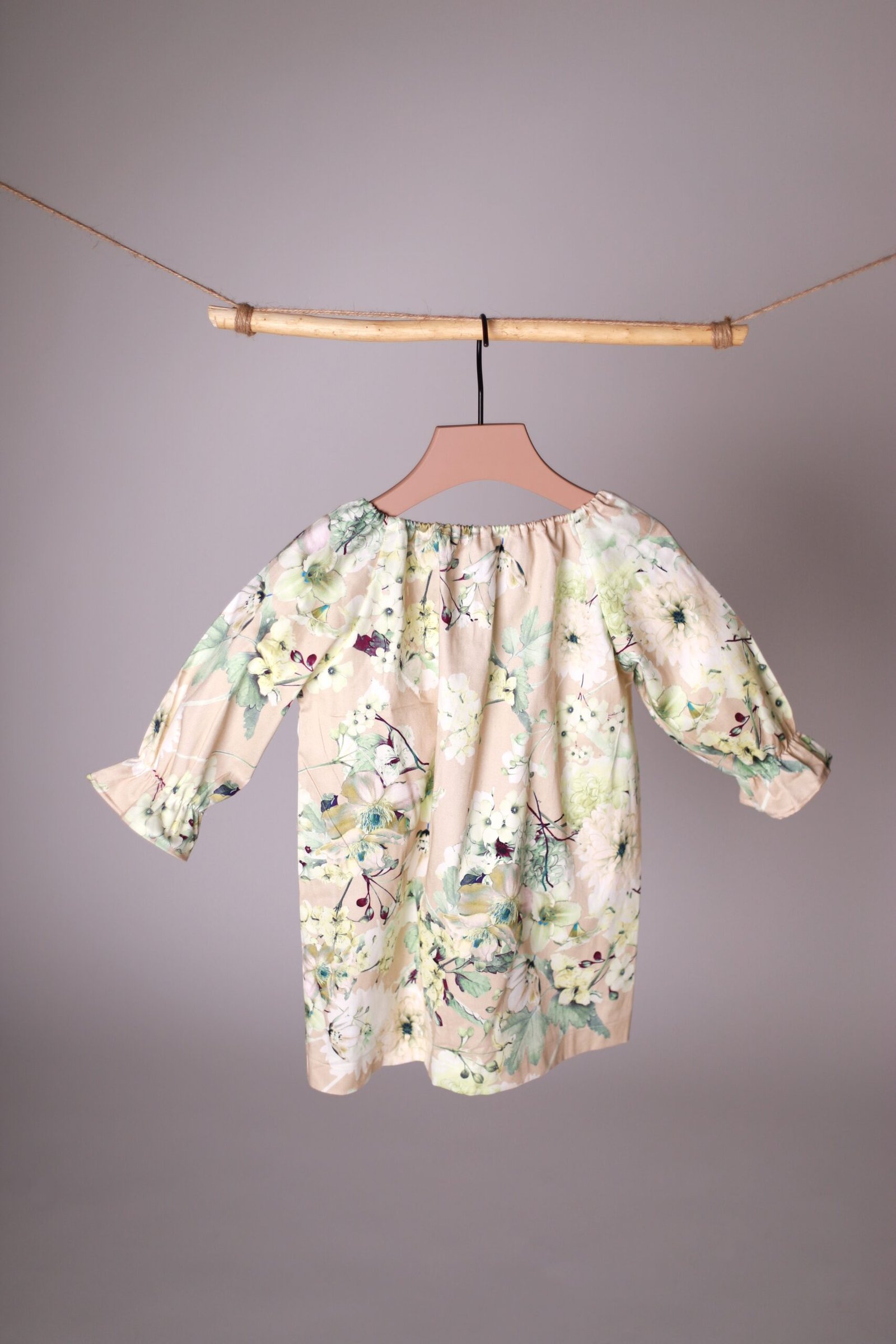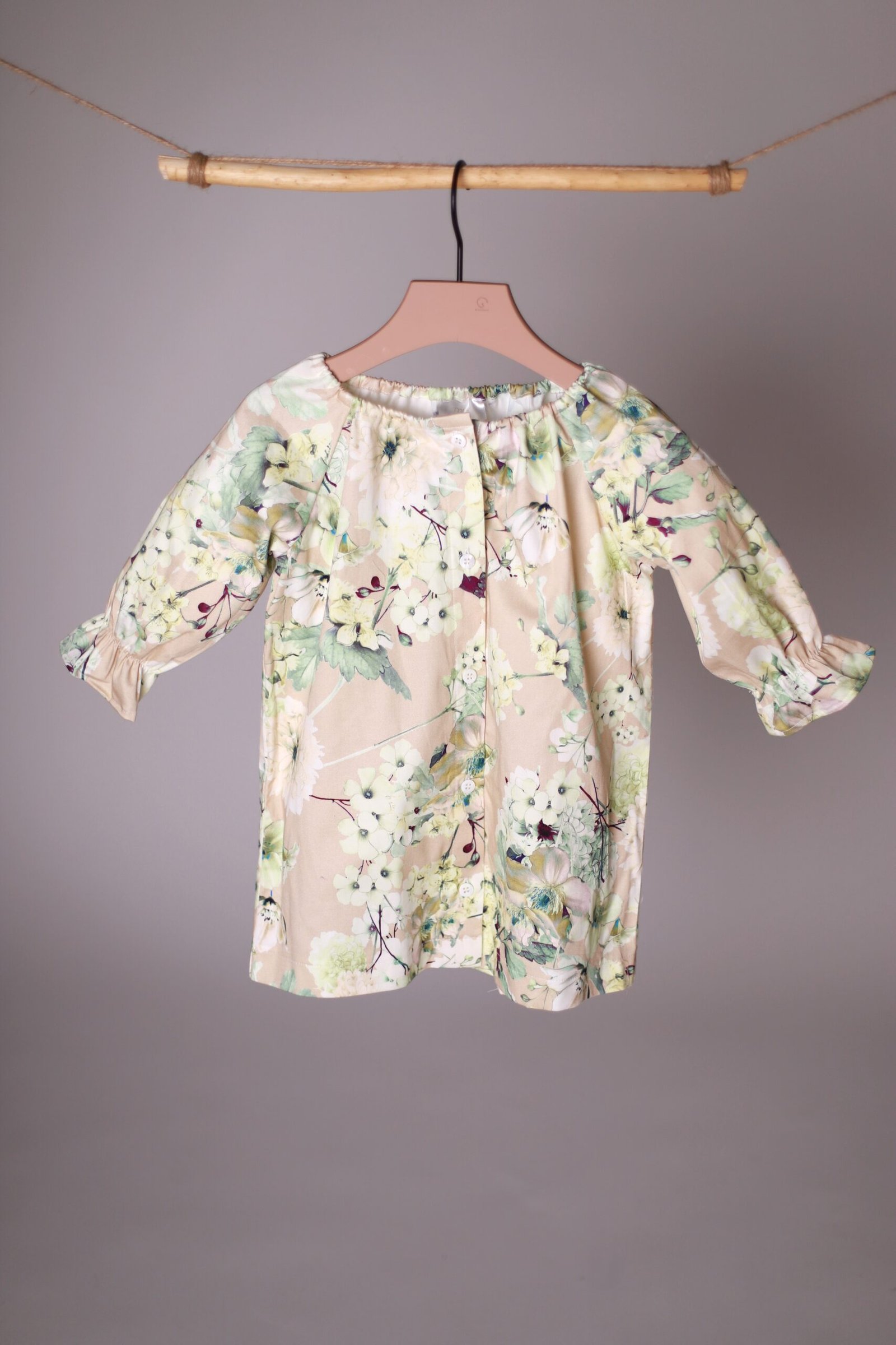 Standesnės medvilnės, švelniai rausvos spalvos su stambesnių gėlių raštu, palaidinė-suknelė. Gumelė ties kaklu ir rankovėmis. Reglano stiliaus rankovėmis, tad nevaržys judesių ir paaugus vaikučiui. Puikiai tiks nešiojama kaip trumpesnė suknelė mergaitei, o paūgėjus – palaidinė su šortukais, kelnėmis ar sijonuku.