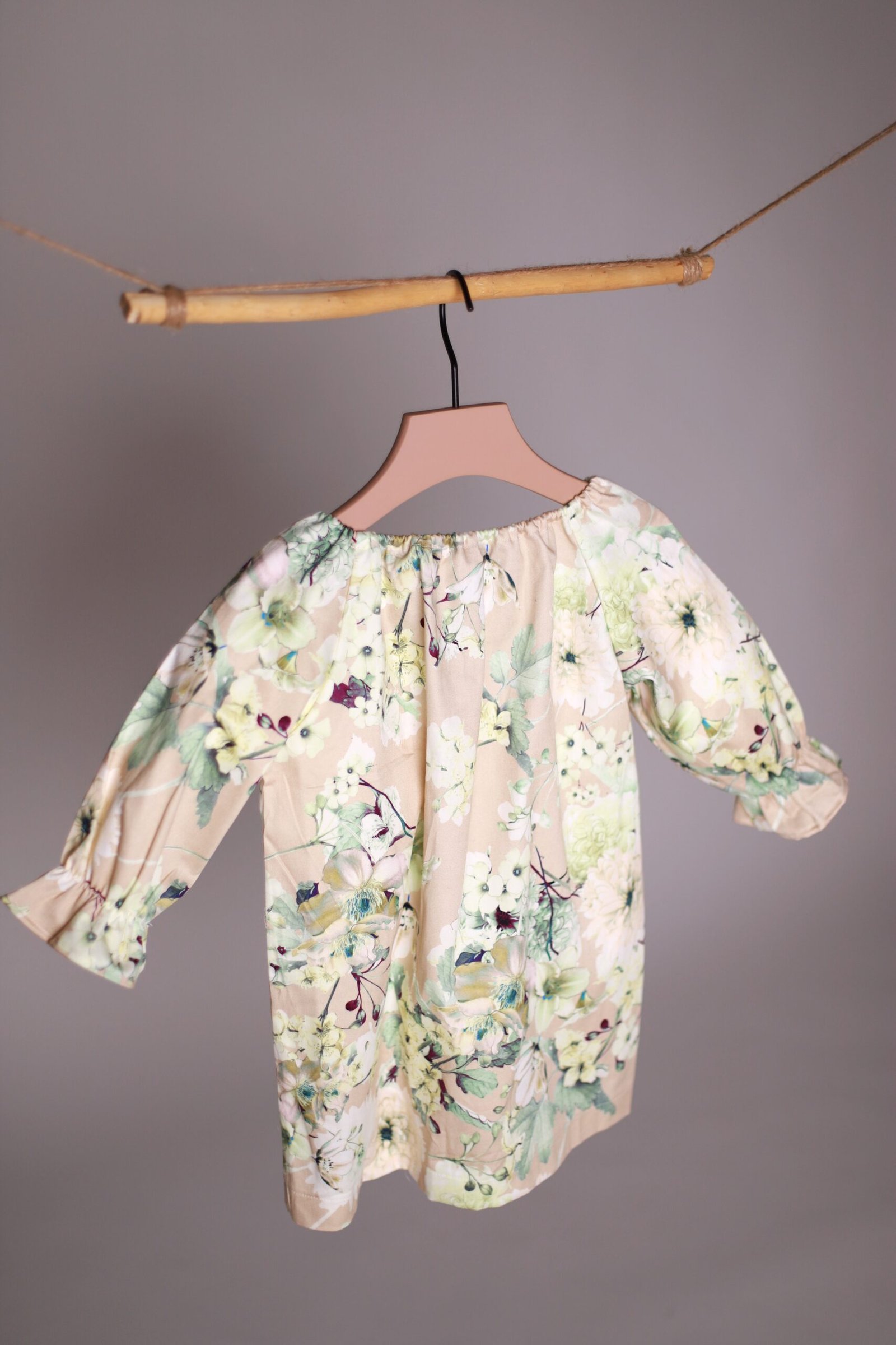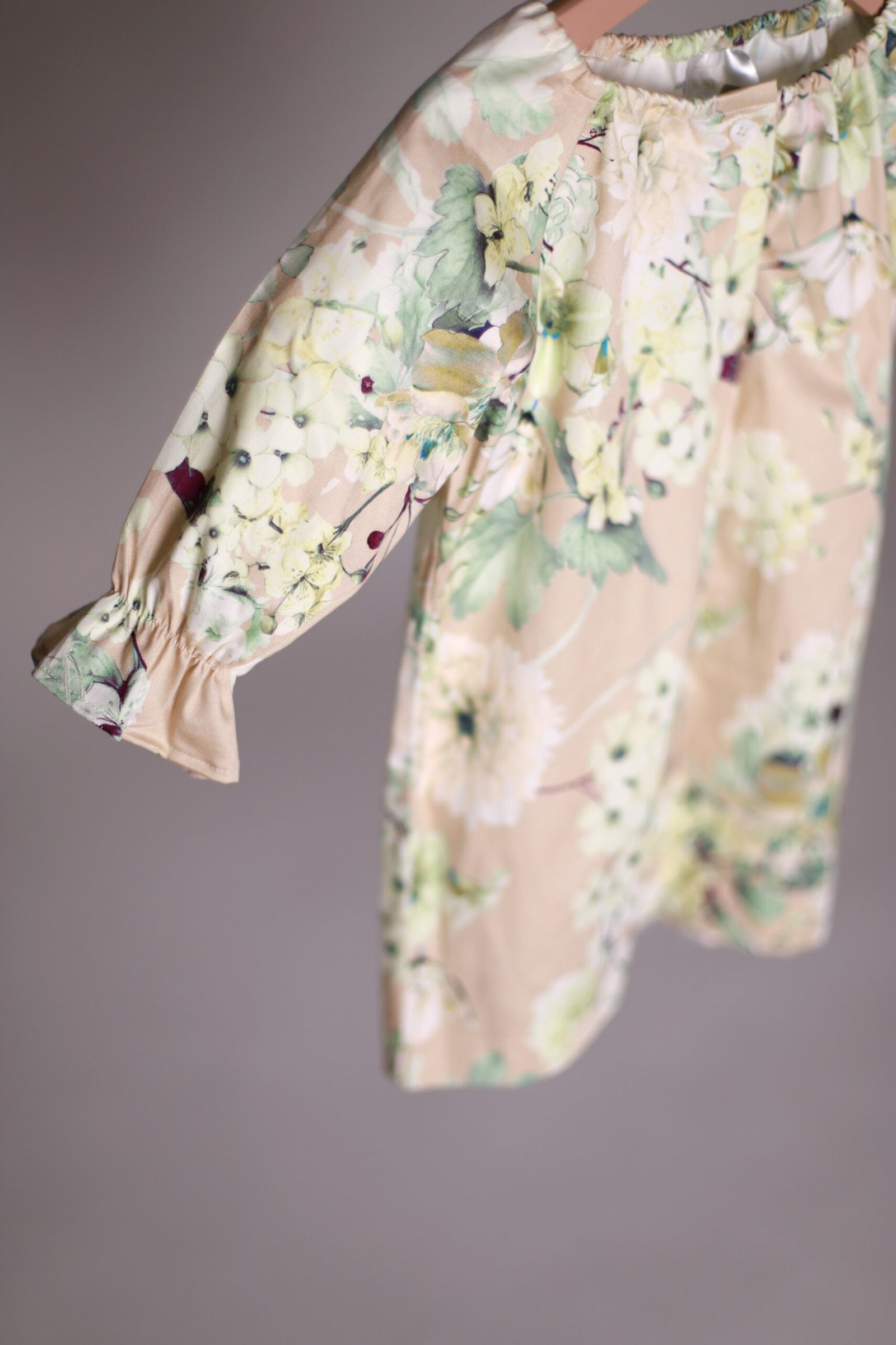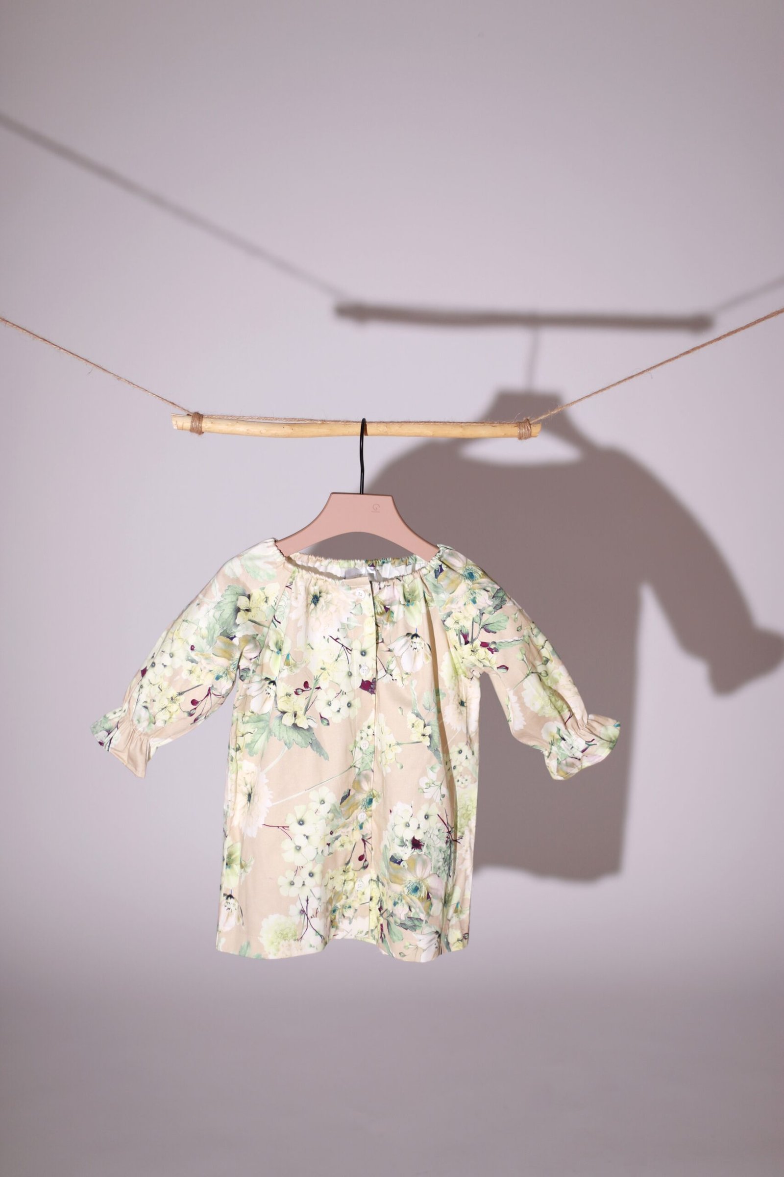 Standesnės medvilnės, švelniai rausvos spalvos su stambesnių gėlių raštu, palaidinė-suknelė. Gumelė ties kaklu ir rankovėmis. Reglano stiliaus rankovėmis, tad nevaržys judesių ir paaugus vaikučiui. Puikiai tiks nešiojama kaip trumpesnė suknelė mergaitei, o paūgėjus – palaidinė su šortukais, kelnėmis ar sijonuku.
