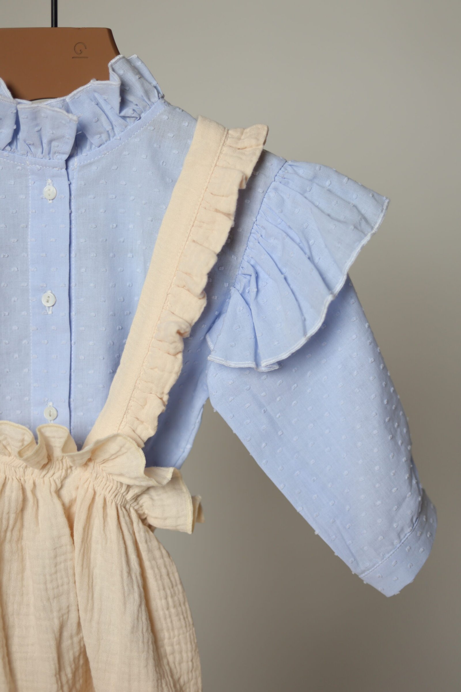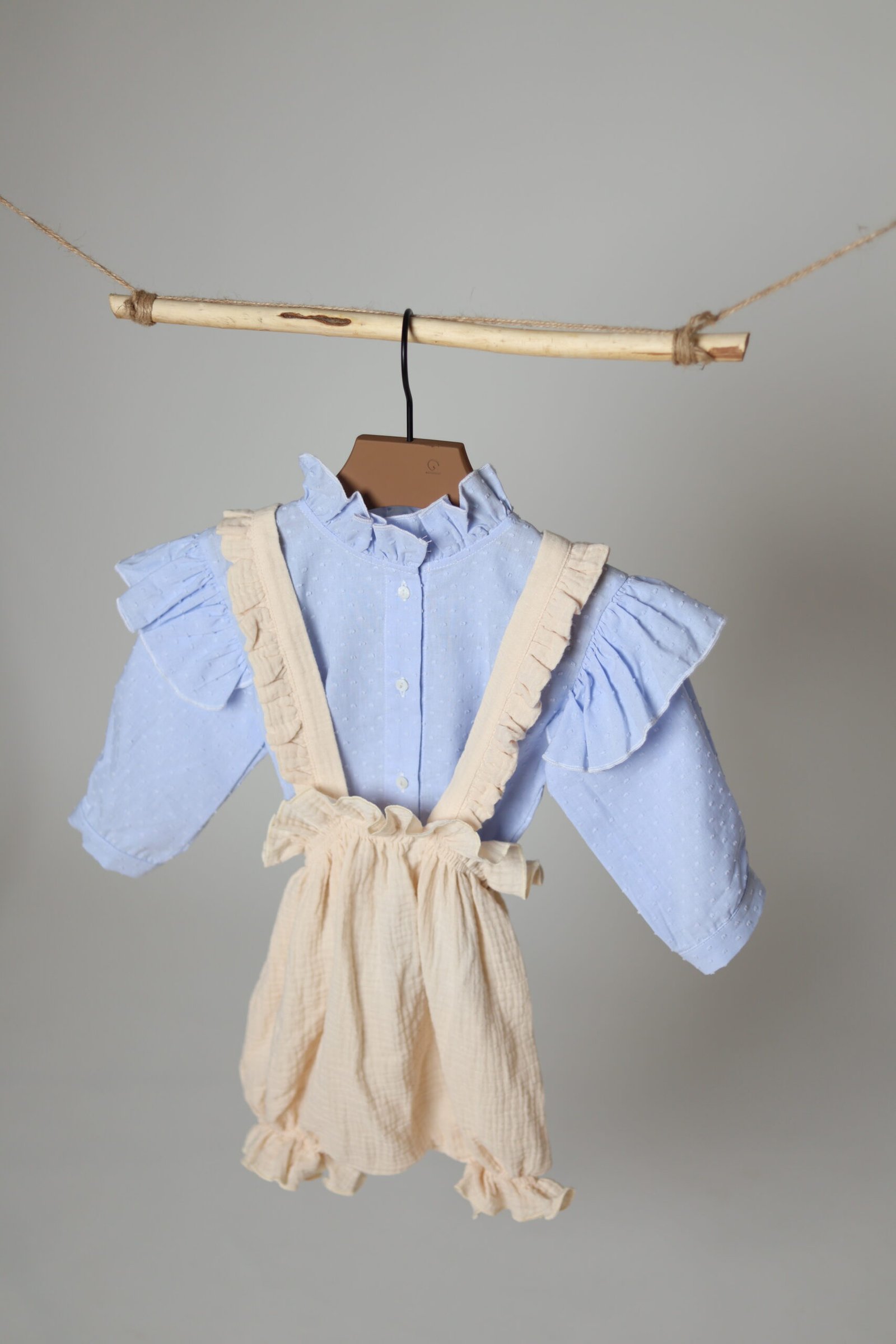 Aukšto liemens muslino šortai su itin tampriomis įsiūtomis gumelėmis ties liemeniu ir kojytėmis. Pūsto modelio, petnešėles galima nusegti, segti kryžiuotas arba tiesias.