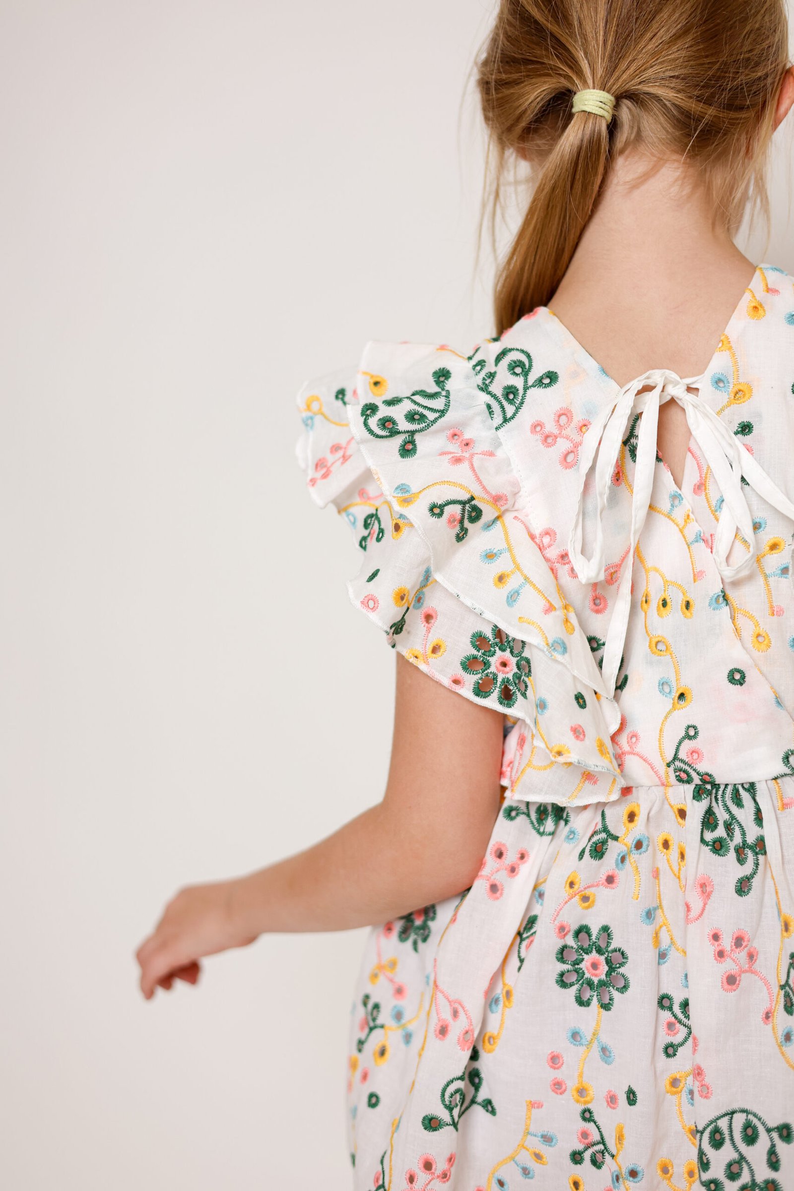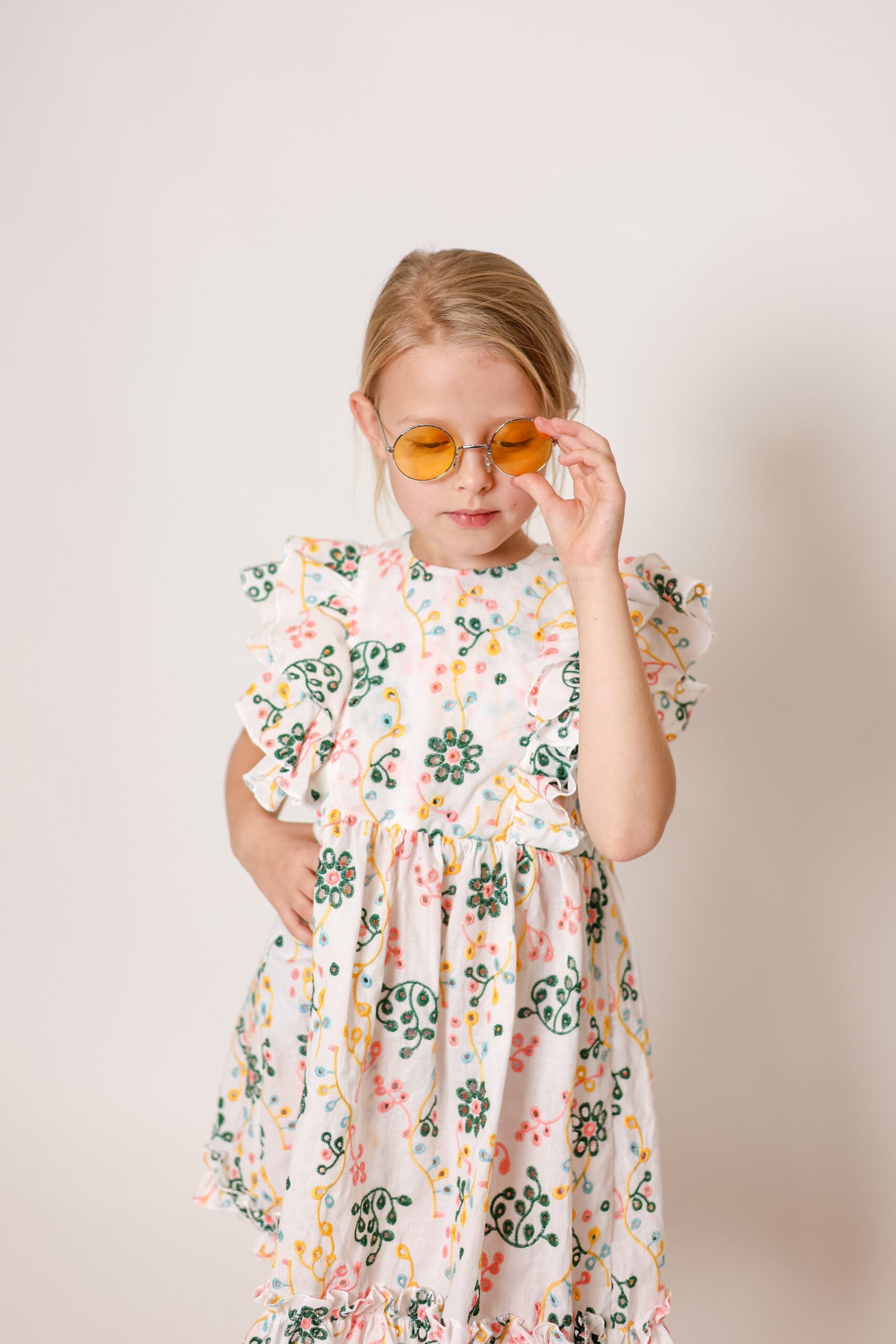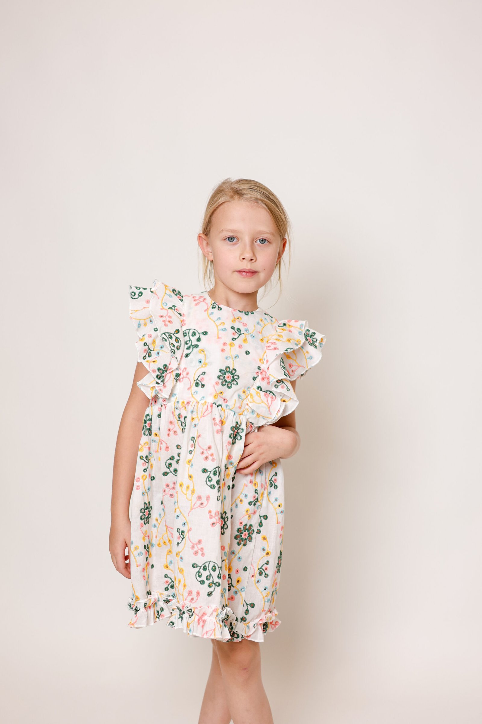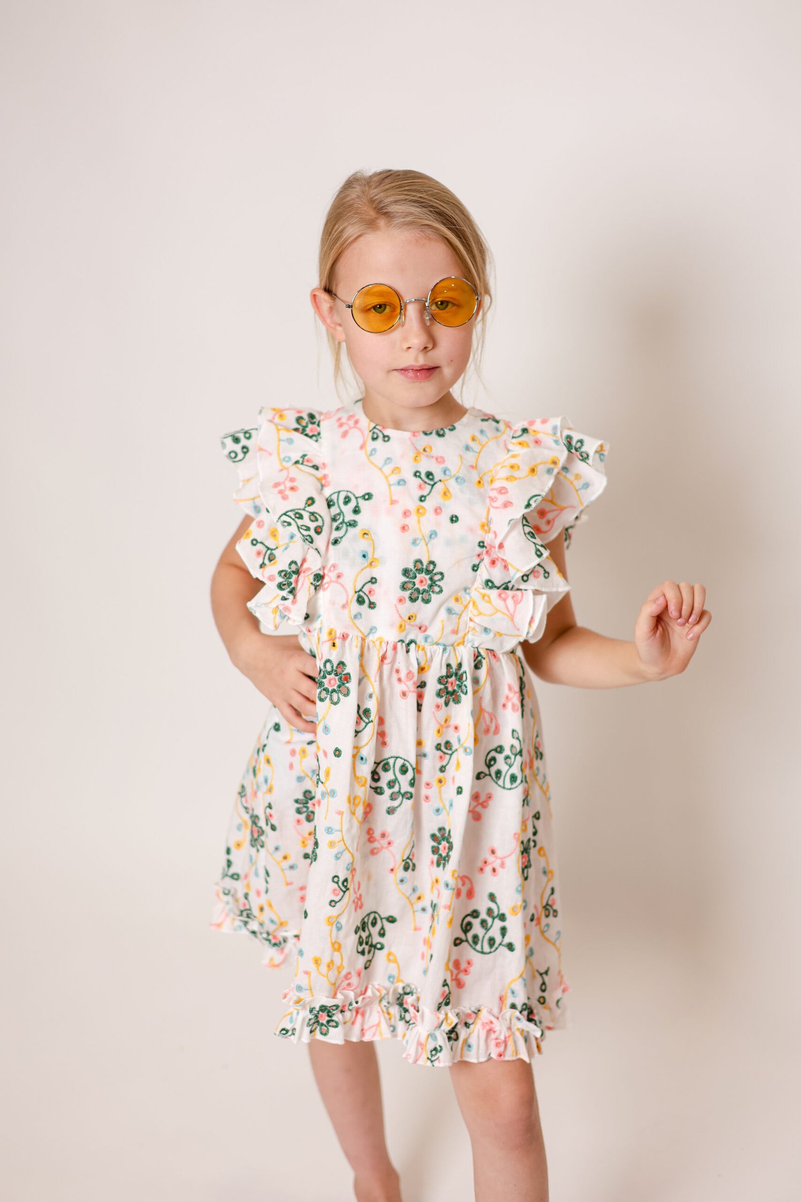Laisvo modelio suknelė su lengvomis raukinukų rankovėmis, dailiai krintančiomis užsidėjus. Rišama nugaroje, apačioje – raukinukas. Sukonstruota taip, jog būtų tinkama ir nešiojama ne vienam dydžiui – nuo midi ilgio iki trumpesnės, tačiau taip pat lengvai ir laisvai krintančios, augančios kartu su mergaite. Pasiūta iš labai žavios siuvinėtos medvilnės audinio.