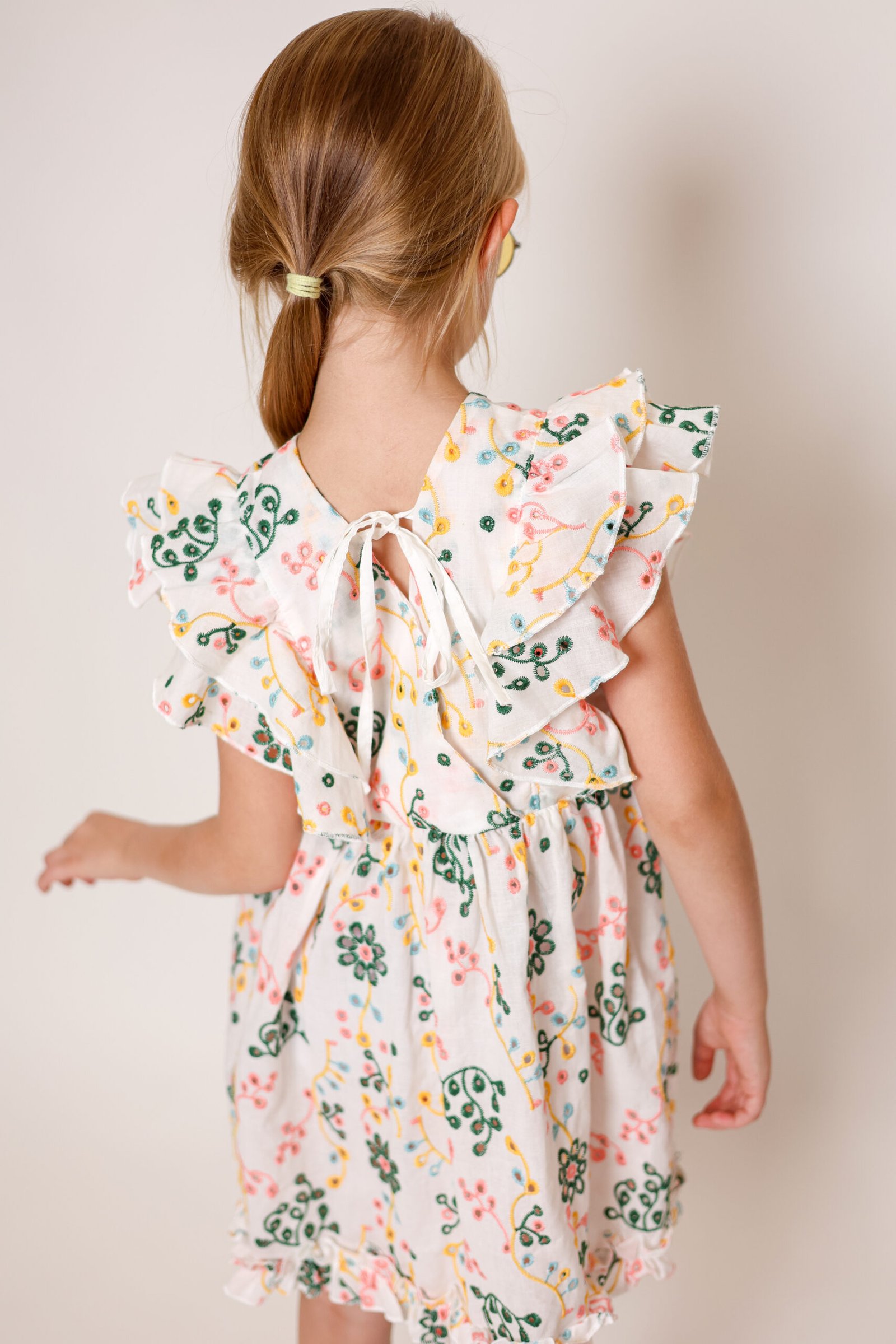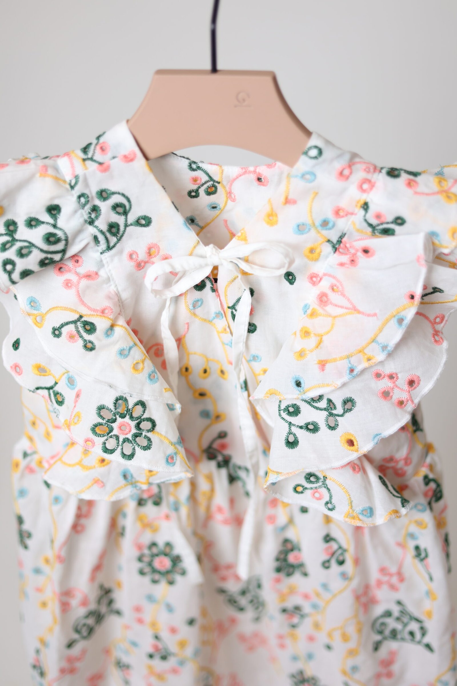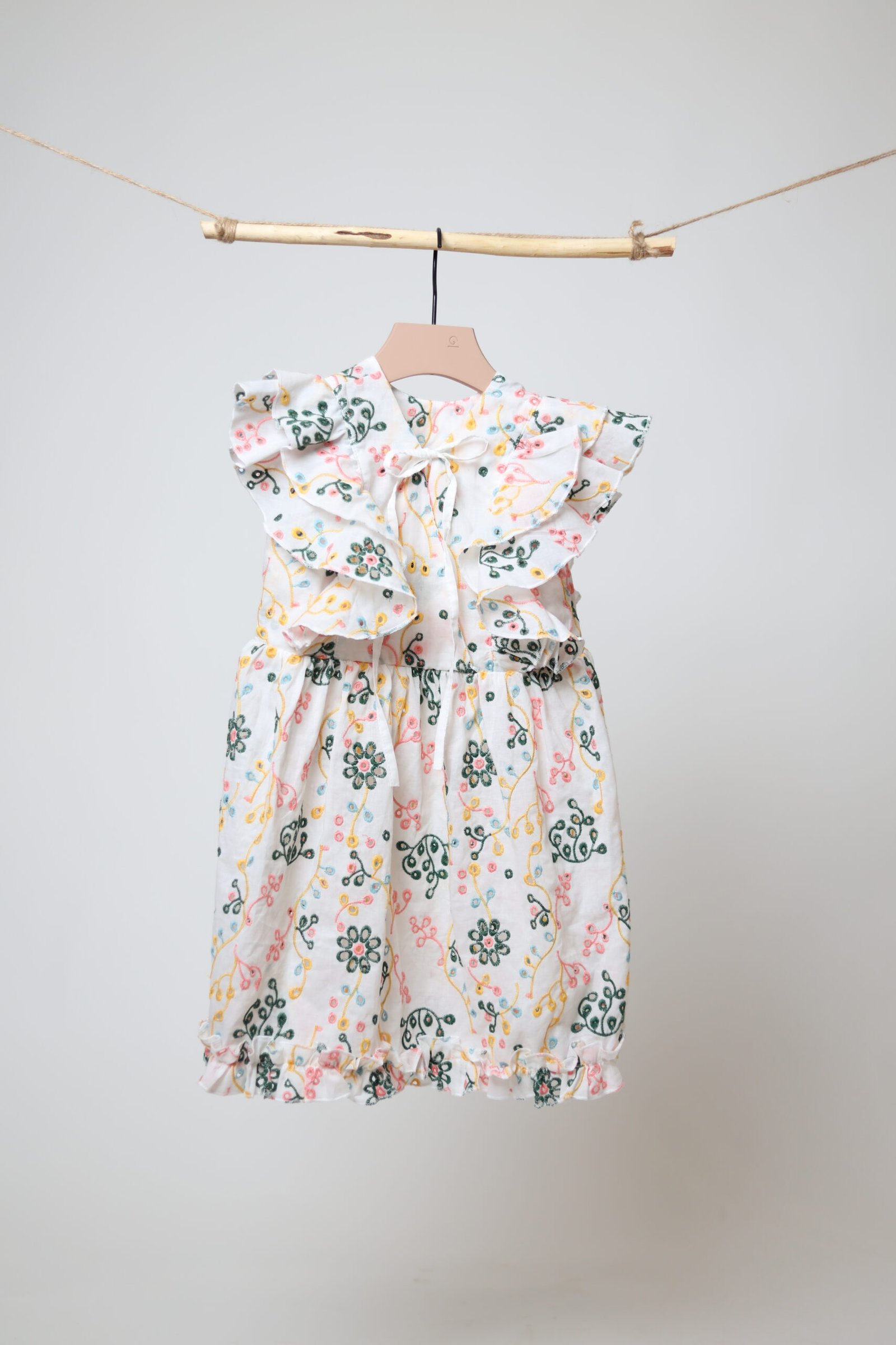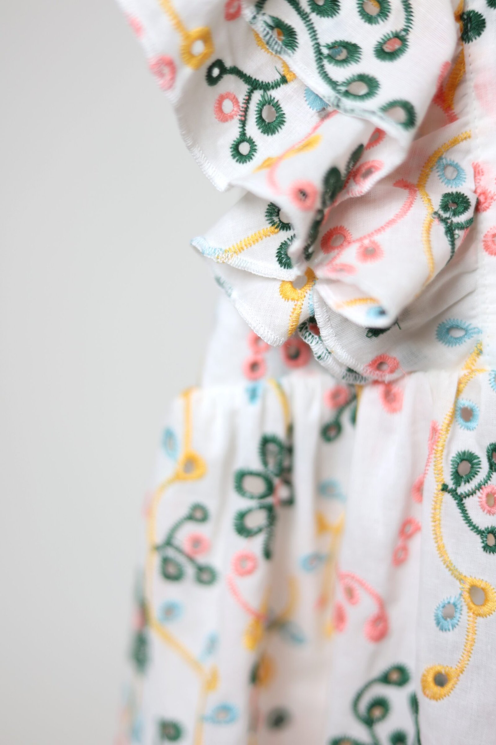 Laisvo modelio suknelė su lengvomis raukinukų rankovėmis, dailiai krintančiomis užsidėjus. Rišama nugaroje, apačioje – raukinukas. Sukonstruota taip, jog būtų tinkama ir nešiojama ne vienam dydžiui – nuo midi ilgio iki trumpesnės, tačiau taip pat lengvai ir laisvai krintančios, augančios kartu su mergaite. Pasiūta iš labai žavios siuvinėtos medvilnės audinio.