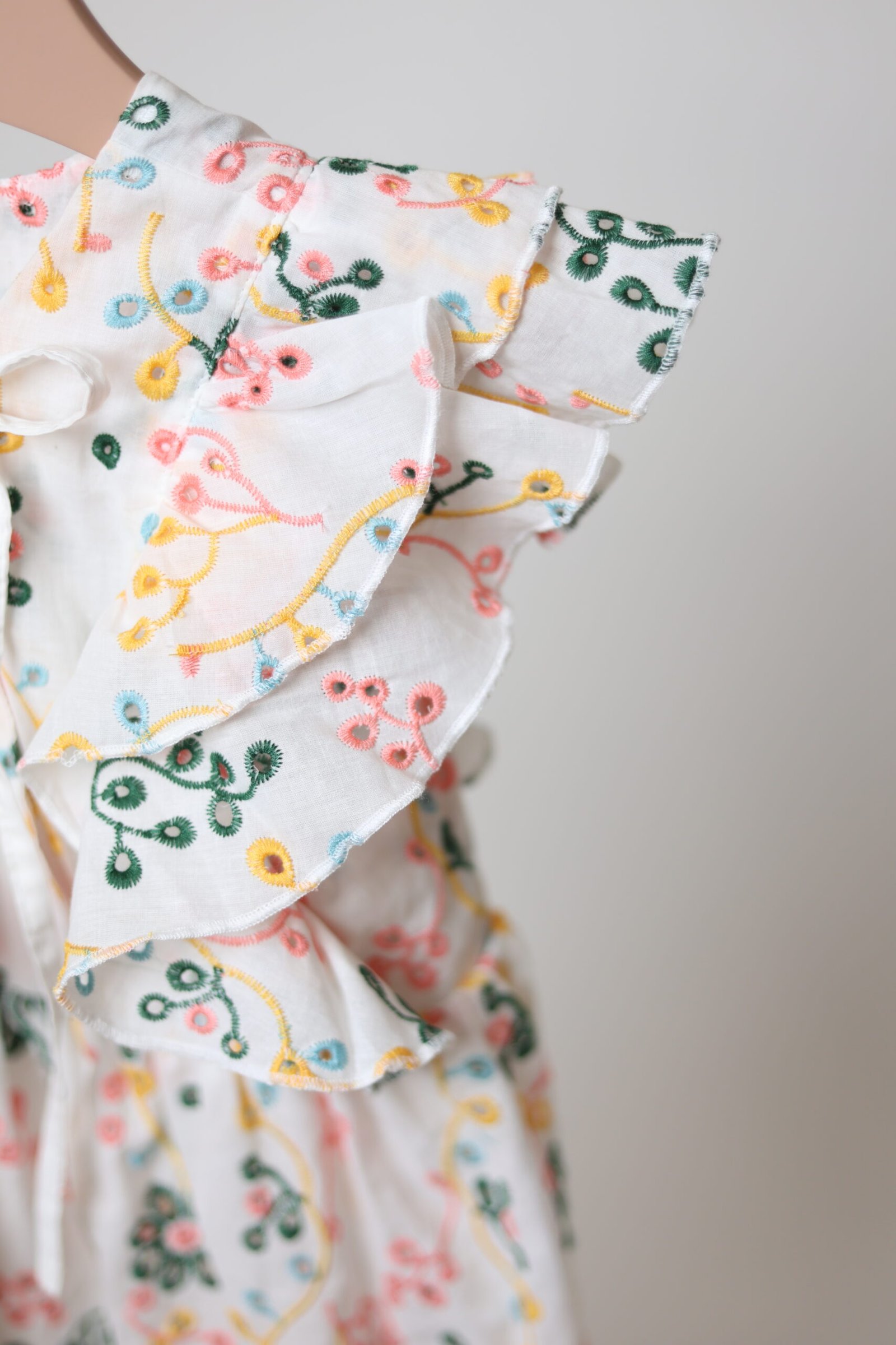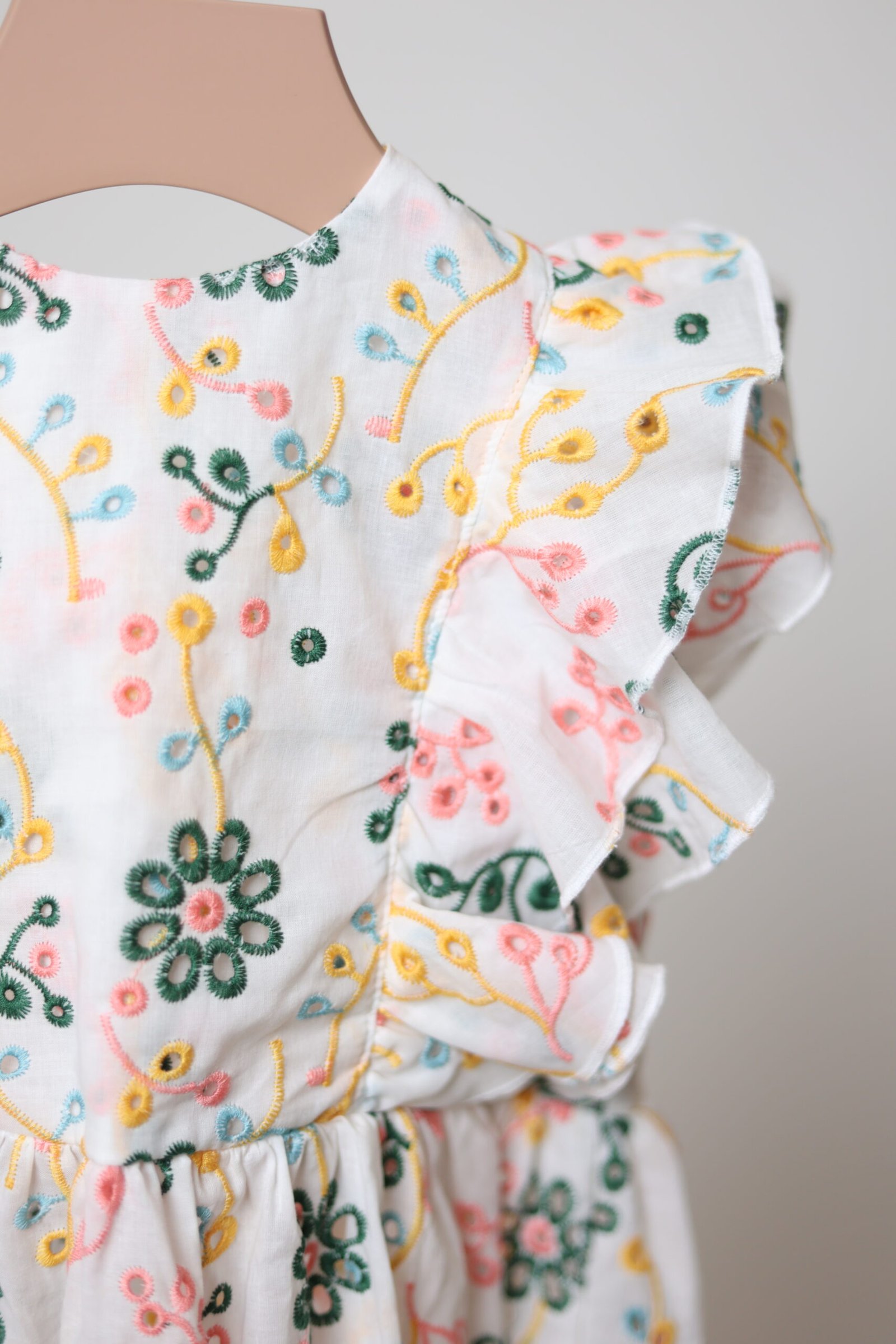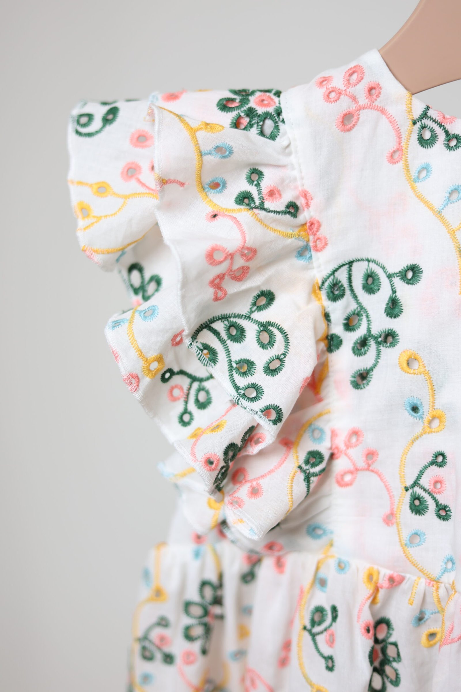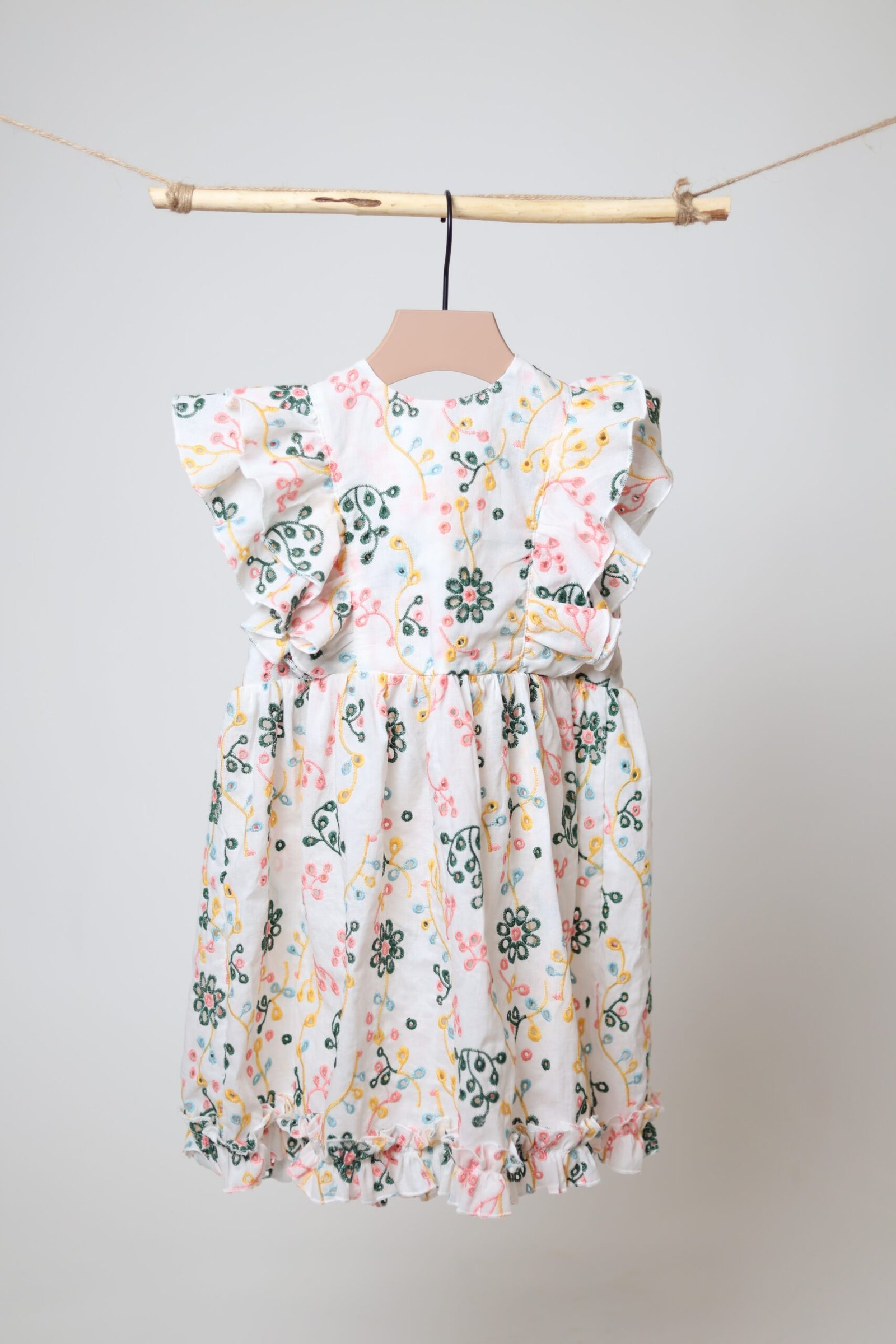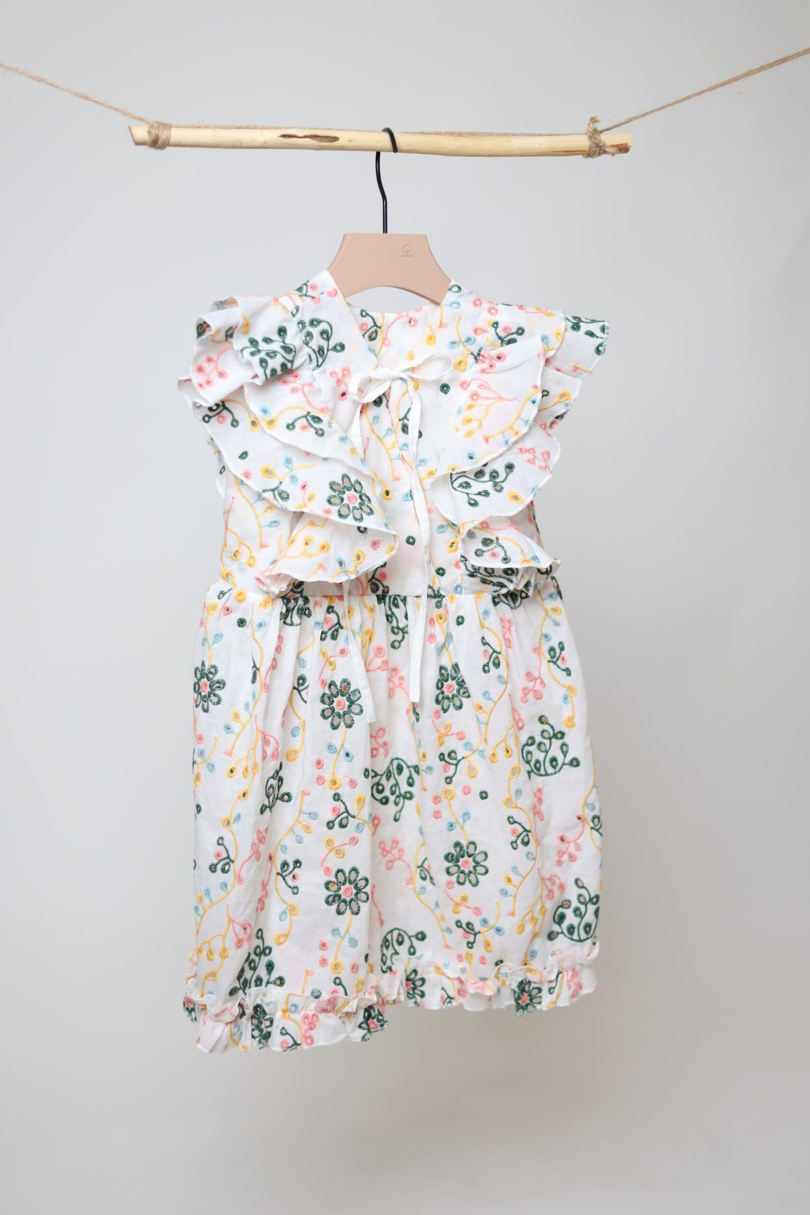 Laisvo modelio suknelė su lengvomis raukinukų rankovėmis, dailiai krintančiomis užsidėjus. Rišama nugaroje, apačioje – raukinukas. Sukonstruota taip, jog būtų tinkama ir nešiojama ne vienam dydžiui – nuo midi ilgio iki trumpesnės, tačiau taip pat lengvai ir laisvai krintančios, augančios kartu su mergaite. Pasiūta iš labai žavios siuvinėtos medvilnės audinio.