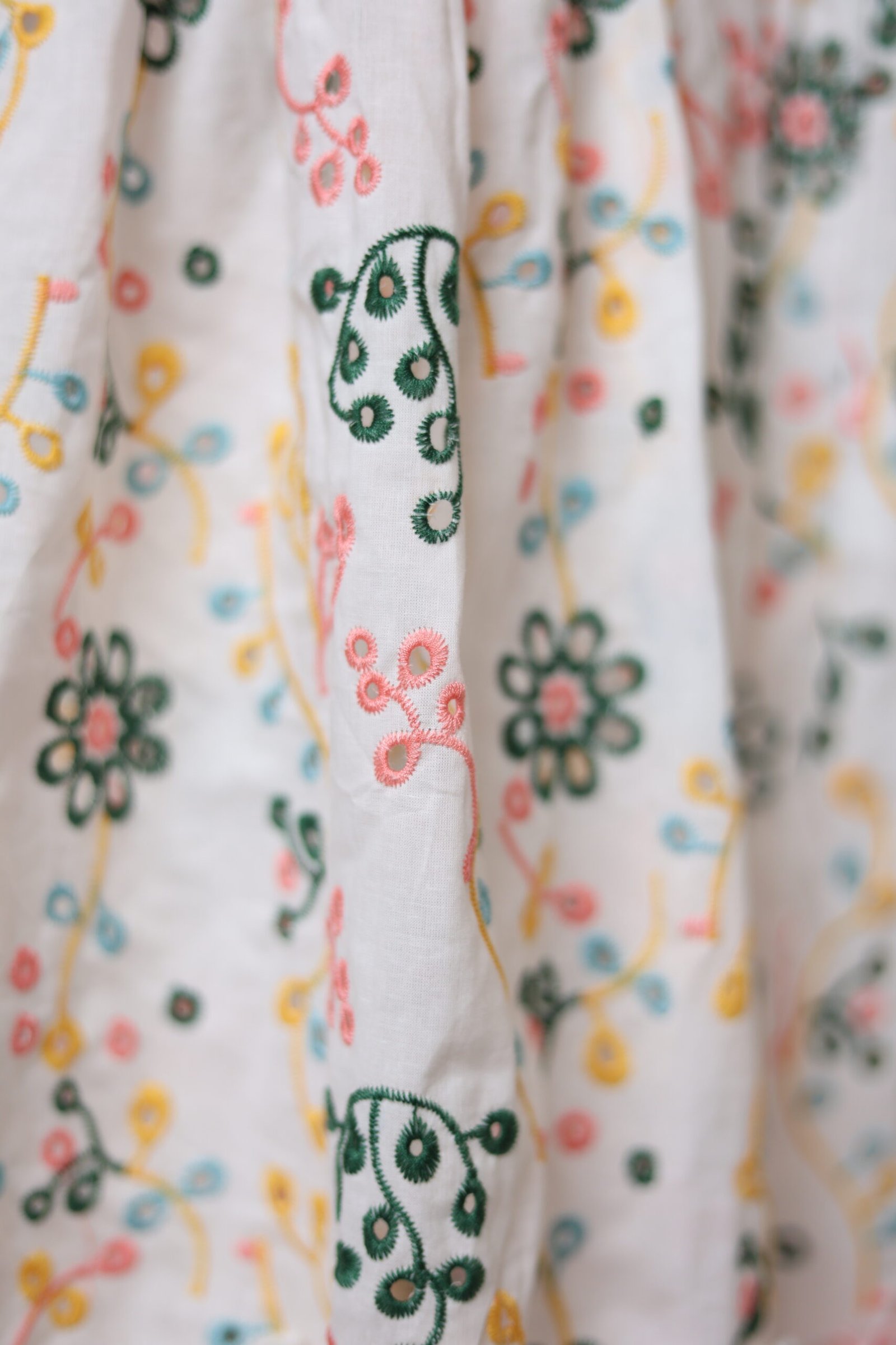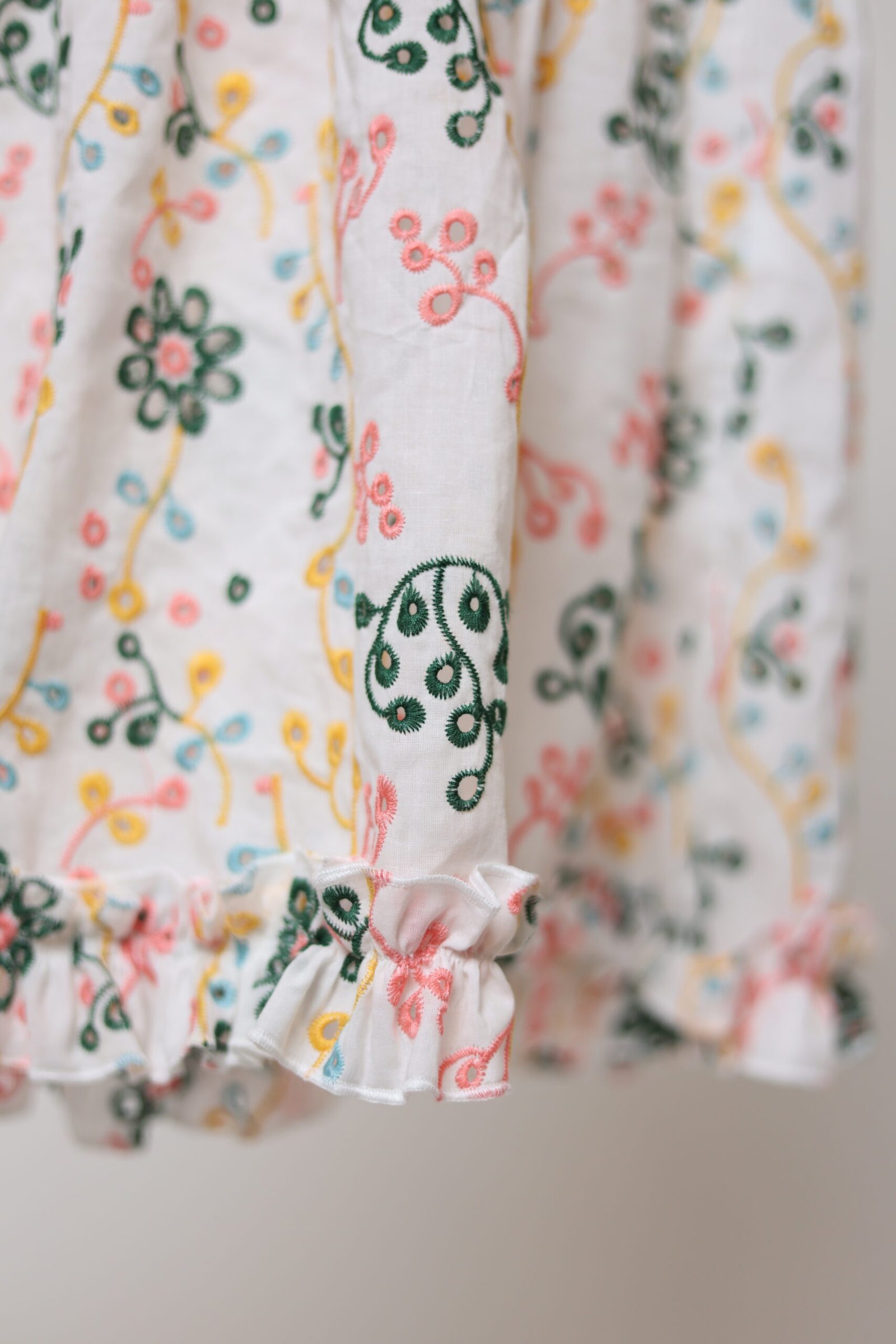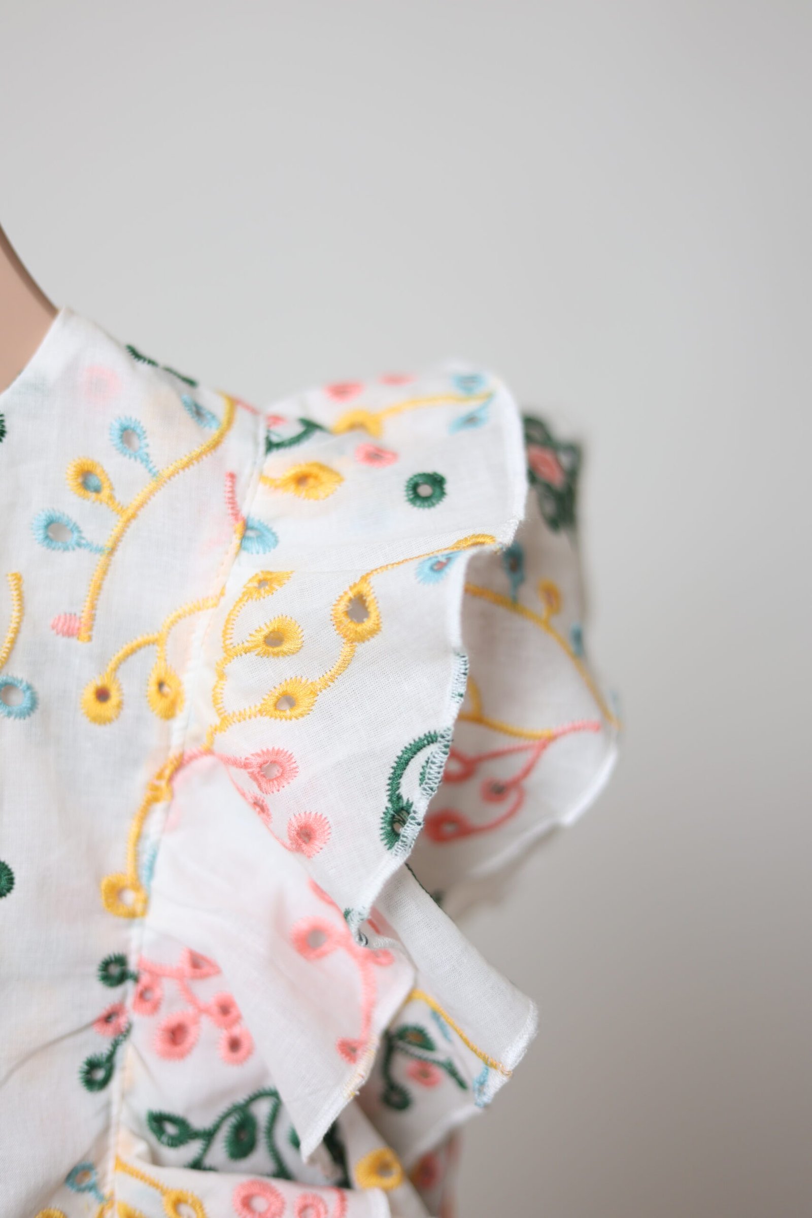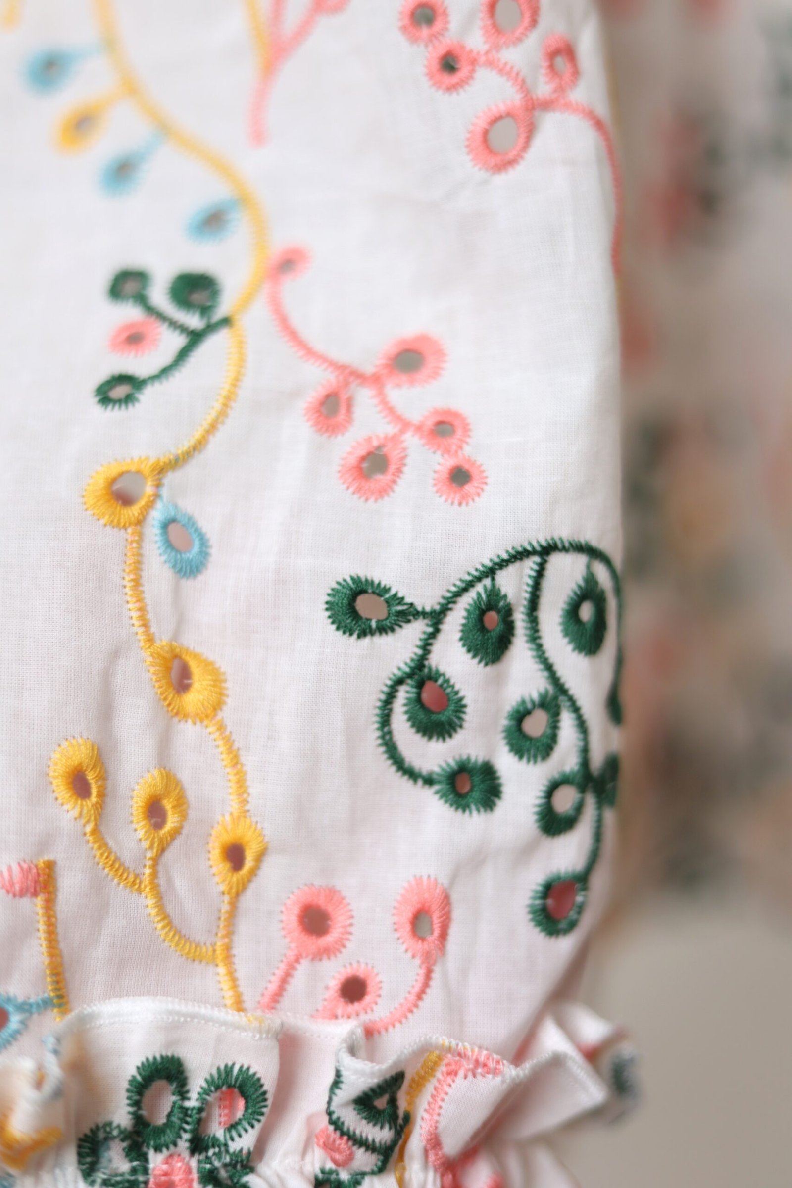 Laisvo modelio suknelė su lengvomis raukinukų rankovėmis, dailiai krintančiomis užsidėjus. Rišama nugaroje, apačioje – raukinukas. Sukonstruota taip, jog būtų tinkama ir nešiojama ne vienam dydžiui – nuo midi ilgio iki trumpesnės, tačiau taip pat lengvai ir laisvai krintančios, augančios kartu su mergaite. Pasiūta iš labai žavios siuvinėtos medvilnės audinio.
