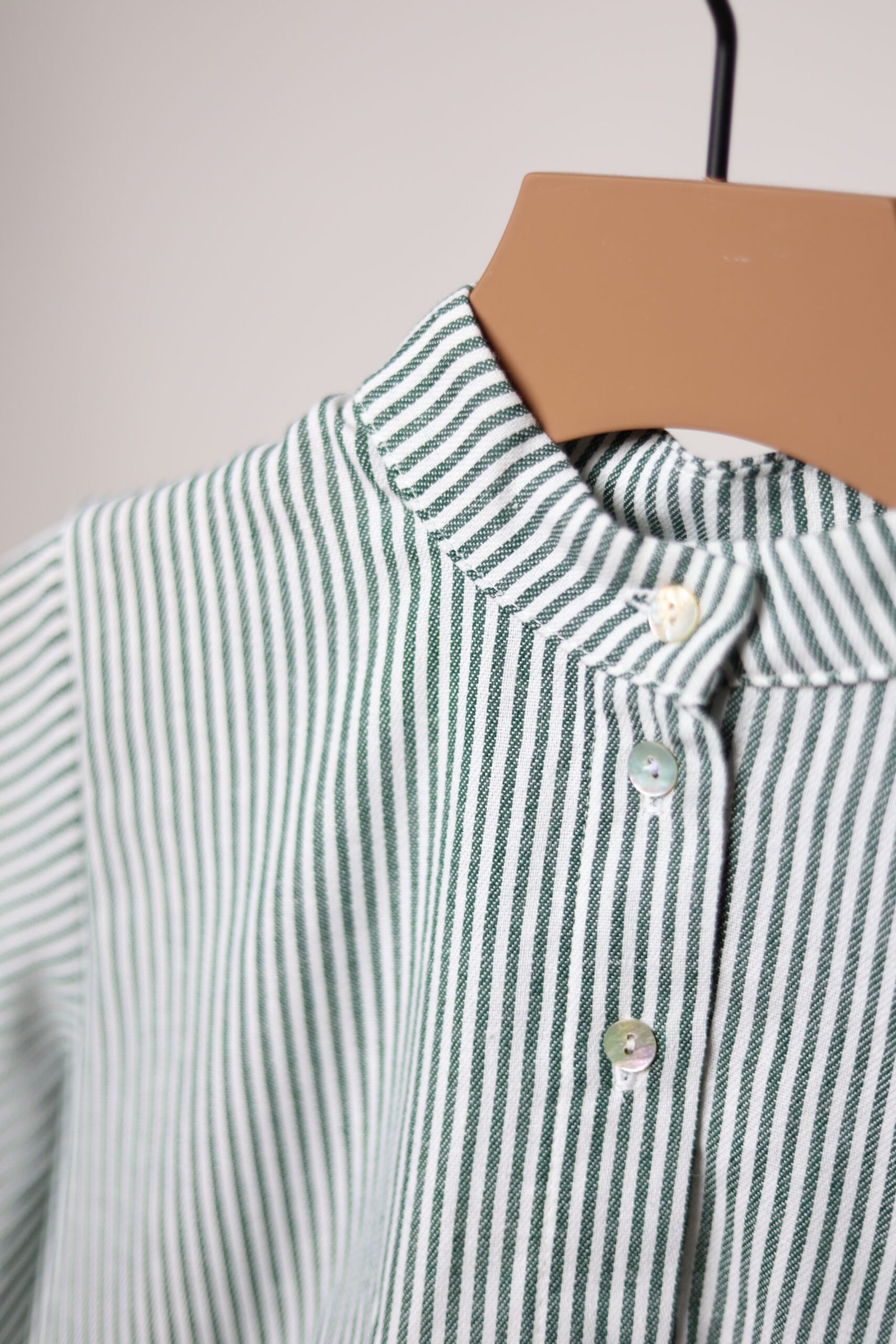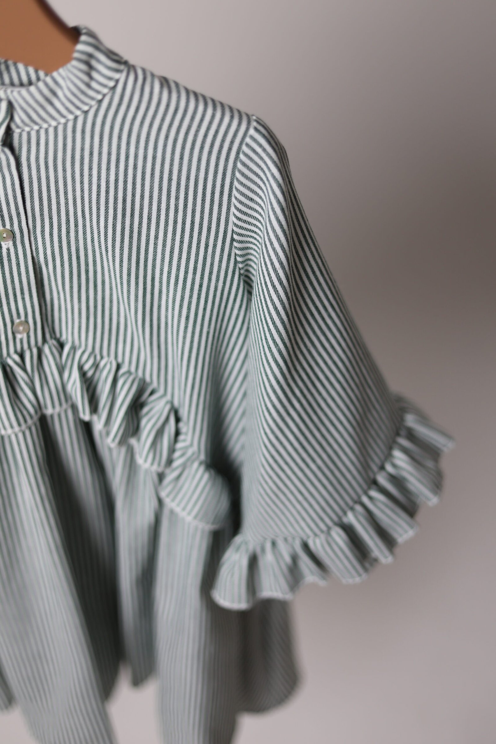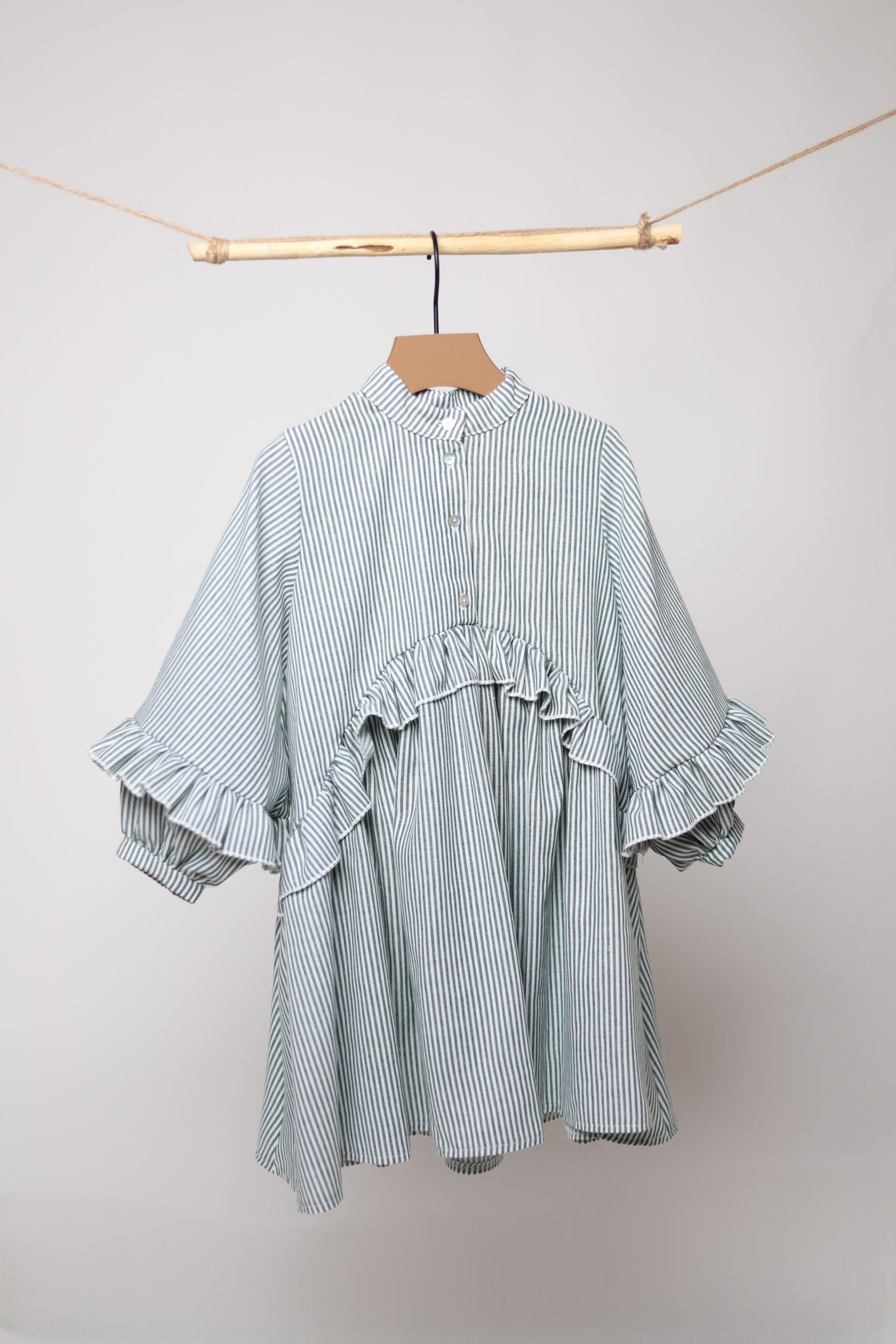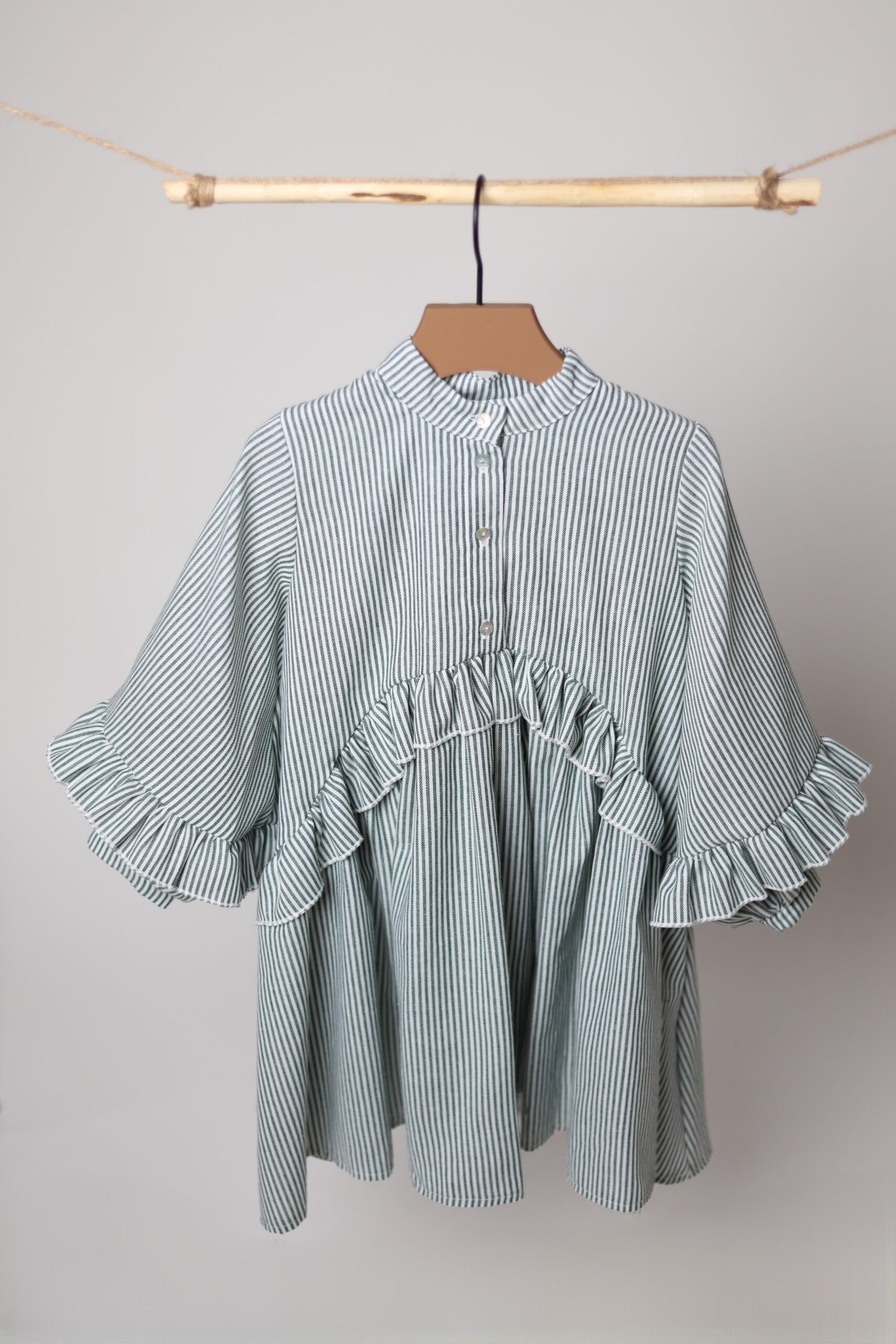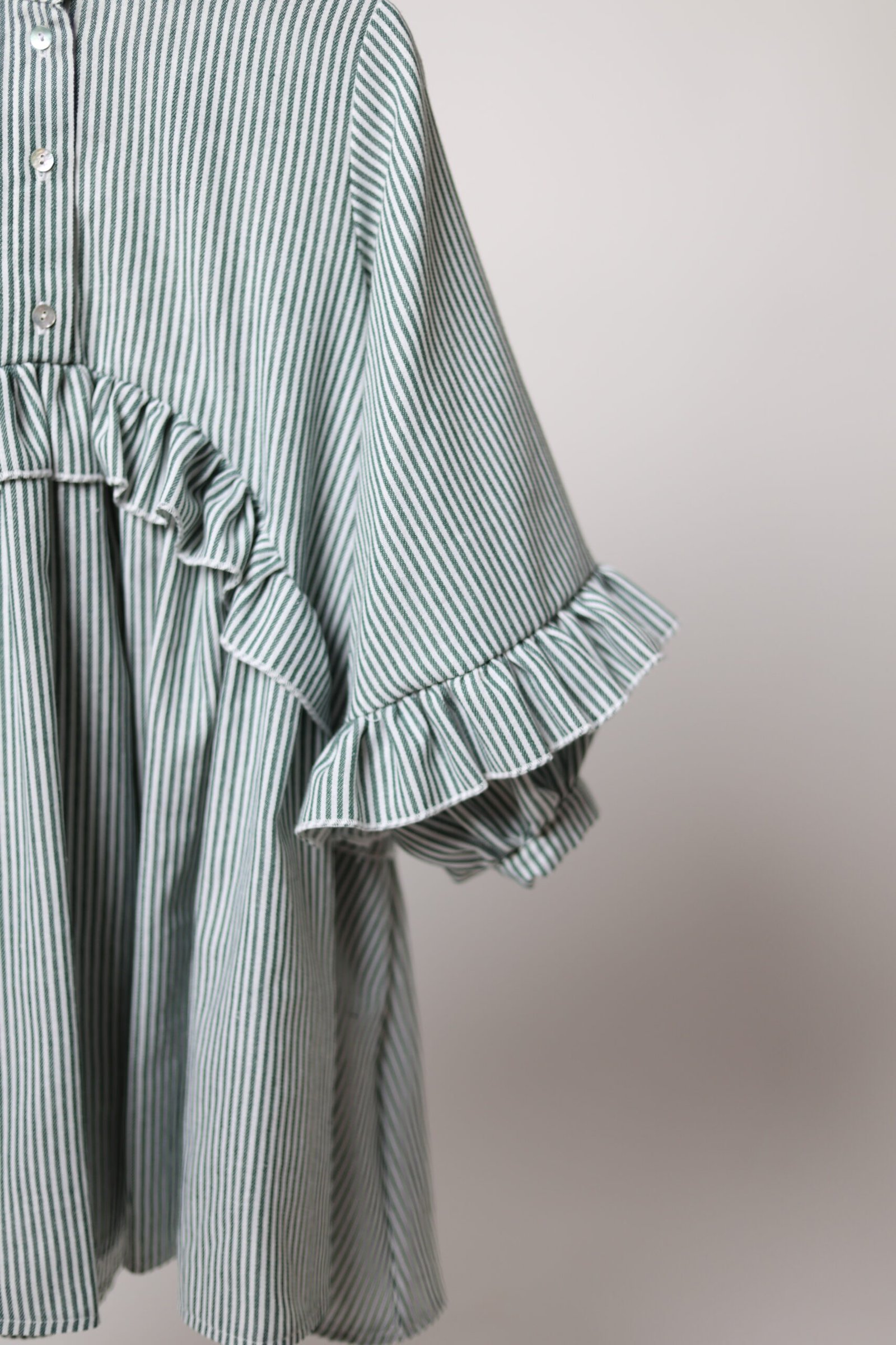 Laisvai krintanti suknelė su raukinukais priekyje, nugaroje bei ant rankovių. Užsegama kriauklinėmis sagutėmis priekyje ir rankovių galuose.