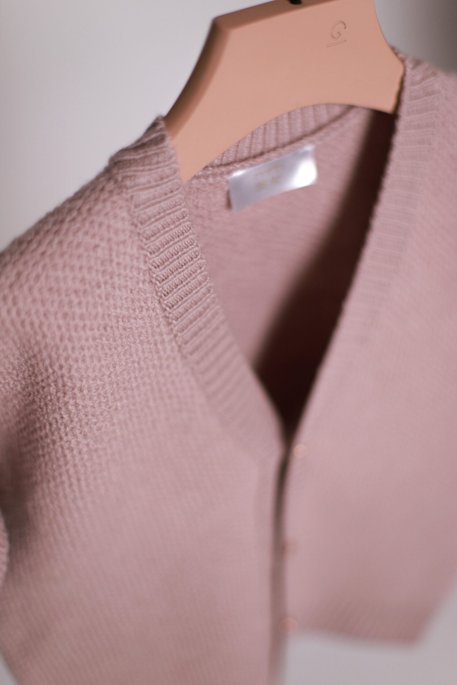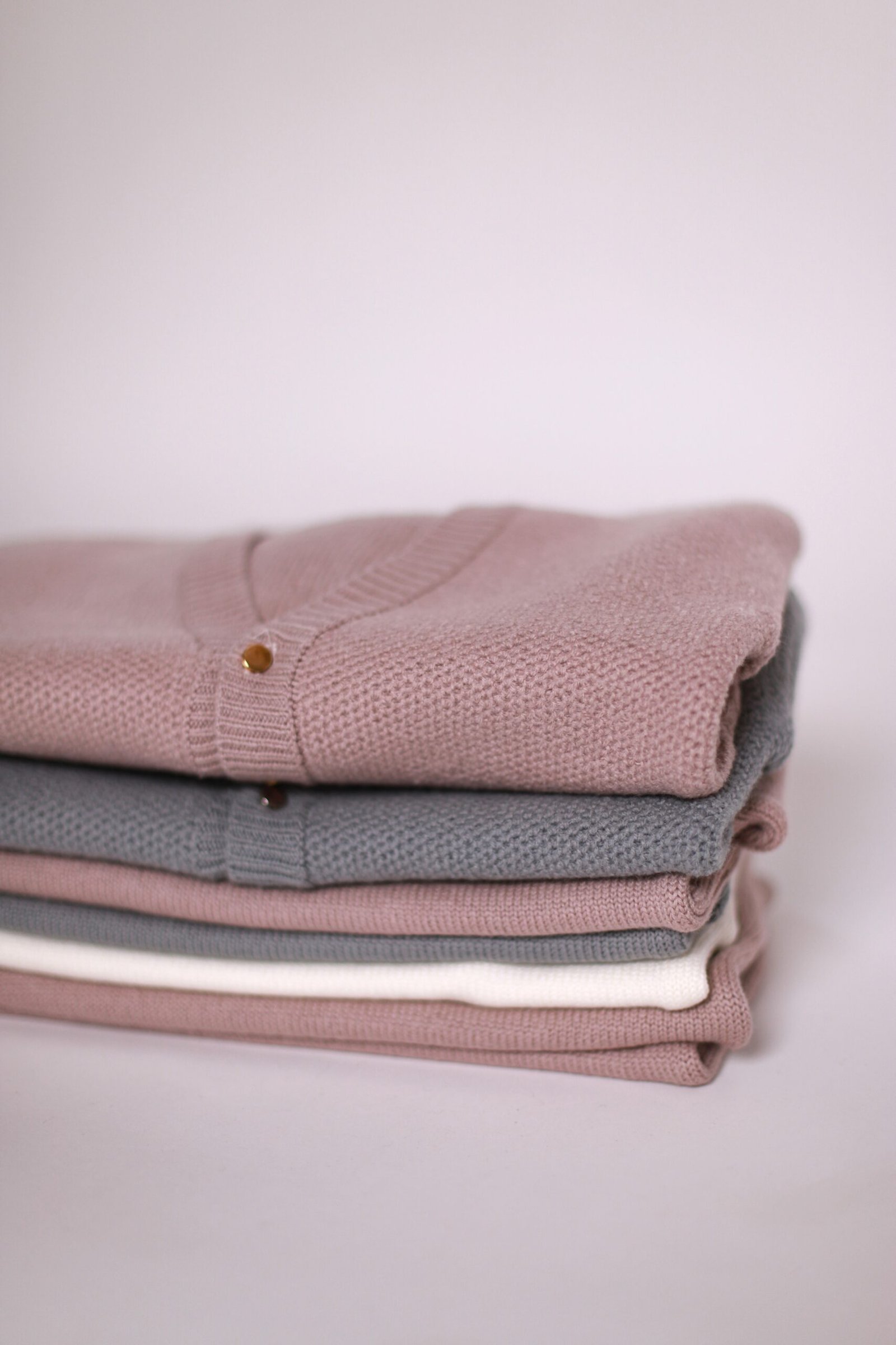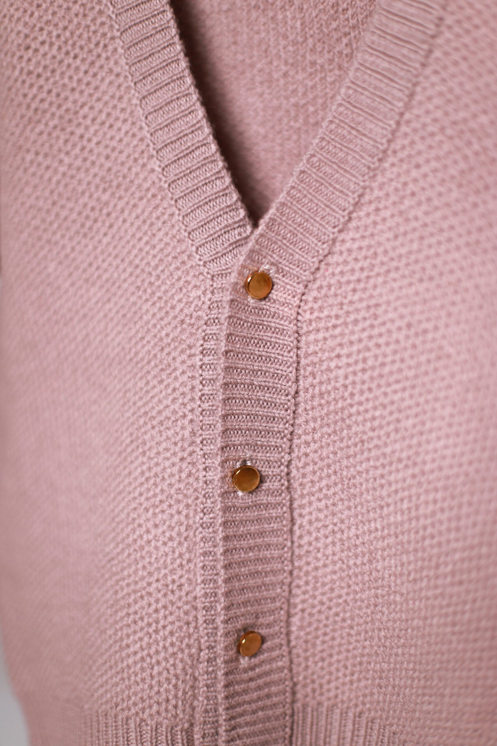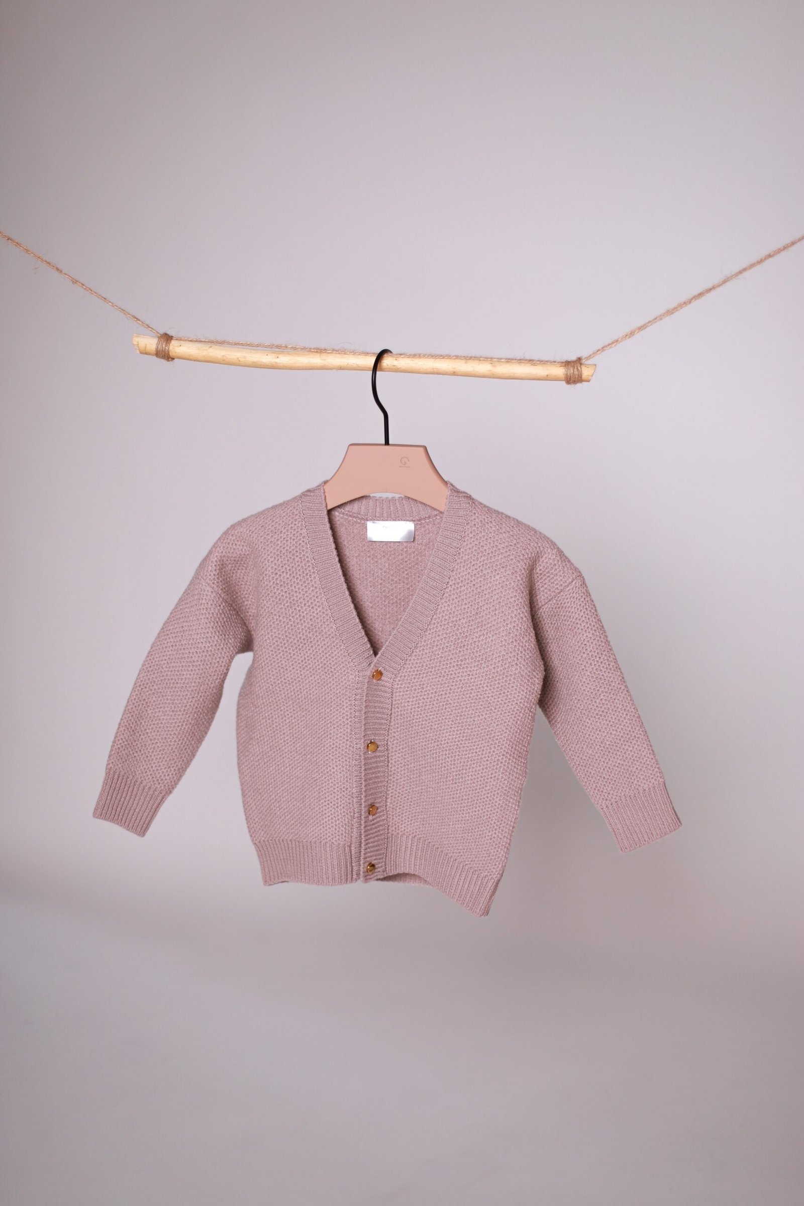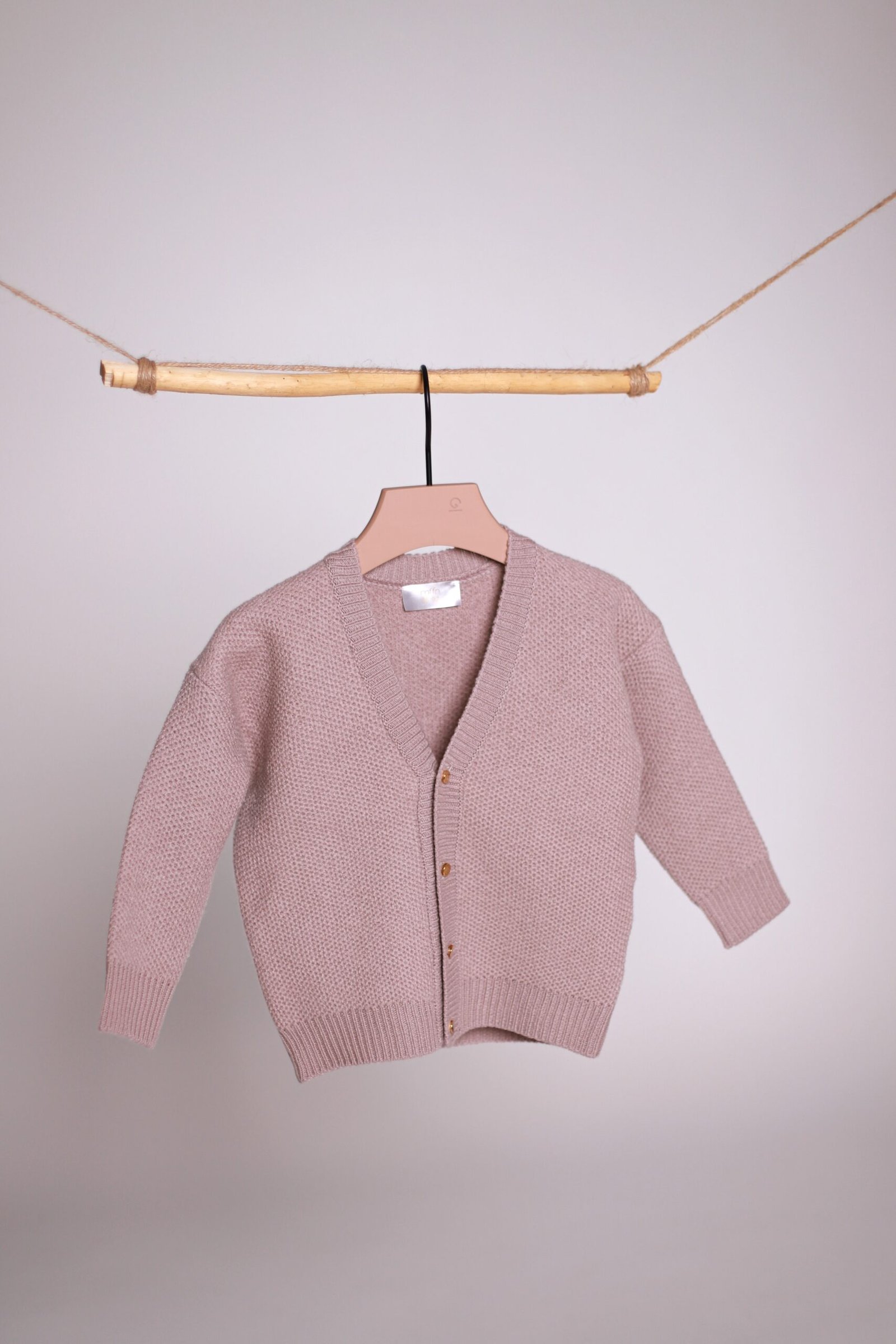 Merino vilnos megztinis, susagstomas keturiomis aukso spalvos sagutėmis. Puikiai tiks vaikams, kurie labai nemėgsta, kuomet reikia rengtis per galvytę. Pagamintas iš ypatingai švelnių, aukščiausios kokybės itališkų merino vilnos siūlų. Tinkamas visais metų laikais – tiek kiek vėsesniais vakarais, tiek šaltomis žiemomis. Merino vilna šildo, tačiau neperkaitina, yra pralaidi orui, pasižymi antibakterinėmis savybėmis.